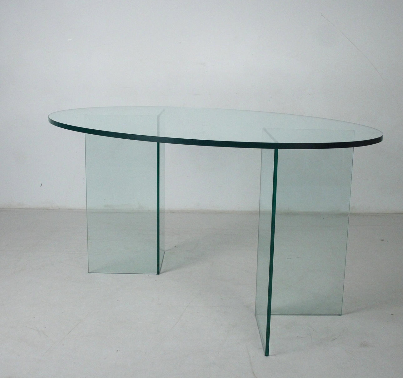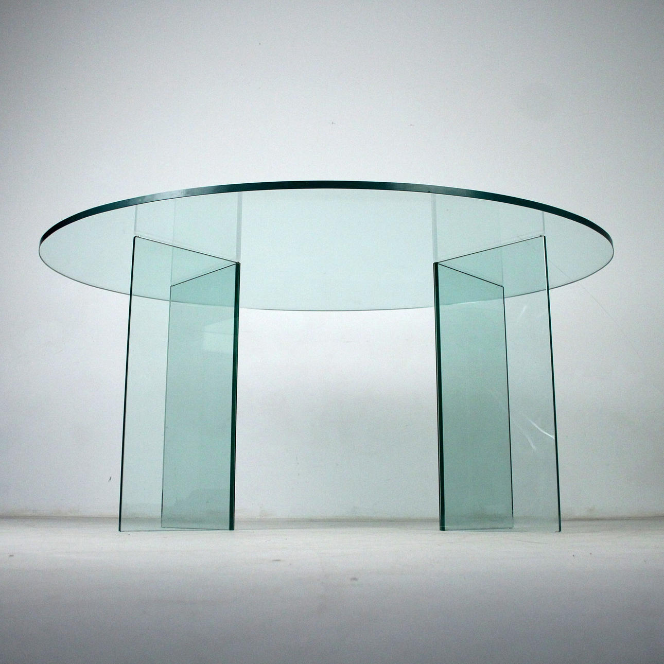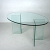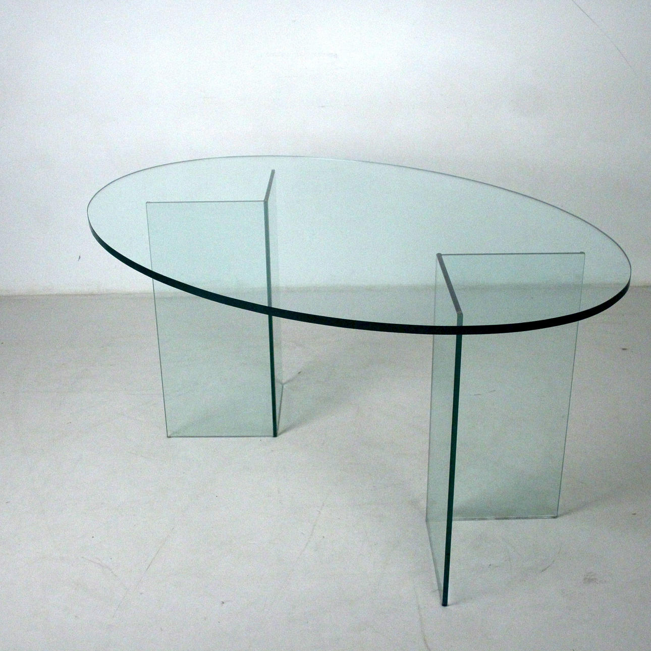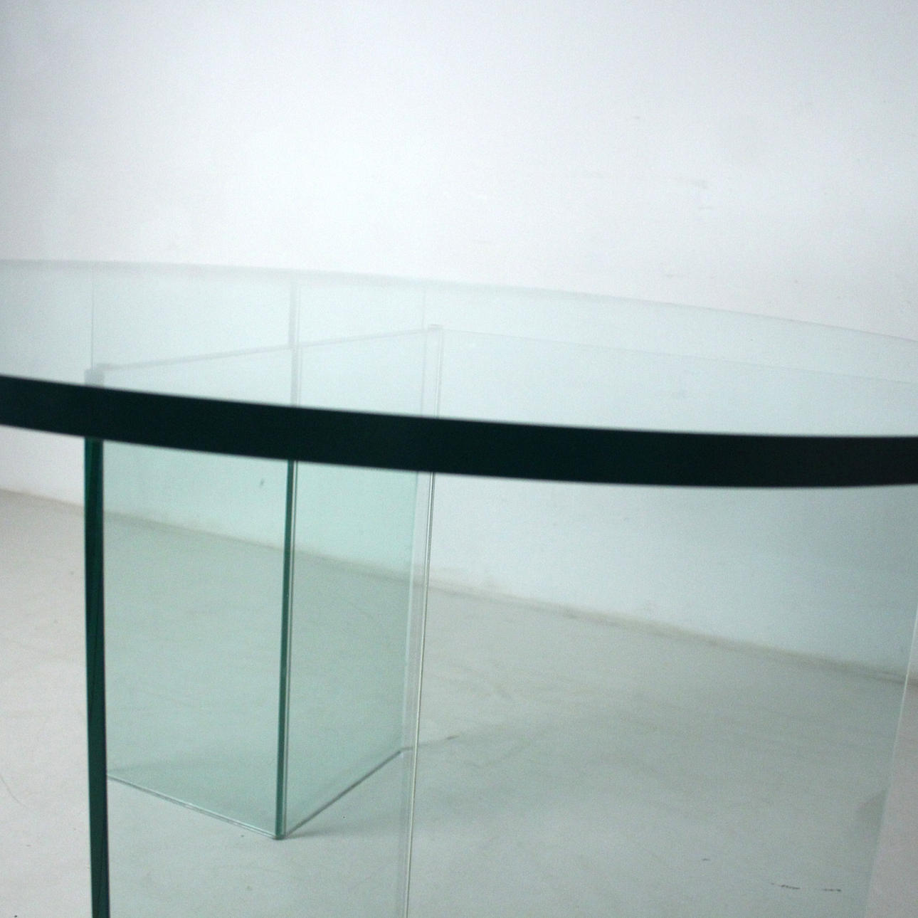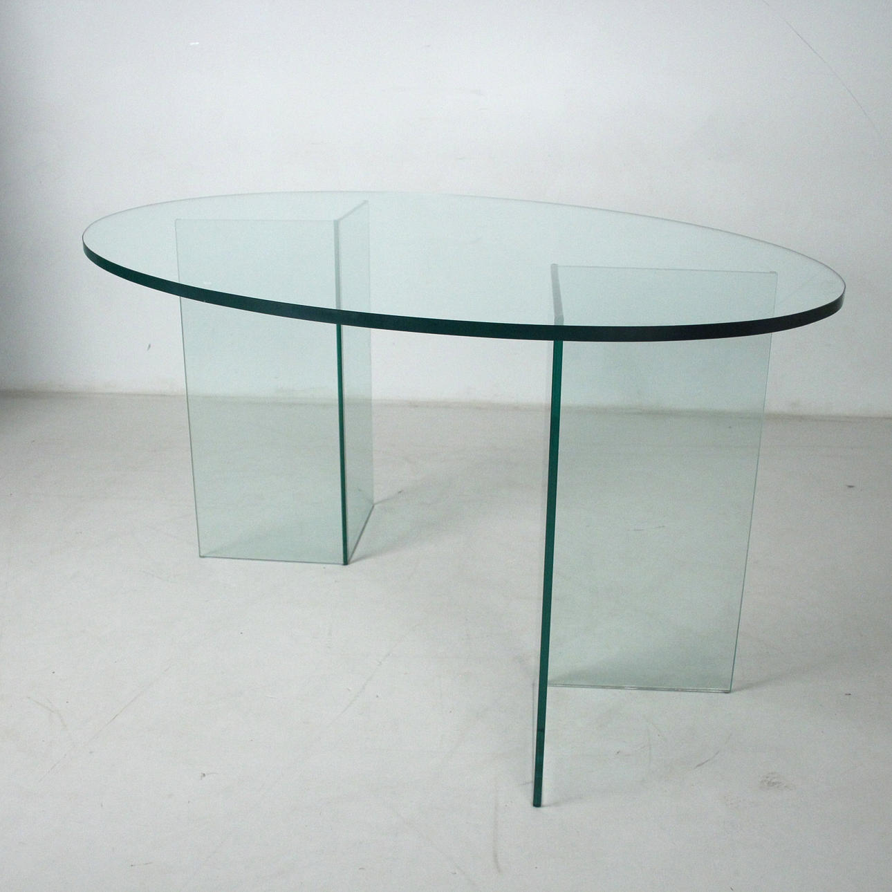 Glass table dining table from the 1970s/80s. V-shaped table frames with loose, oval glass top. Height: 76.5 cm, width: 160 cm, depth: 110 cm. The chairs shown are for size comparison only and are not part of the auction.