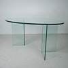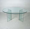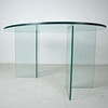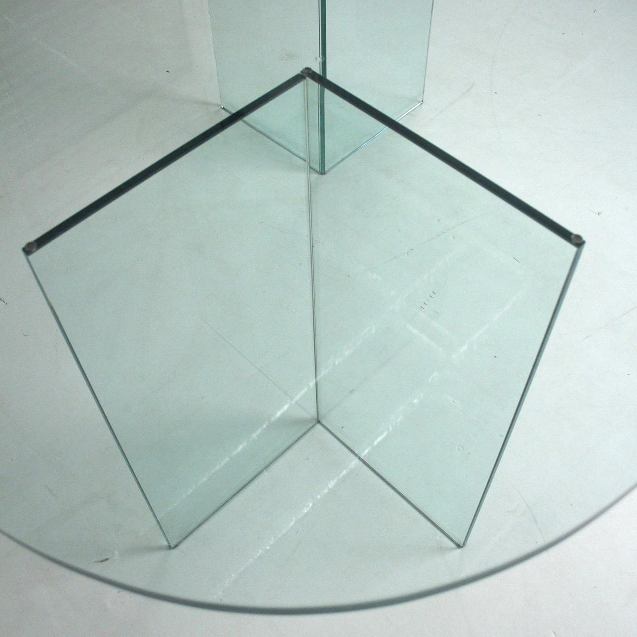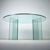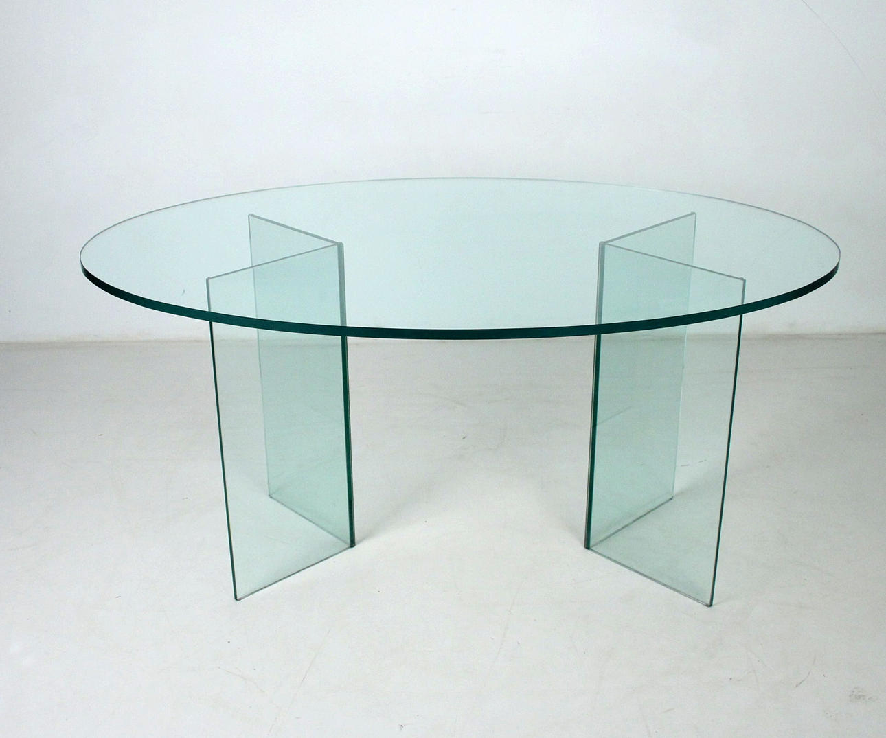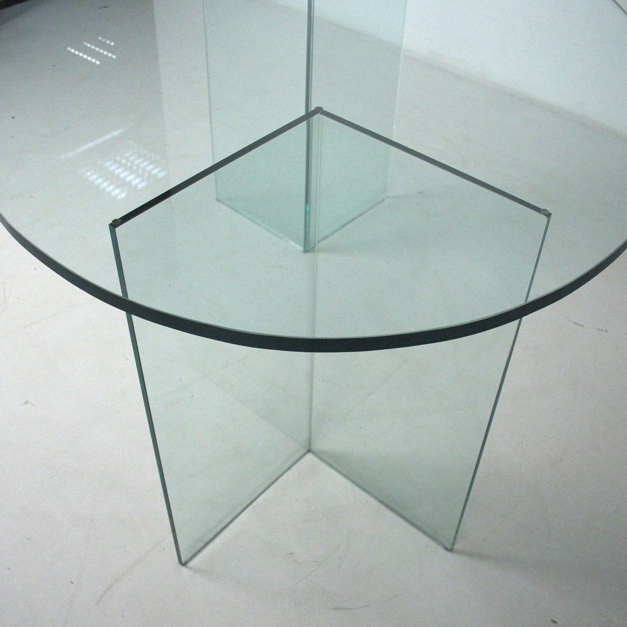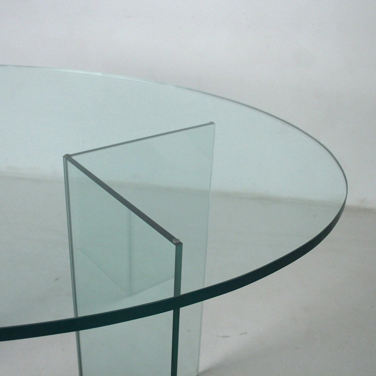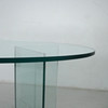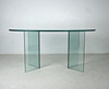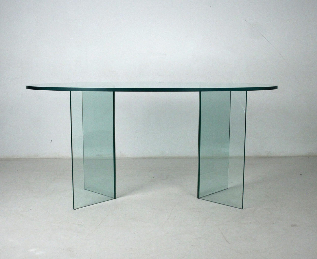 Glass table dining table from the 1970s/80s. V-shaped table frames with loose, oval glass top. Height: 76.5 cm, width: 160 cm, depth: 110 cm. The chairs shown are for size comparison only and are not part of the auction.