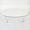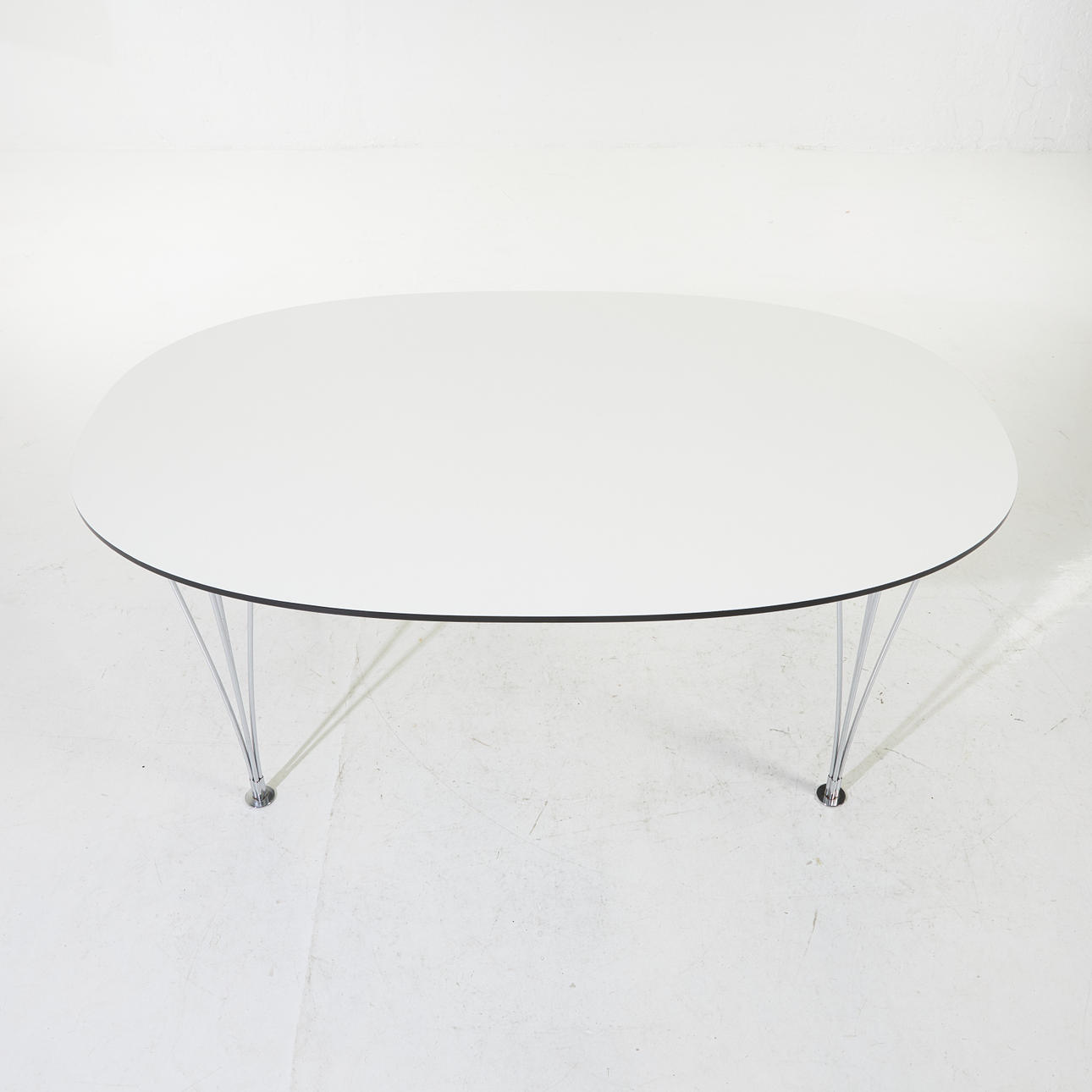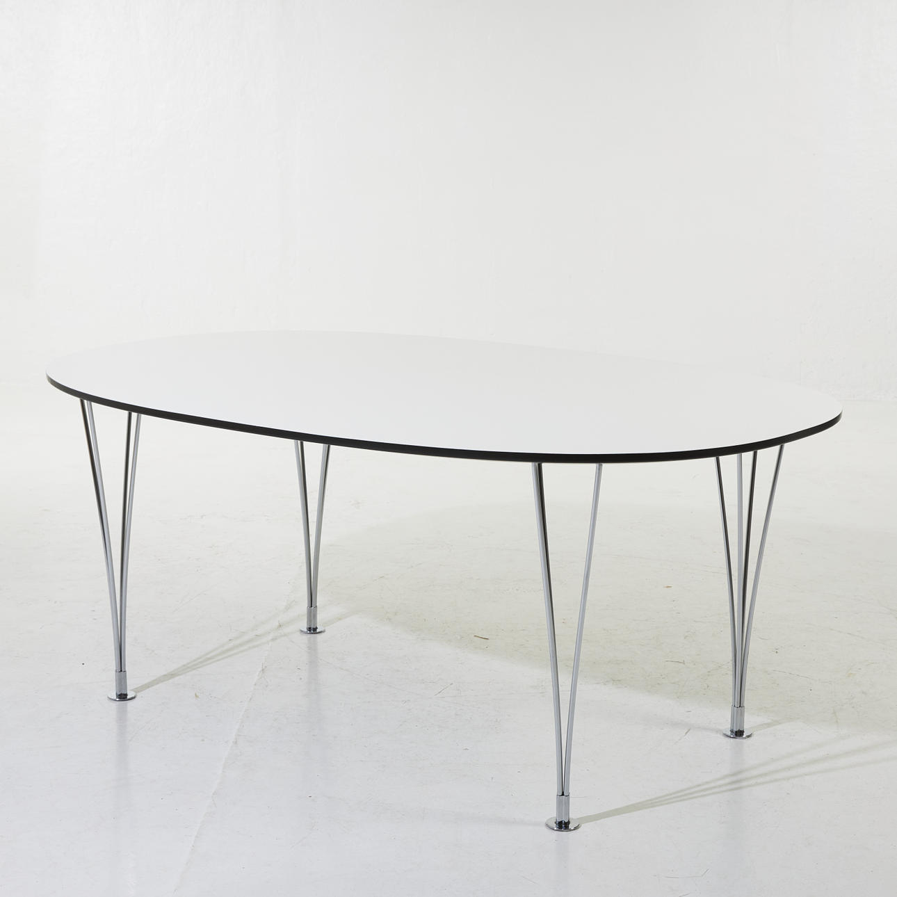 BRUNO MATHSSON. Superellips", dining table, Mathsson International, white lacquered top, 4 chrome legs, black edge, label marked "PIET HEIN BRUNO MATHSSON" as well. "BRUNO MATHSSON INTERNATIONAL MADE IN VÄRNAMO SWEDEN.
