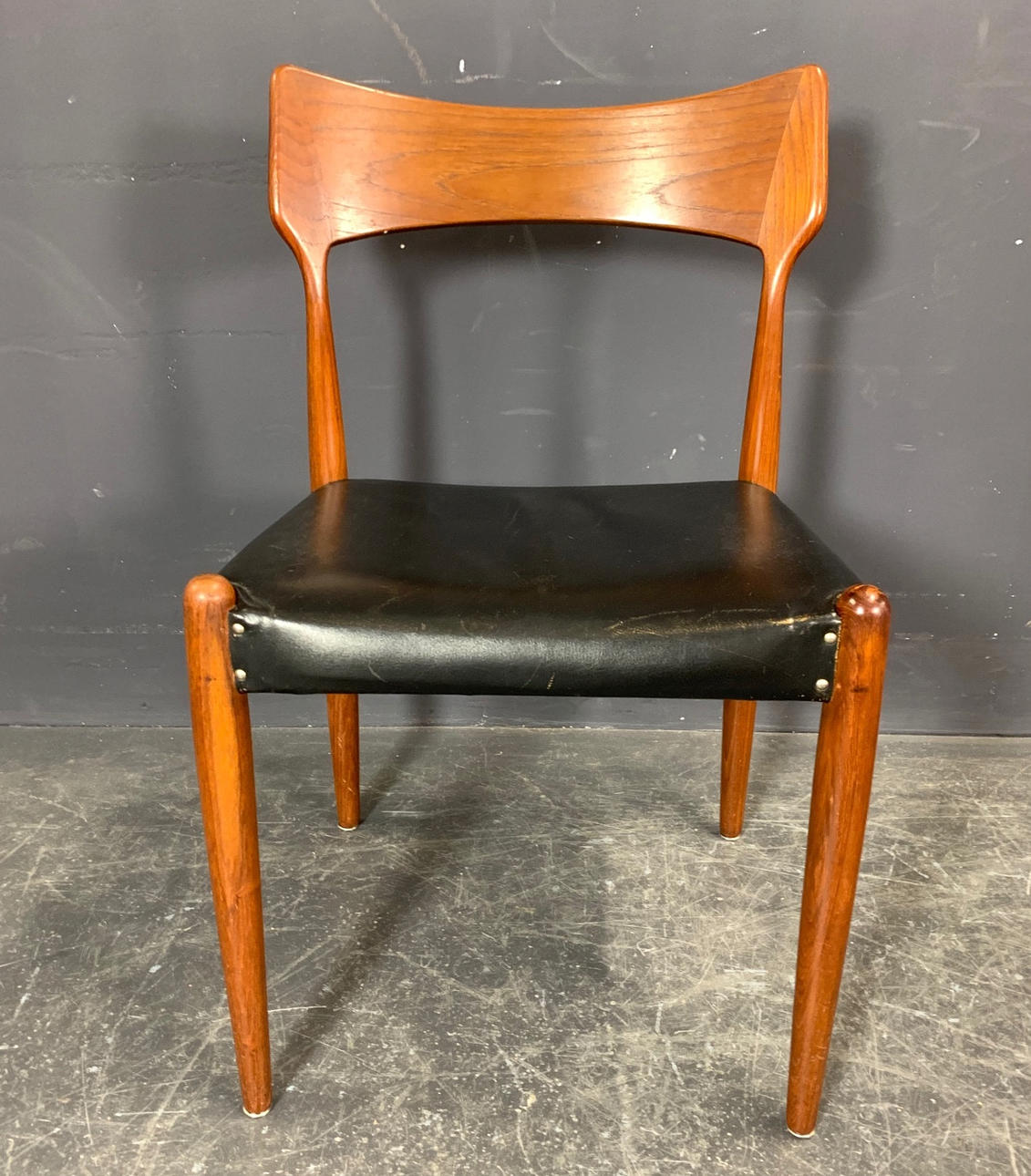 Teak with upholstered seat, upholstery in black leather.