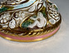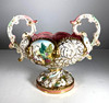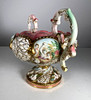 Porcelain body with large overhanging handles. Figures in relief, polychrome painted. Manufactory mark on the underside. Height 32.7 cm, width 46 cm, depth 33 cm.
