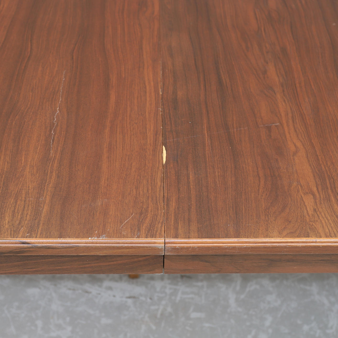 Walnut. Three insert plates of 58 cm. Branded. Length 154. Width 102. Height 74 cm.