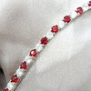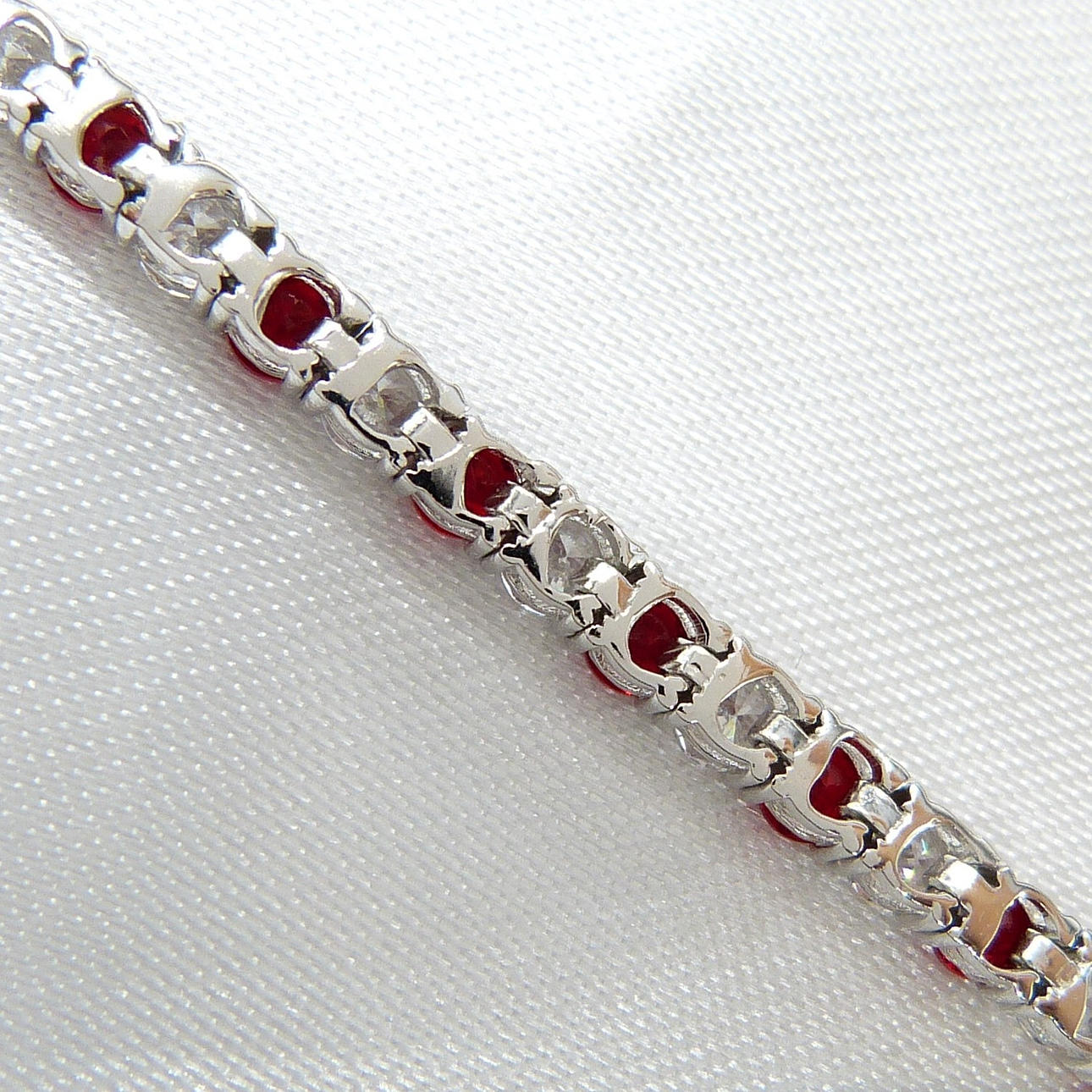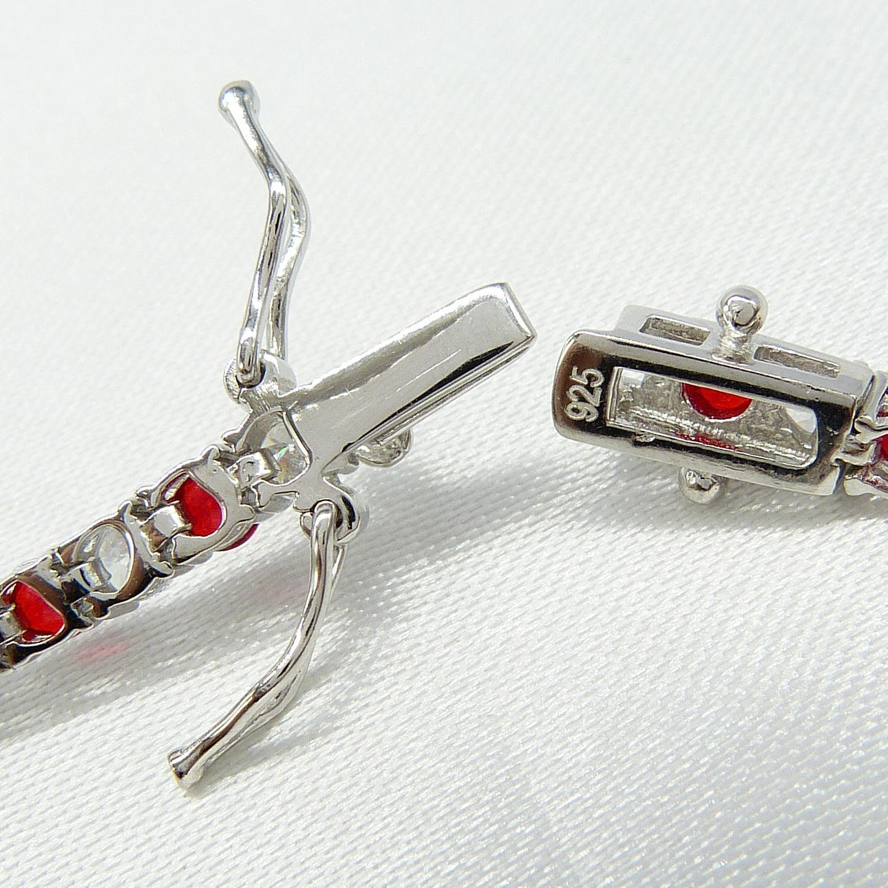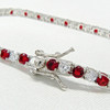 27 red and 27 white cubic zirconia are 4-claw set to this bracelet. The stones each measure 3 mm in diameter.