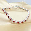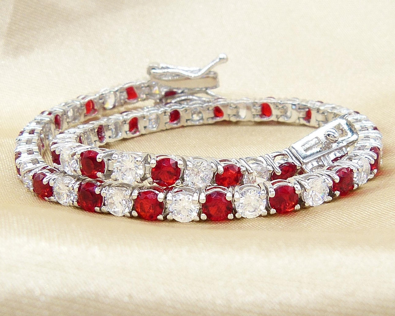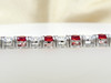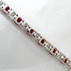A silver bracelet alternately set with red and white round-cut cubic zirconia stones.