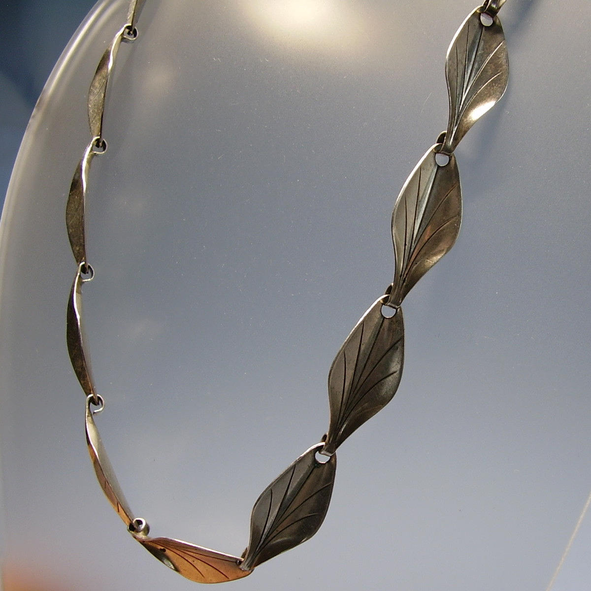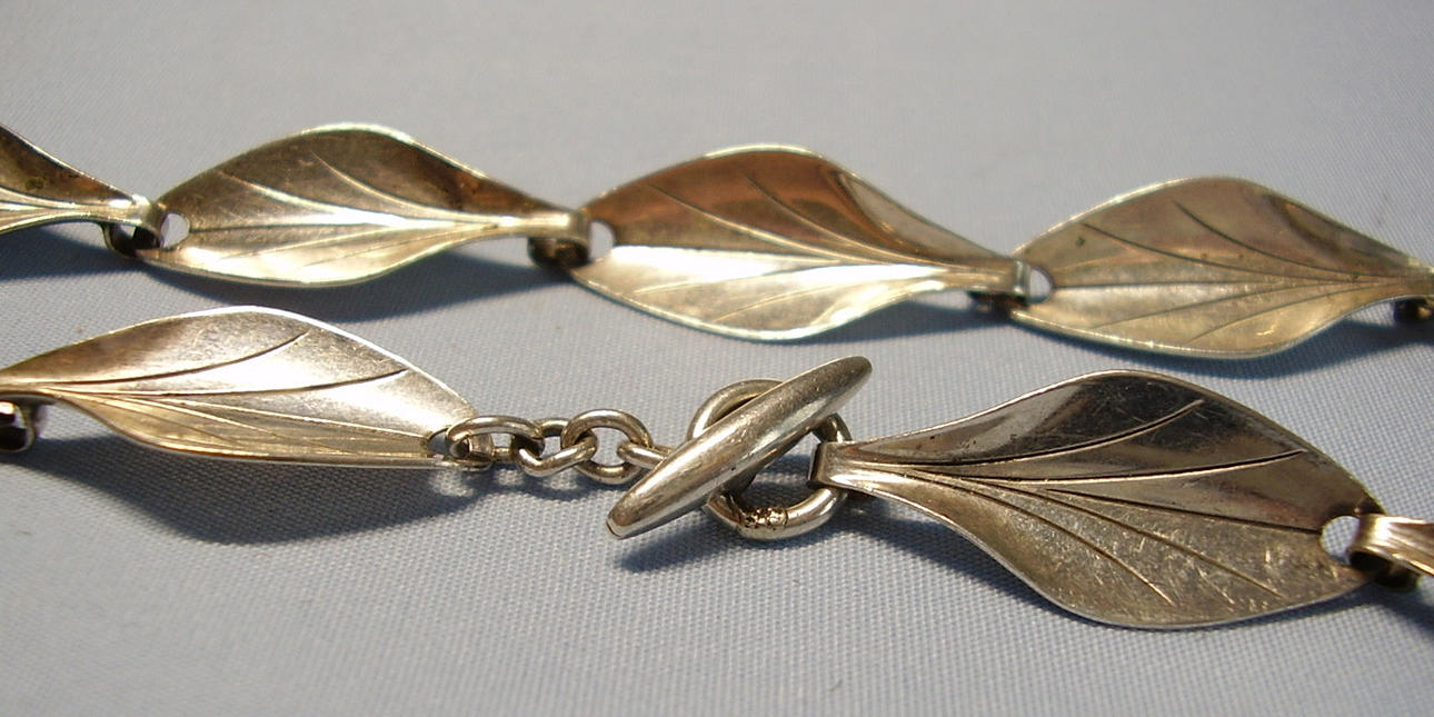 It consists of 14 leaf-shaped links that are movably connected to each other by integrated eyelets. All links are lanceolate and slightly curved, showing the engraved leaf blades and veins.