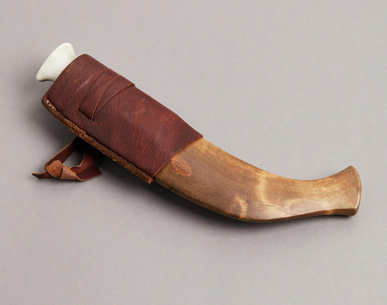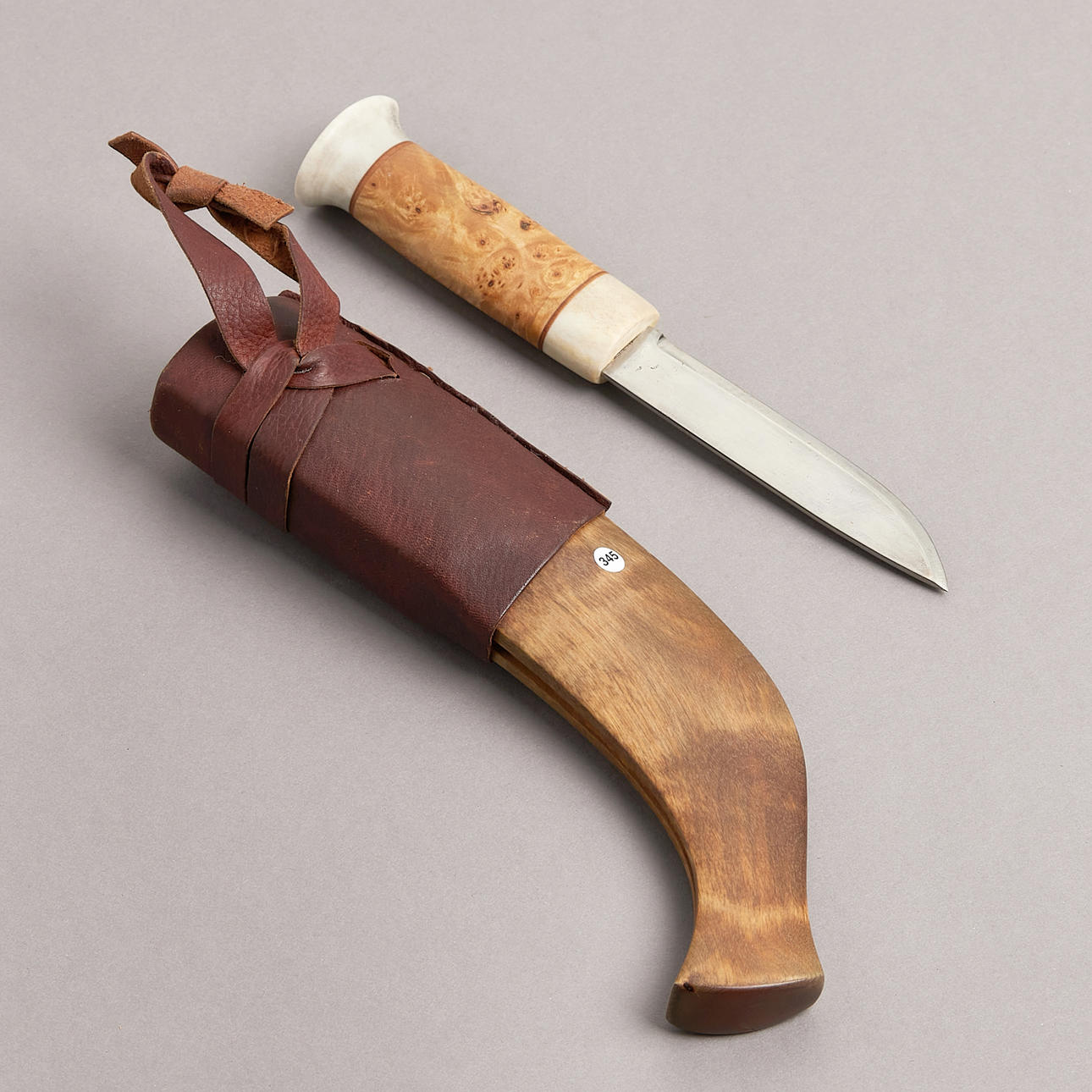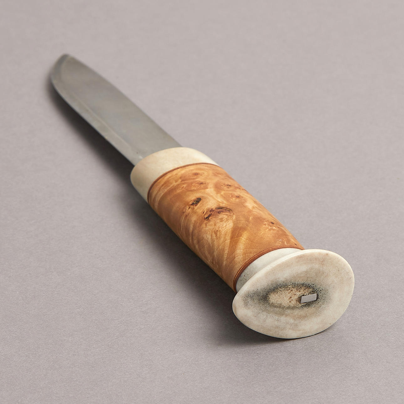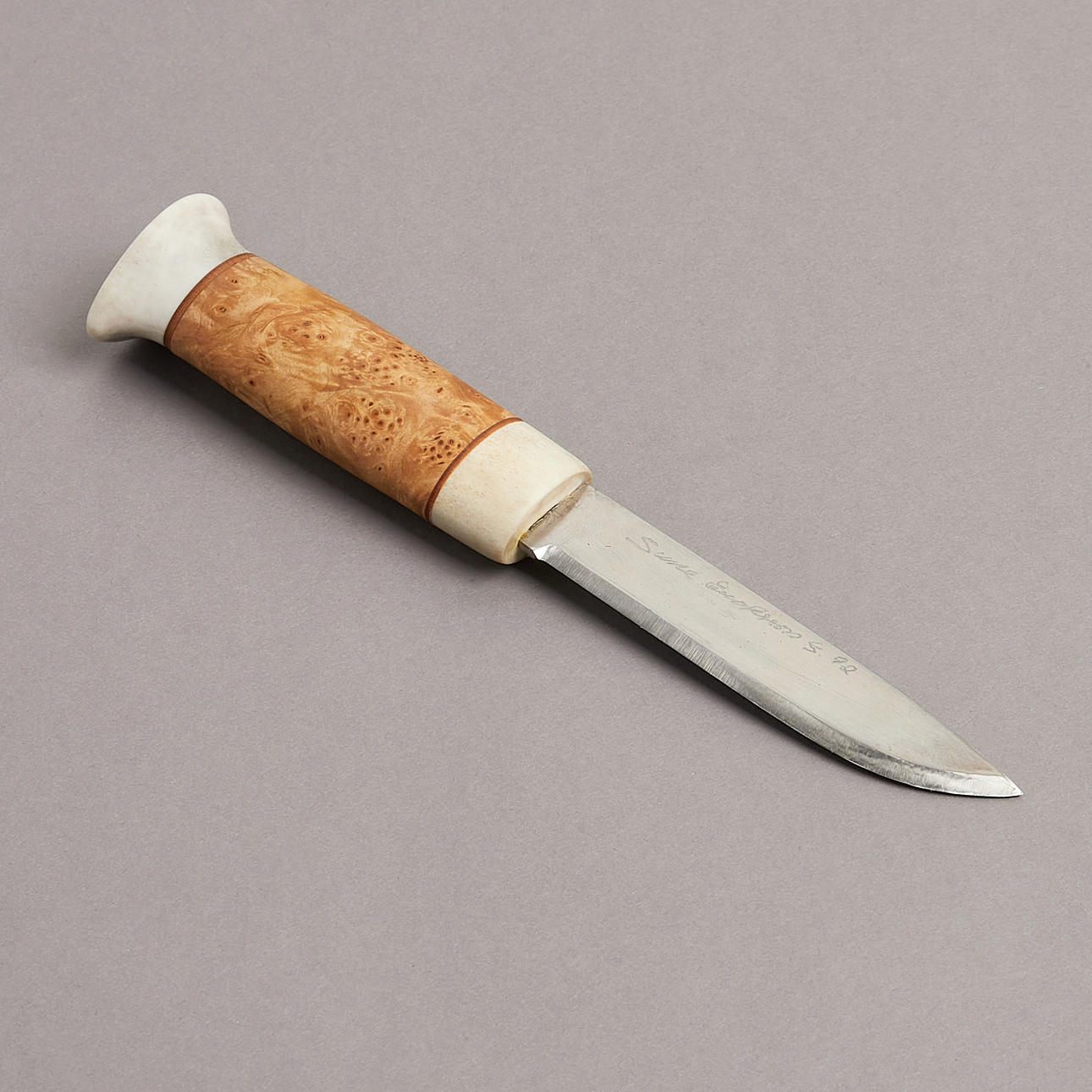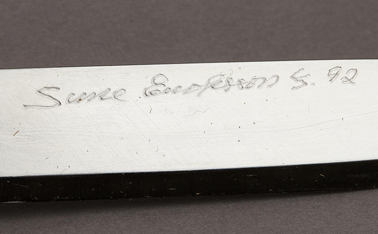 Sami knife, monogram signed, handle with horn and masur birch, blade signed and dated 92, length 24 cm.