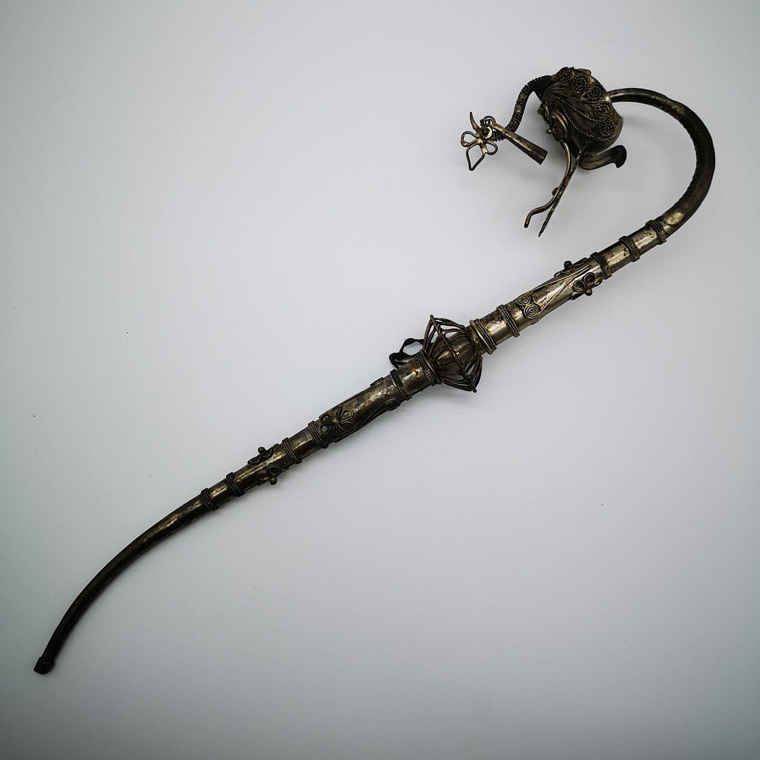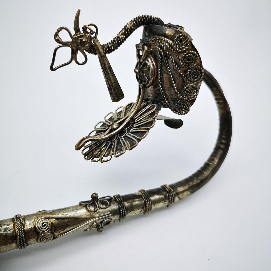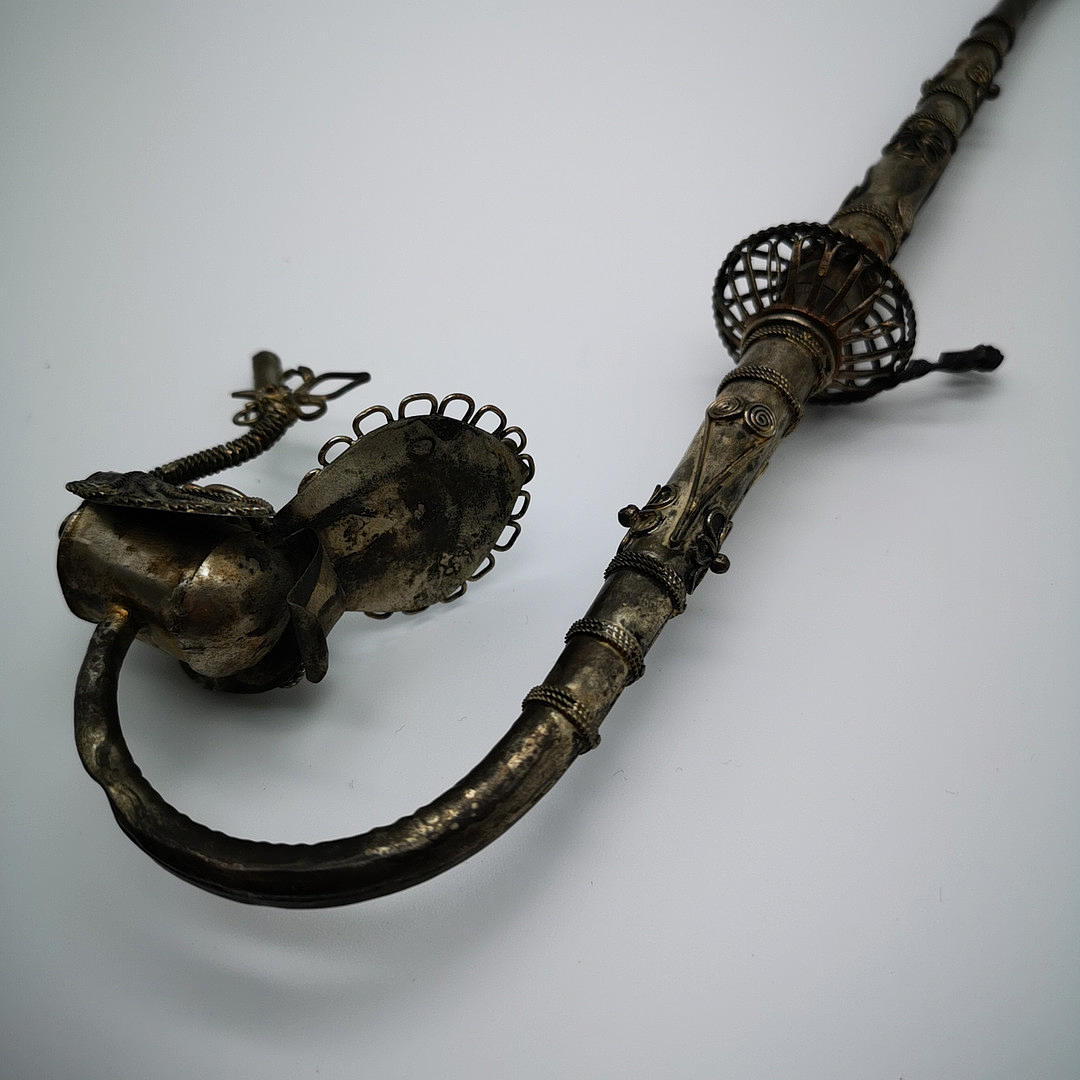 Oriental opium pipe with peacock motif, ritual object probably China 19th century. JH ornate white metal, copper, brass and silver alloy pipe bowl with a peacock motif, stem decorated with flowers, spirals and bands.