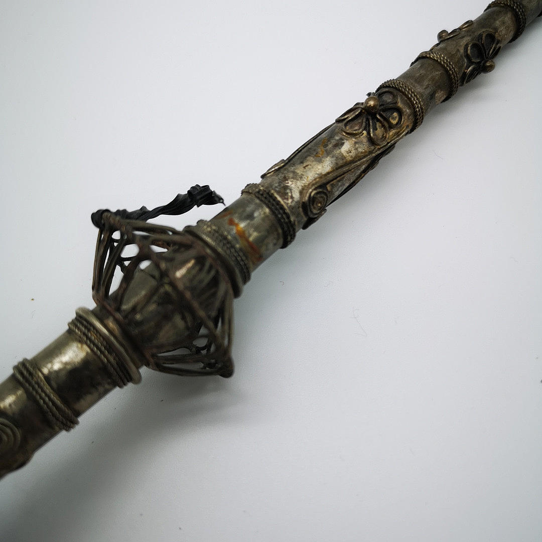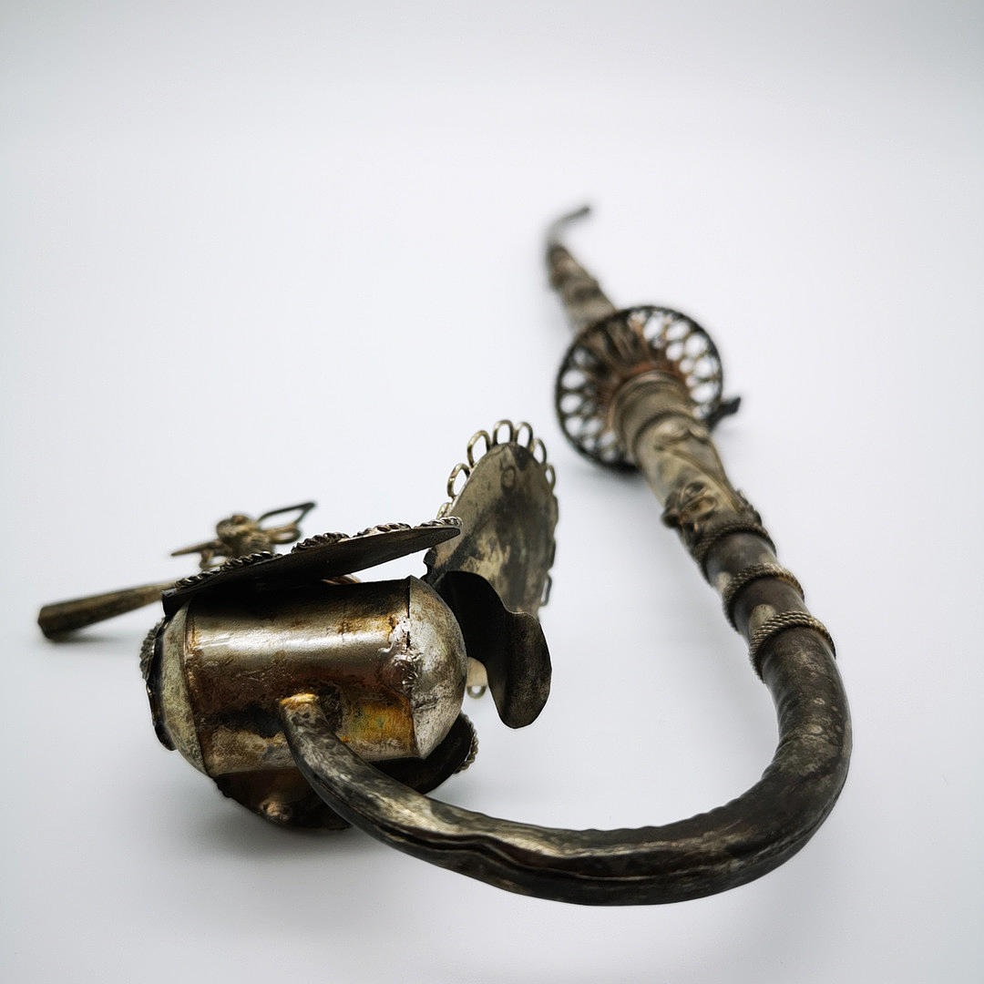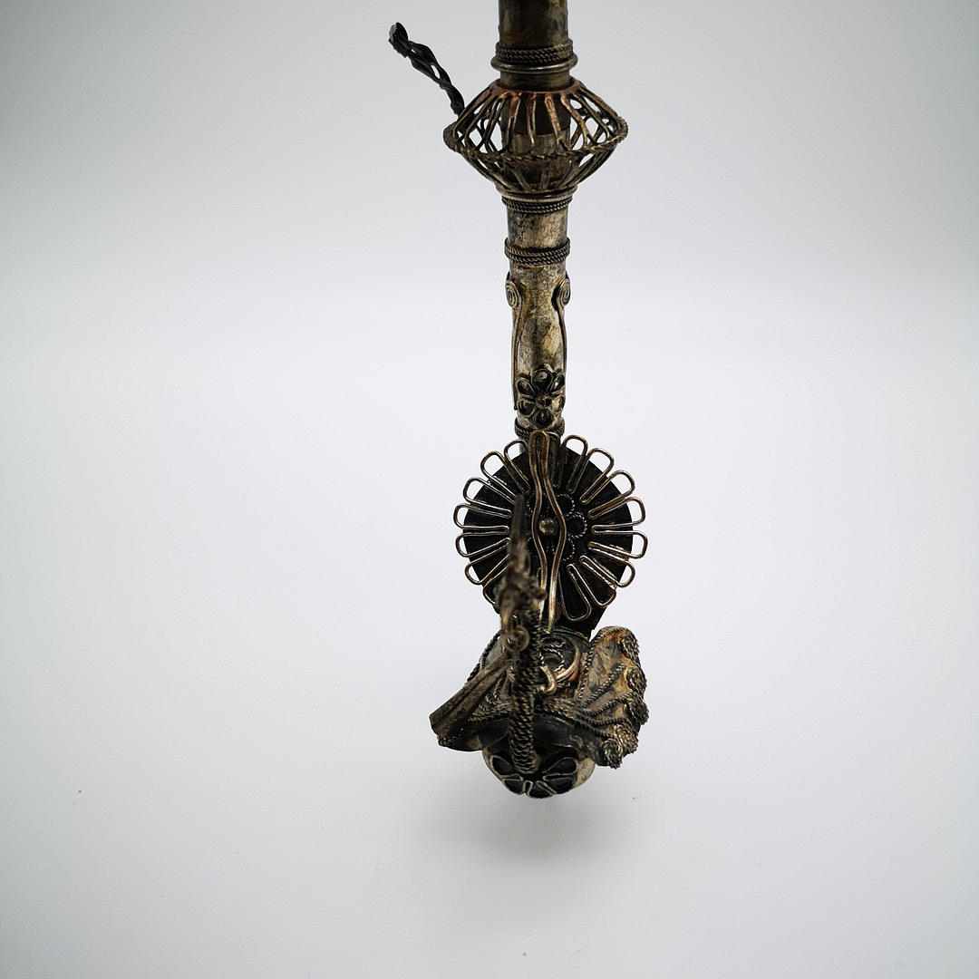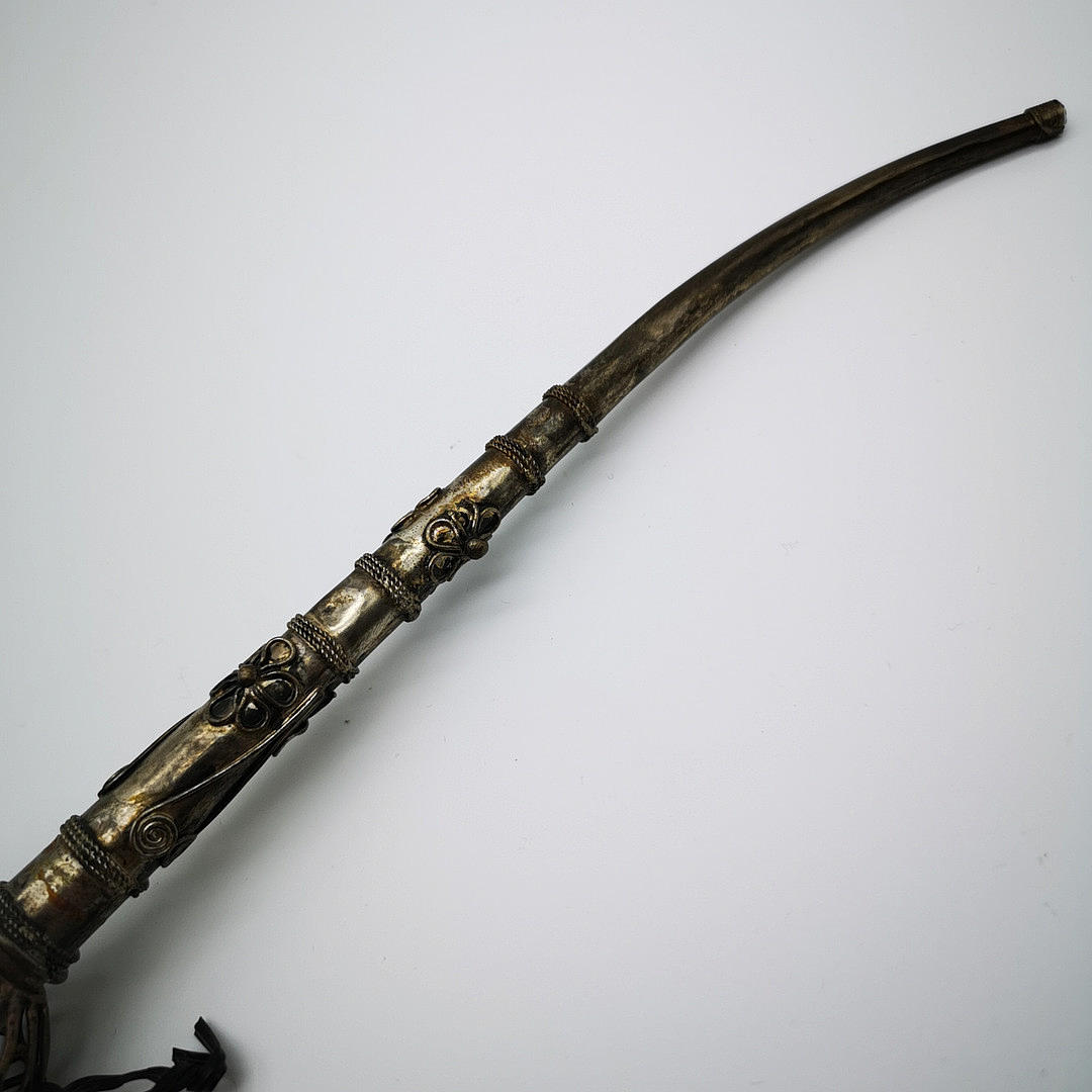 Oriental opium pipe with peacock motif, ritual object probably China 19th century. JH ornate white metal, copper, brass and silver alloy pipe bowl with a peacock motif, stem decorated with flowers, spirals and bands.