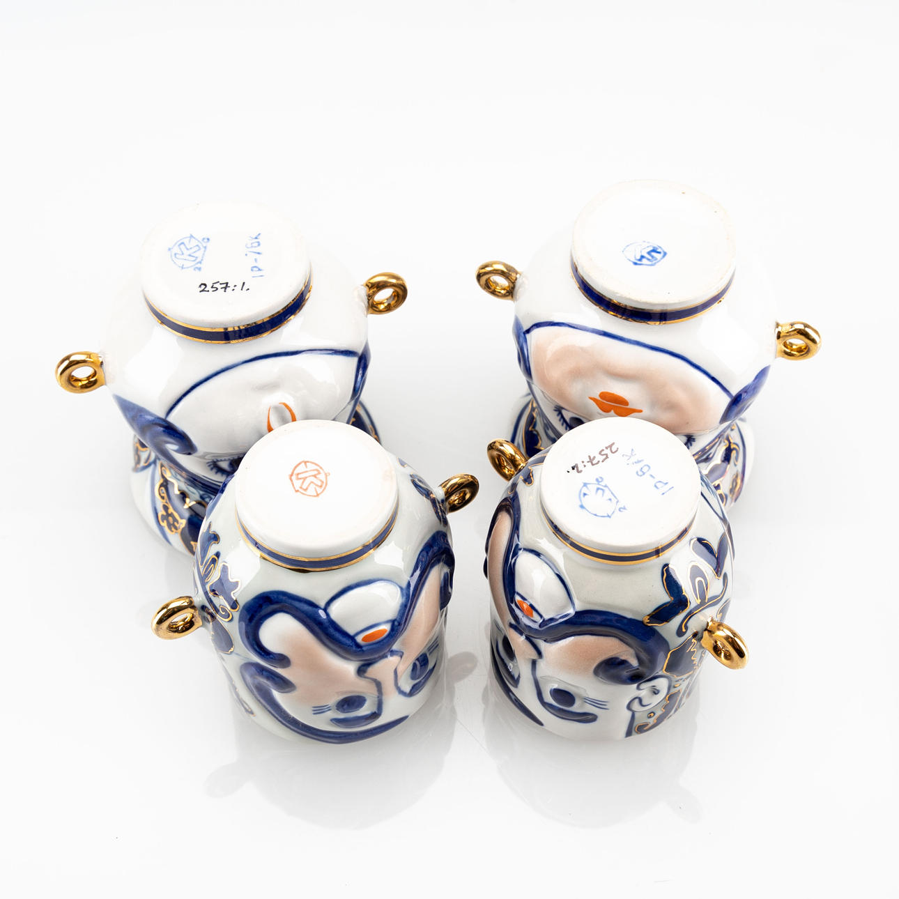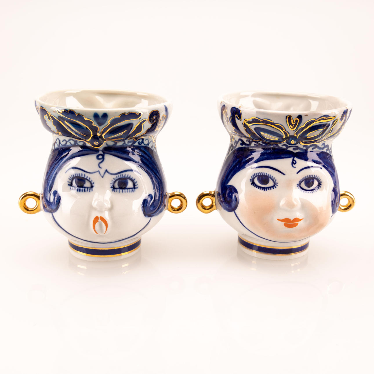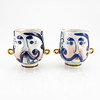 In the form of women's and men's faces, decoration in gold and blue, height 9 and 10 cm respectively.