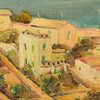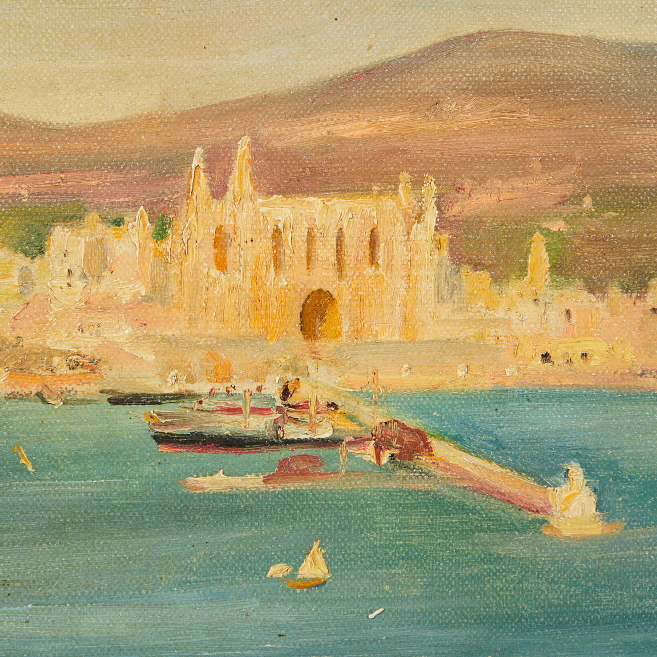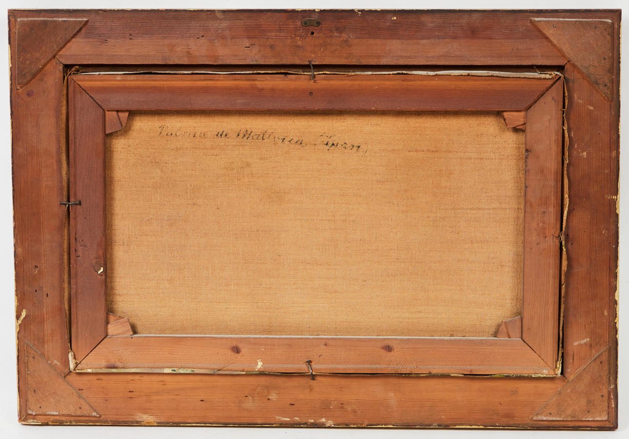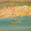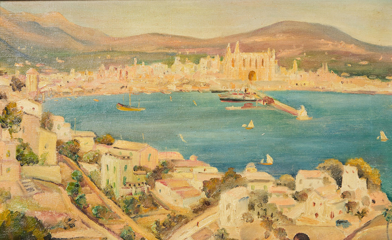 Unknown artist, painting, Mallorca, oil on canvas. Representation of a coast with several boats on a body of water with a mountain range in the background, 37x61cm (54x77cm).
