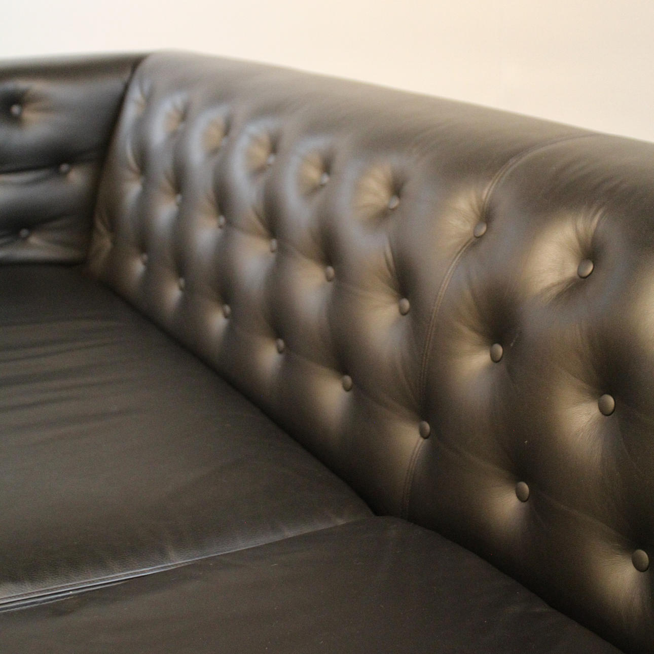 Length approx. 235 cm Height 77 cm Depth 85 cm black leather with deep stitched back Removable seat cushions.