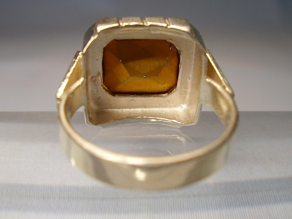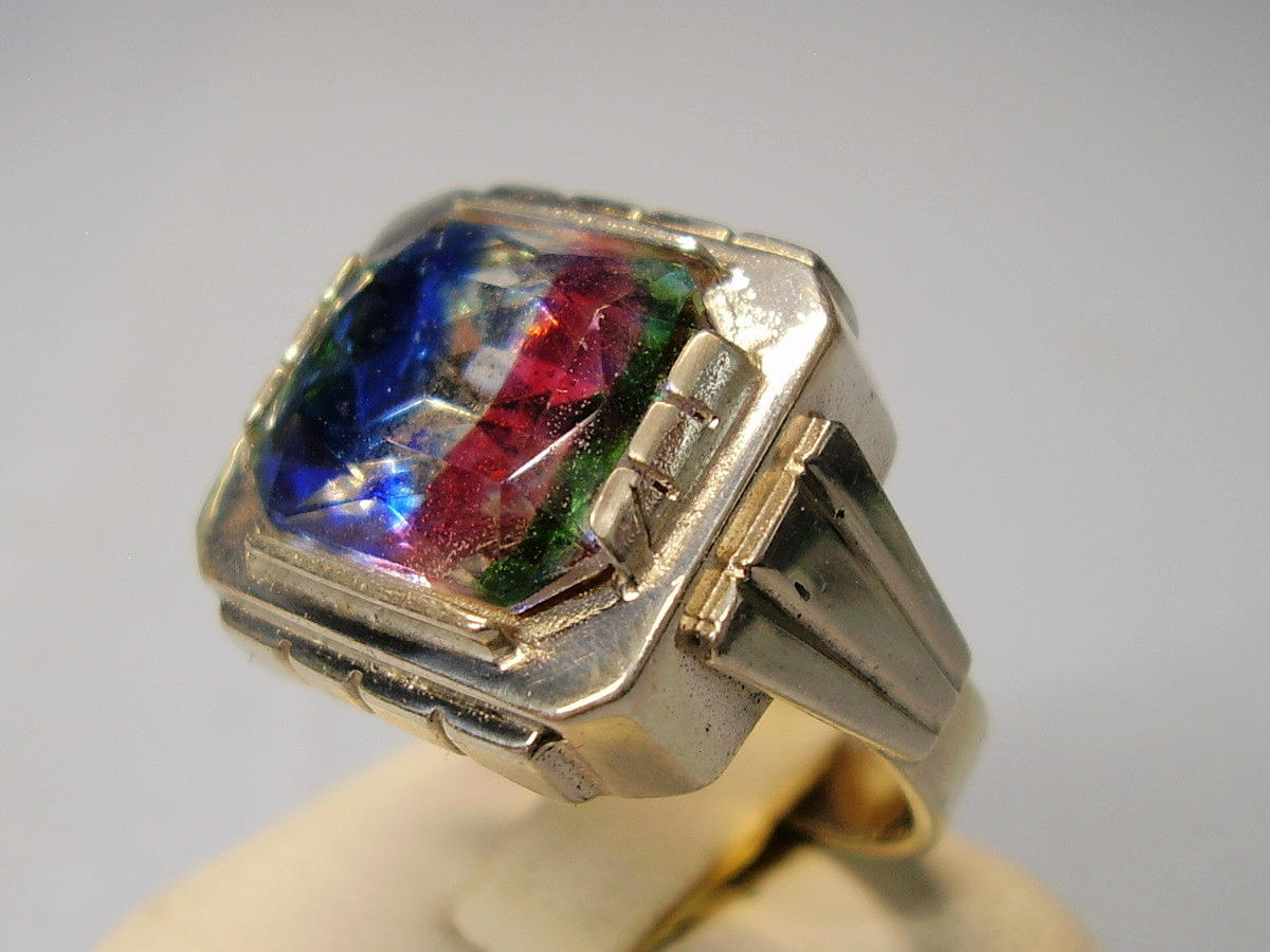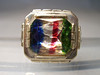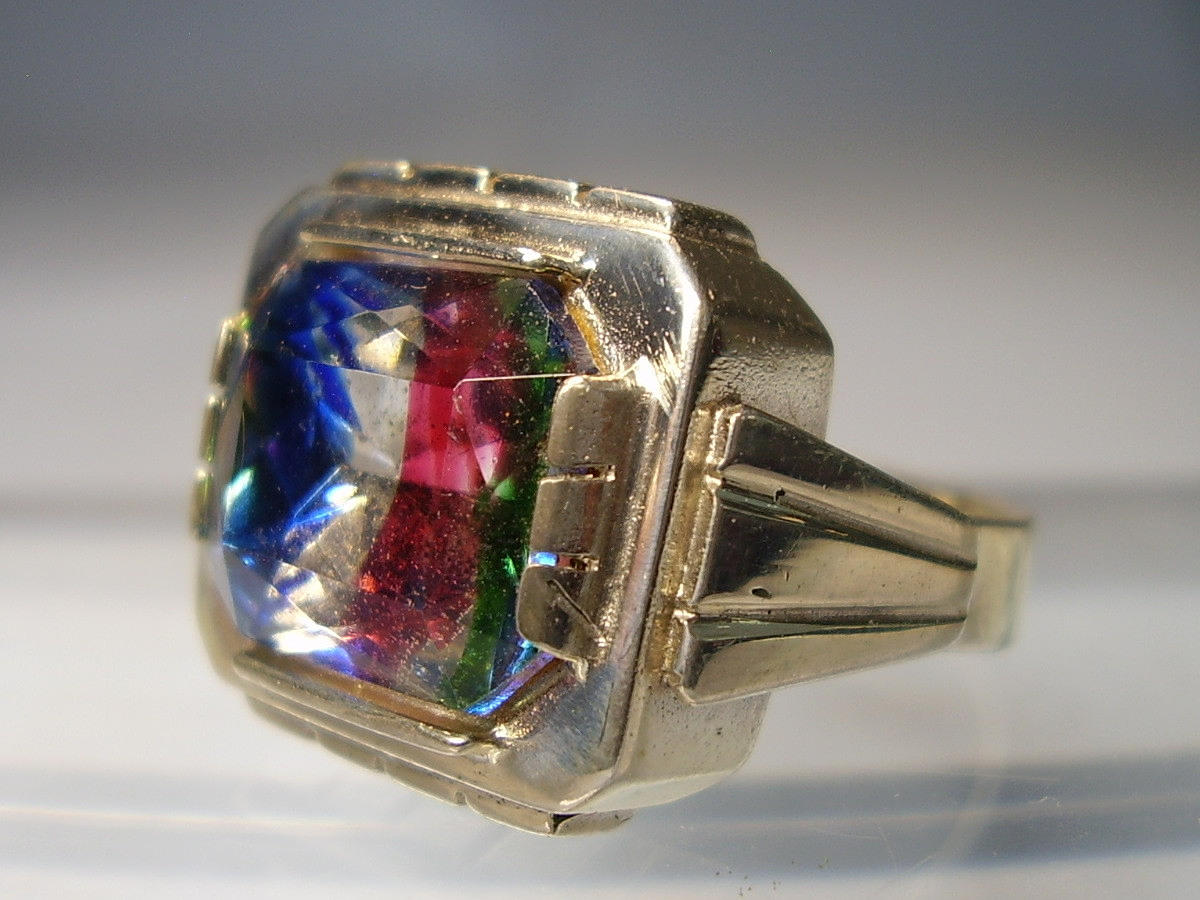 Set with an octagonal faceted Rhine pebble in a beautiful color scheme in a classic Art Deco setting.