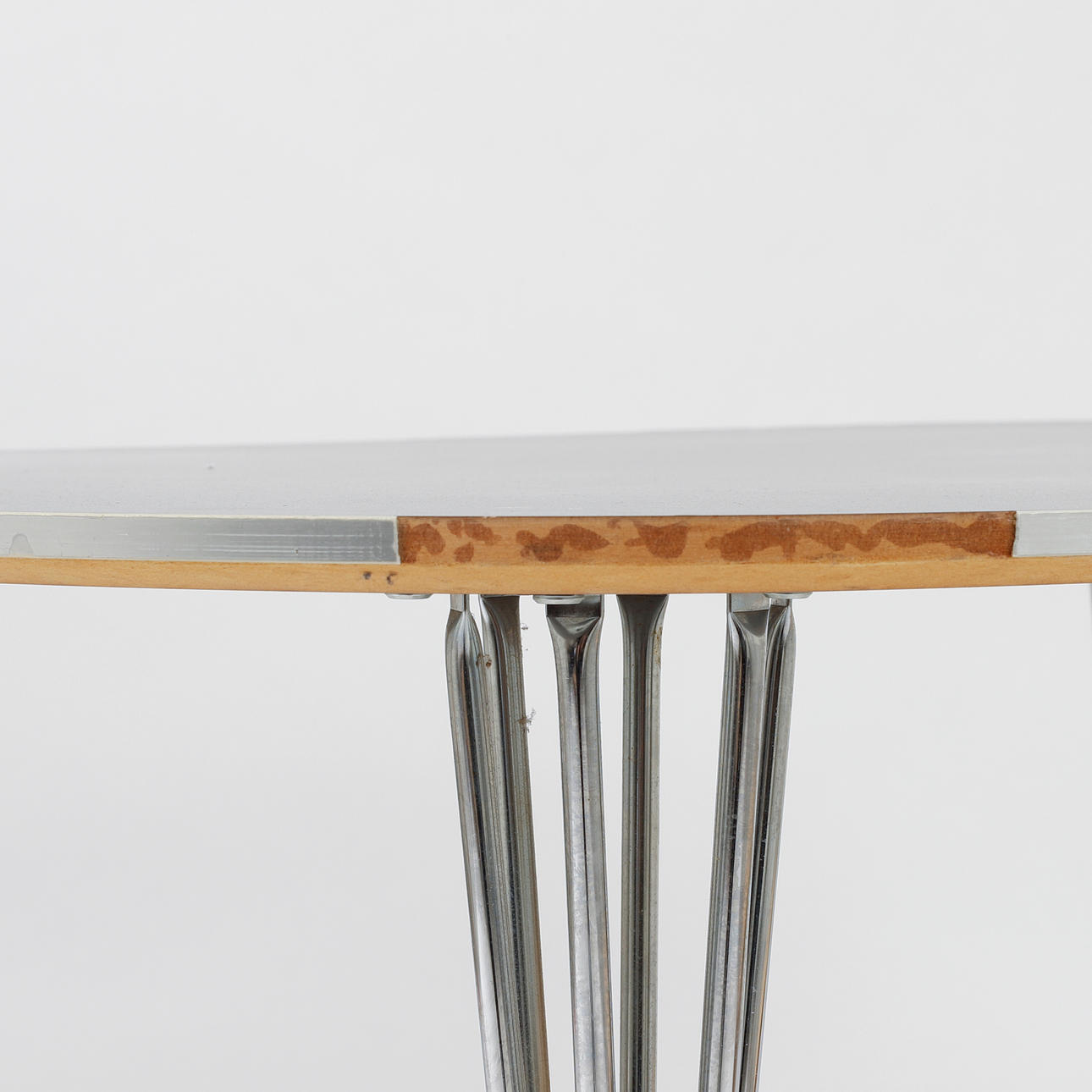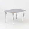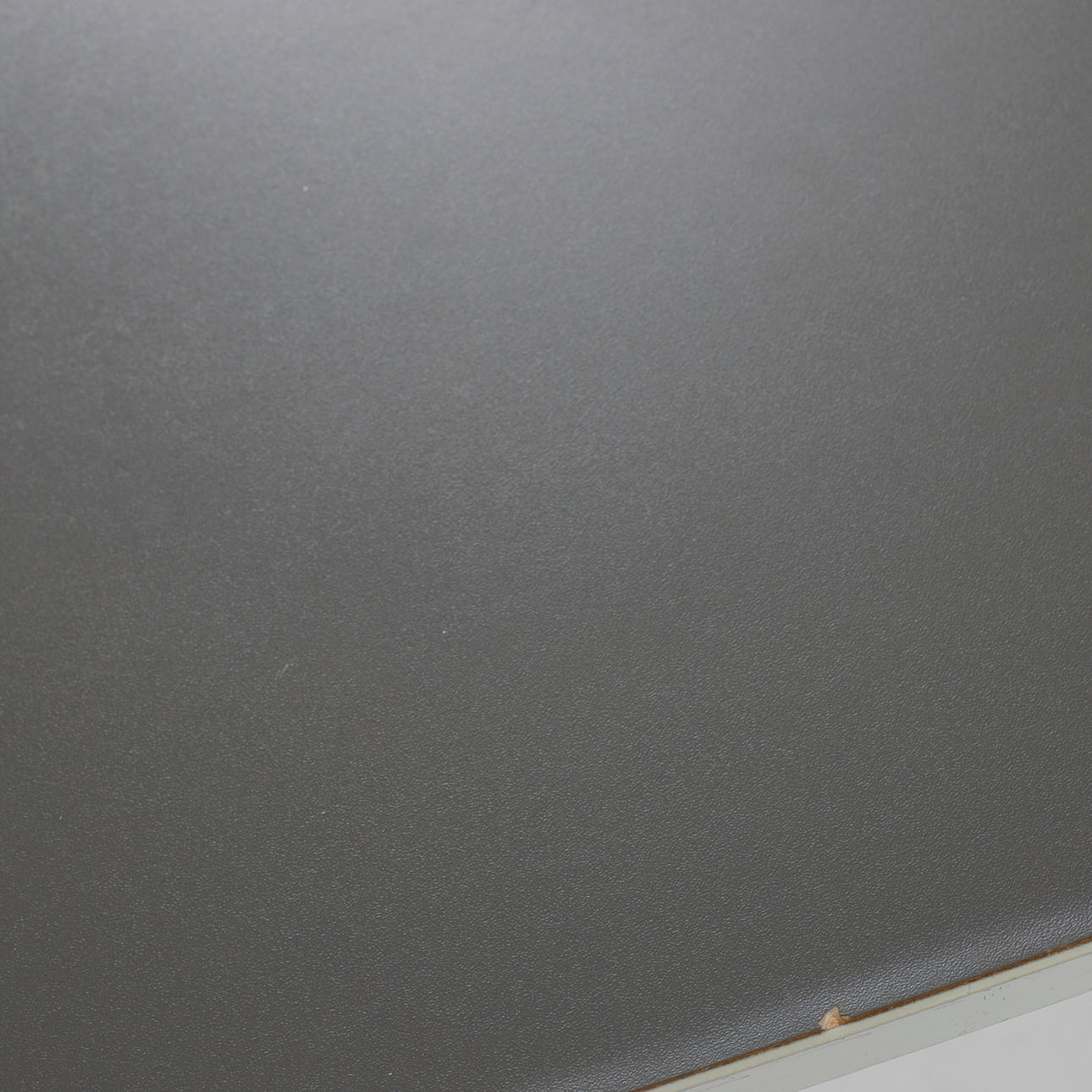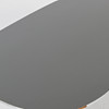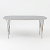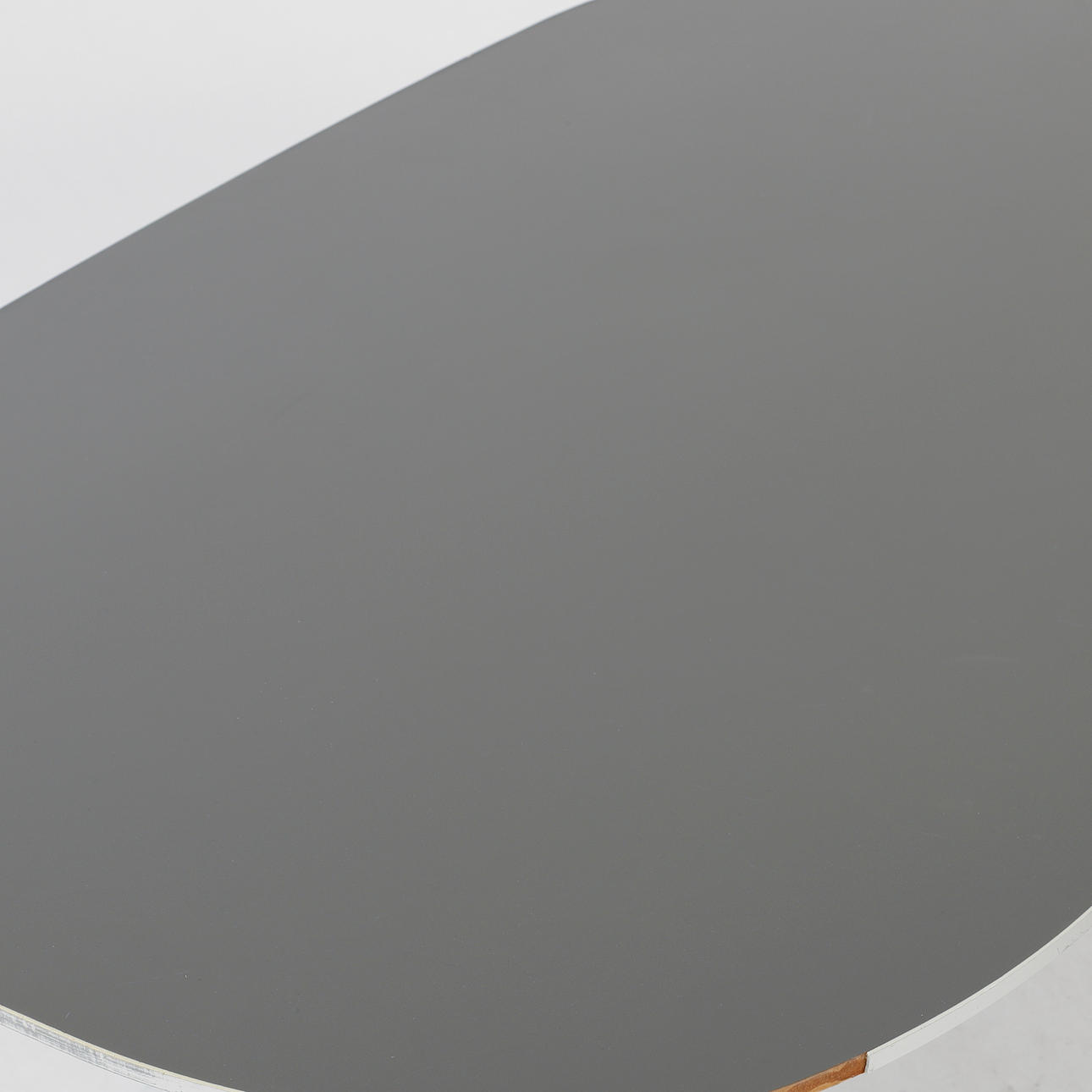 Gray laminate top on chrome legs. Oval plate 160 x 100 cm, height 71.5 cm.