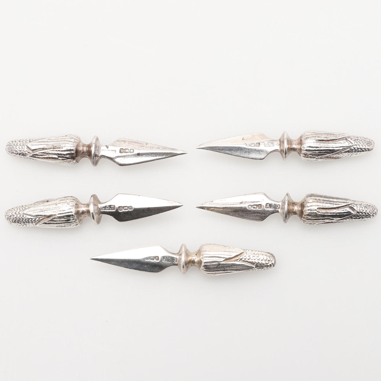 2037964. FIVE CAST SILVER CORN ON THE COB SPIKES.