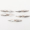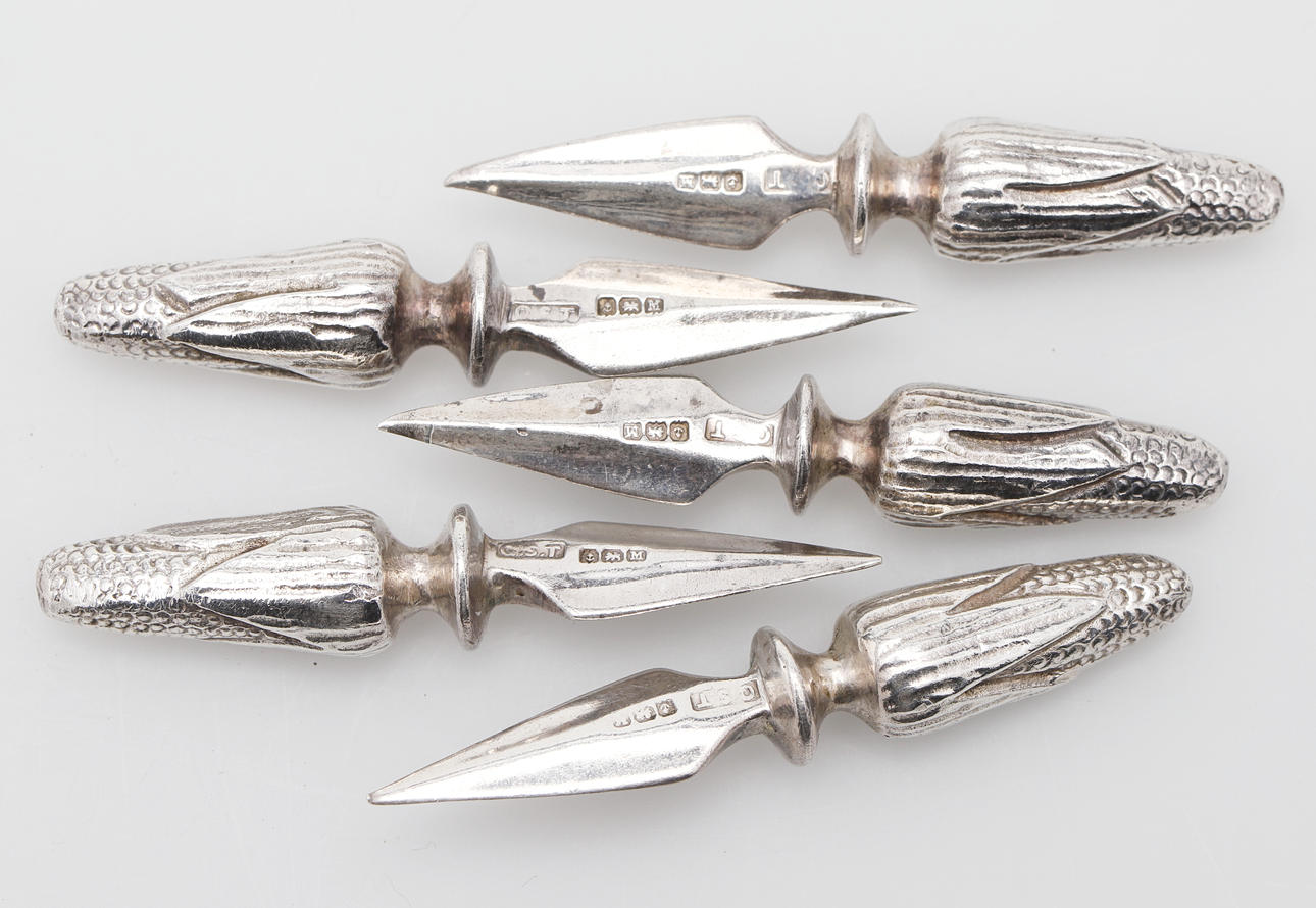 FIVE CAST SILVER CORN ON THE COB SPIKES.