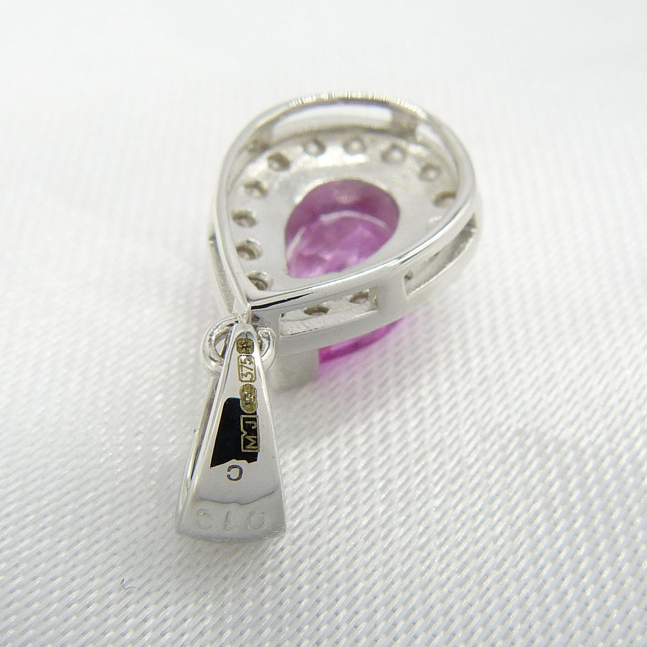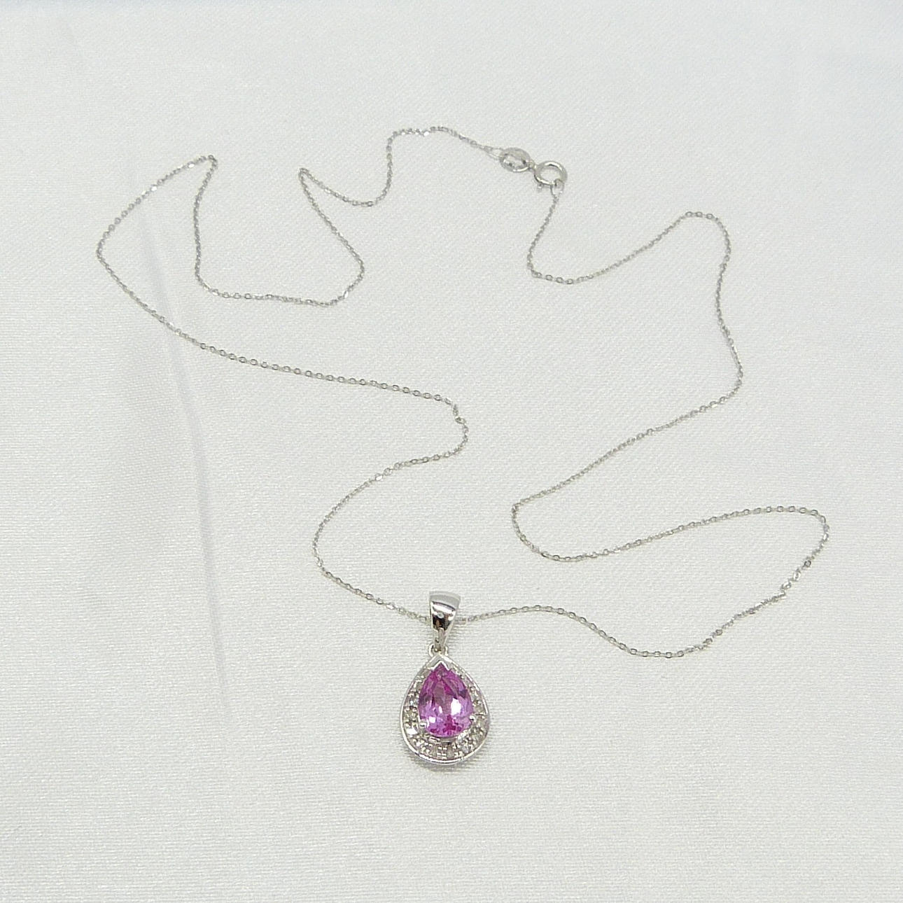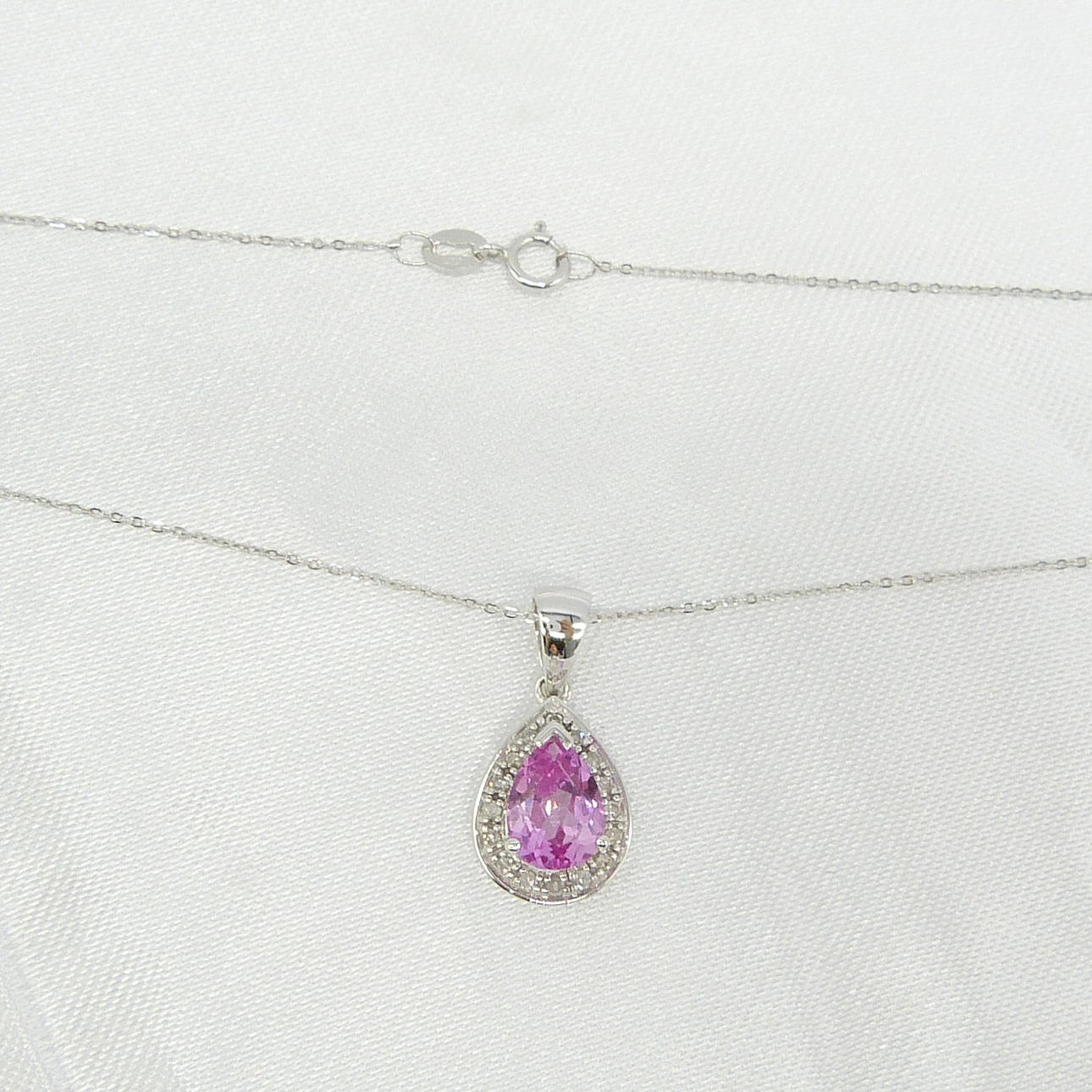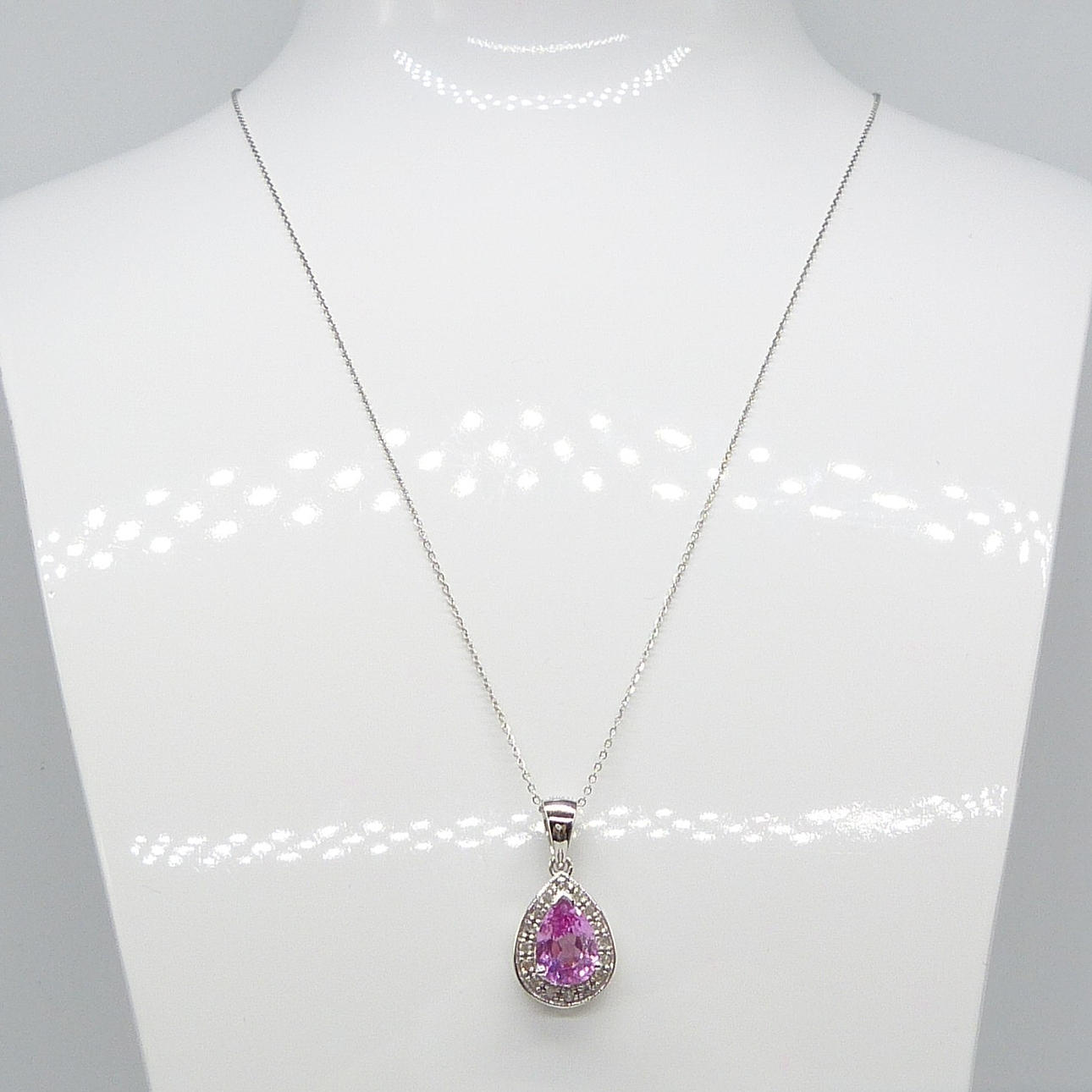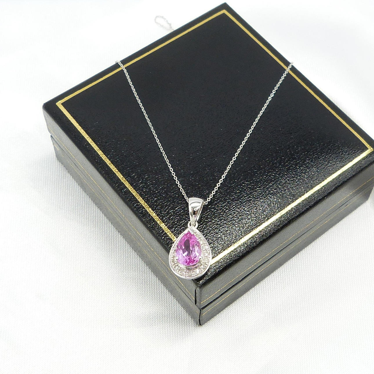 A 9k white gold necklace with a pear-shaped 2.15ct pink sapphire gemstone and diamond halo pendant, boxed.