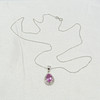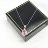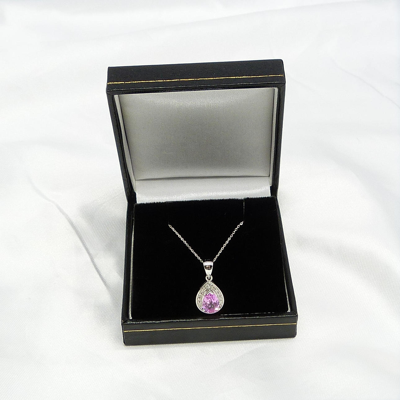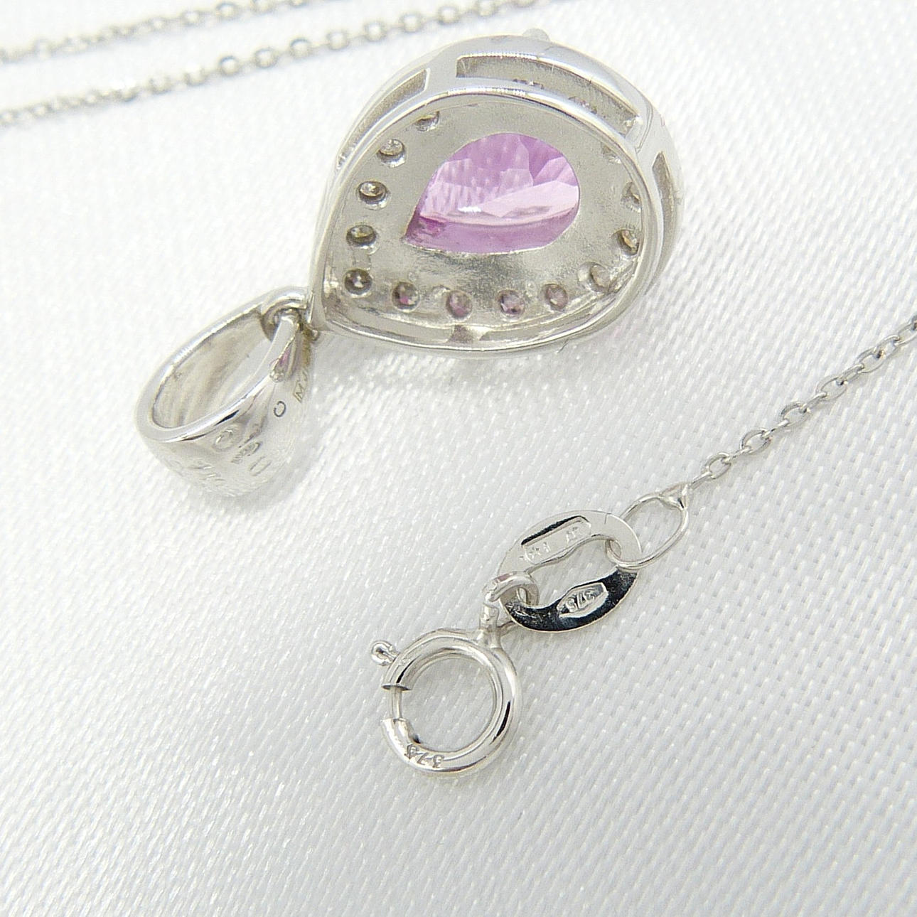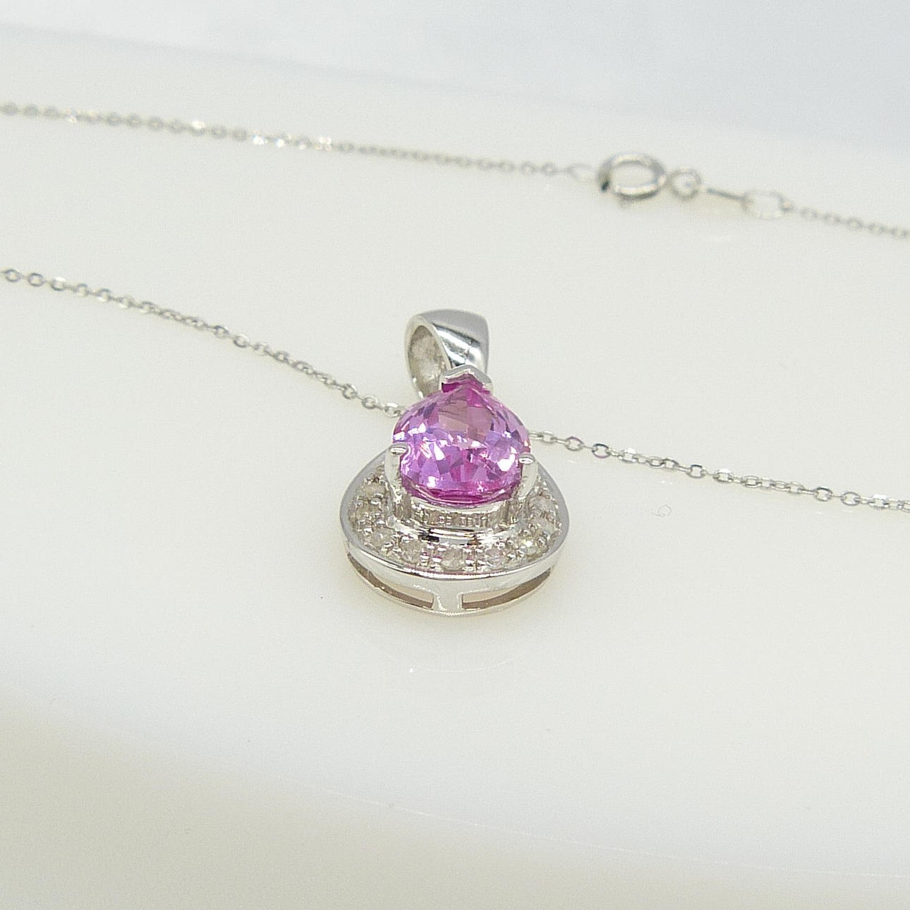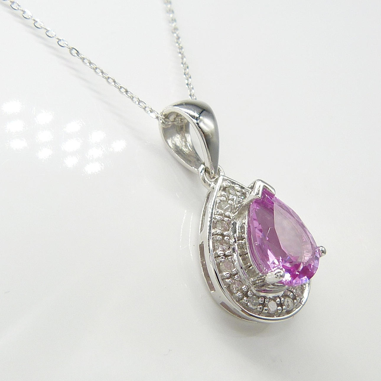 A 9k white gold necklace with a pear-shaped 2.15ct pink sapphire gemstone and diamond halo pendant, boxed.