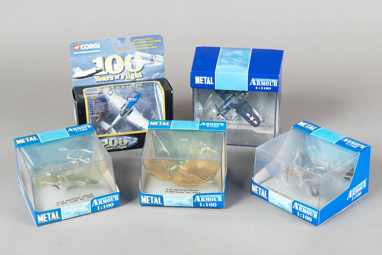 3 x P-51 Mustangs in various models F4U Corsair US Navy P-40 Warhawk Brand: Corgi 1/100 Scale Collectibles and Ornaments.