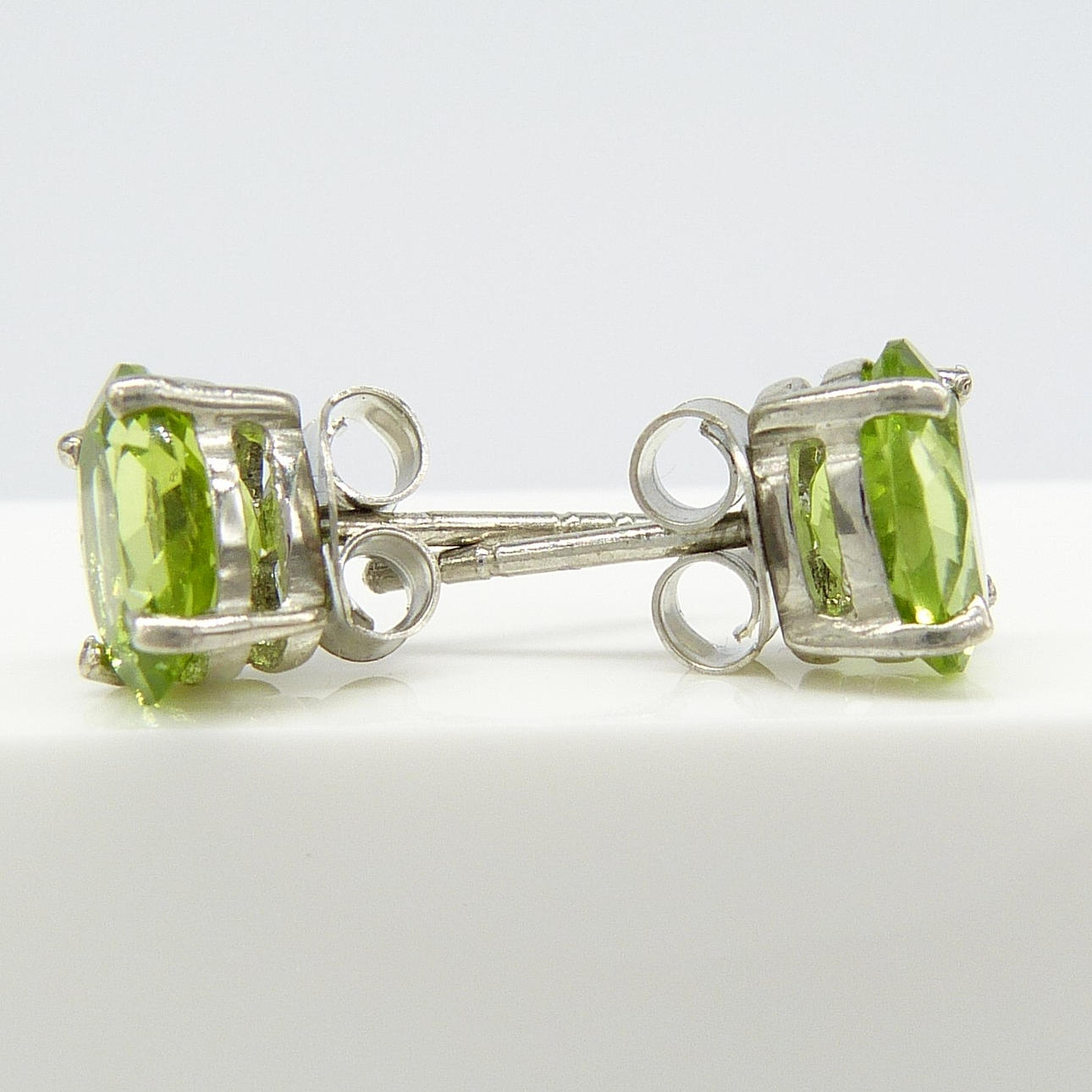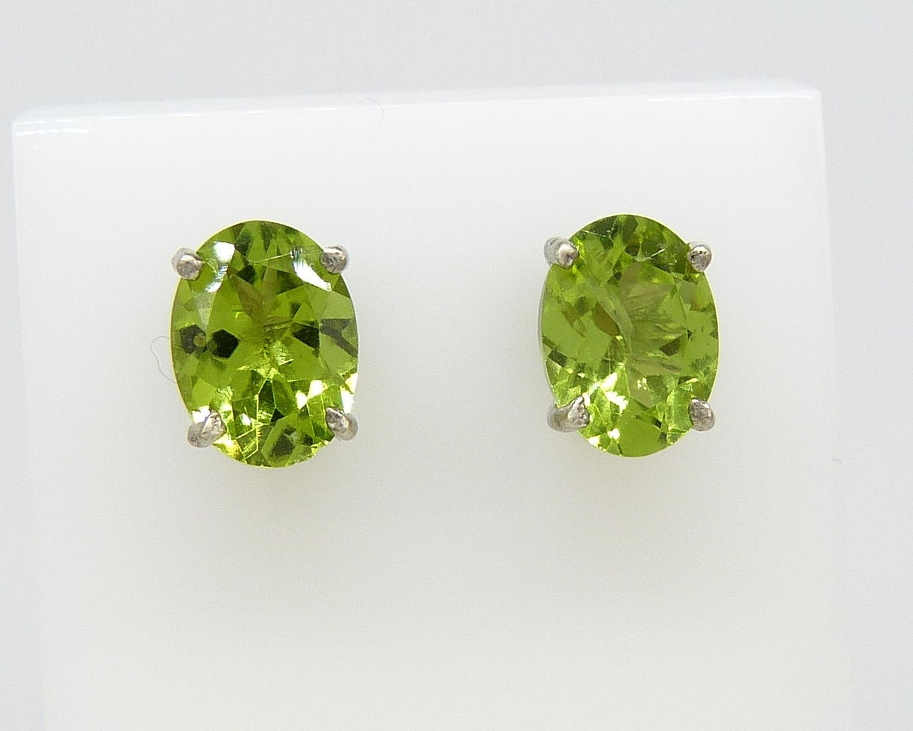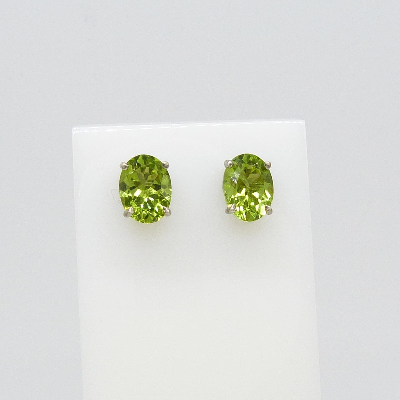 Each stud in this pair is 4-claw set with an oval green peridot gemstone of 8 x 5½mm approx.