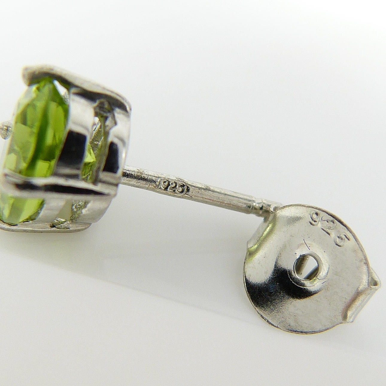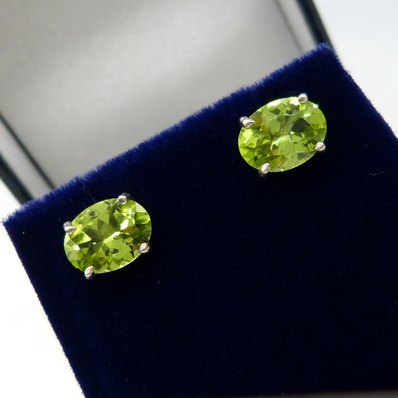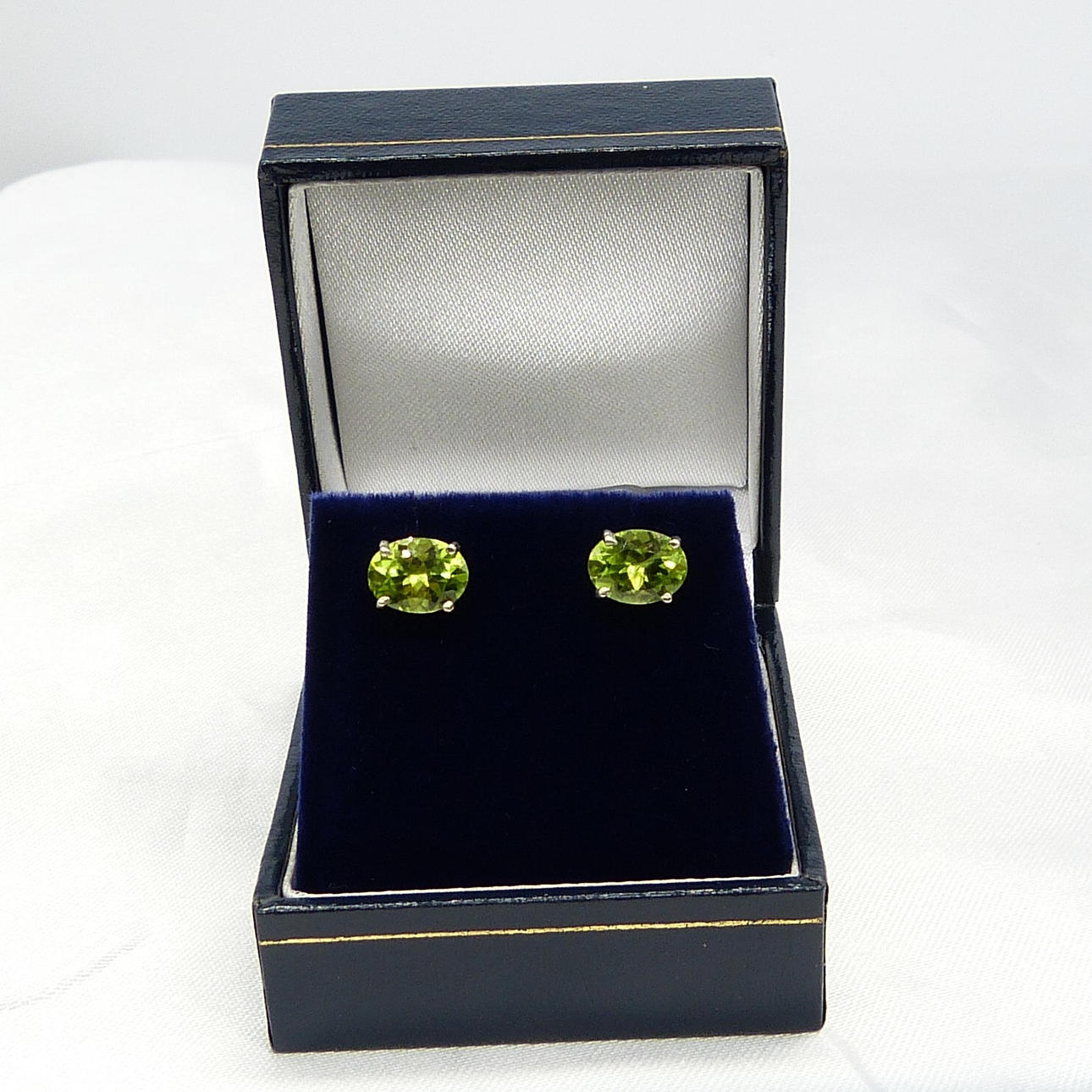 Each stud in this pair is 4-claw set with an oval green peridot gemstone of 8 x 5½mm approx.