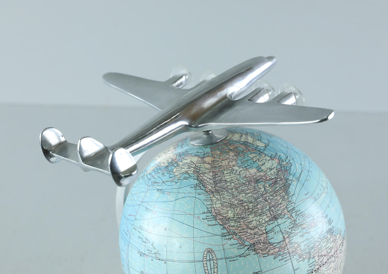 The airplane is made of aluminium, the propellers are made of plexiglass, the globe is made of cardboard, the feet are made of aluminium.