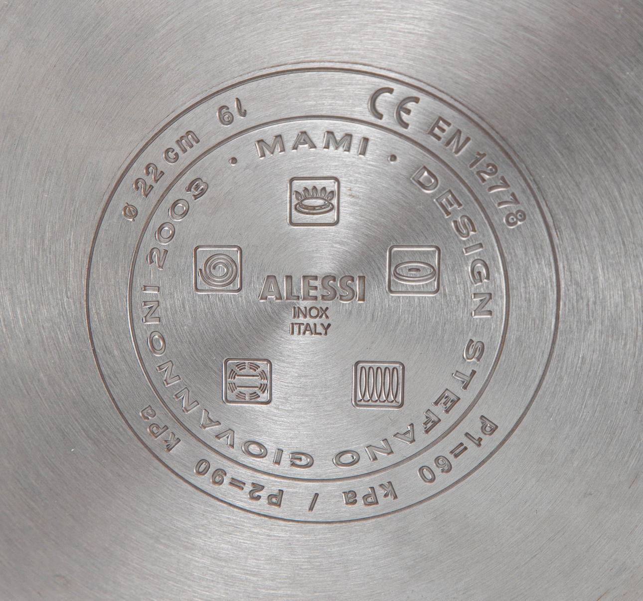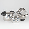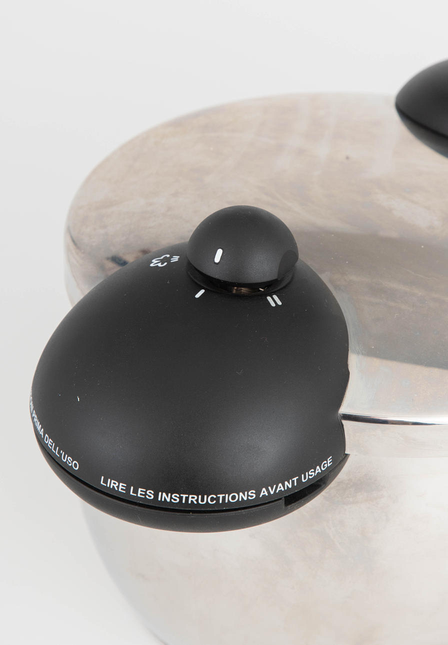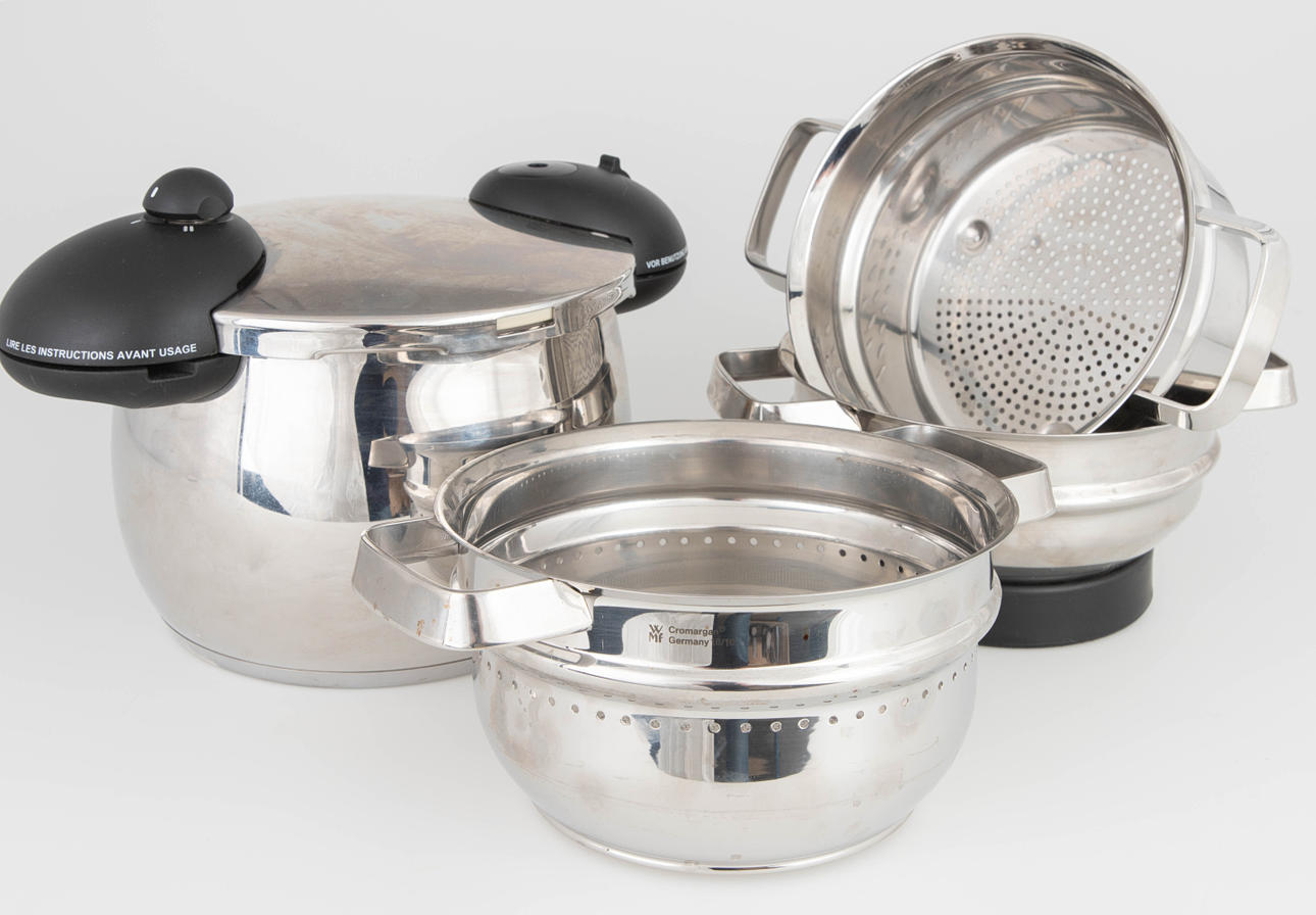 Alessi pressure cooker, designed in 2003. stainless steel, plastic. 6L 3 WMF steamer inserts, Chromargan stainless steel 18/10. approx. 22 cm.