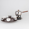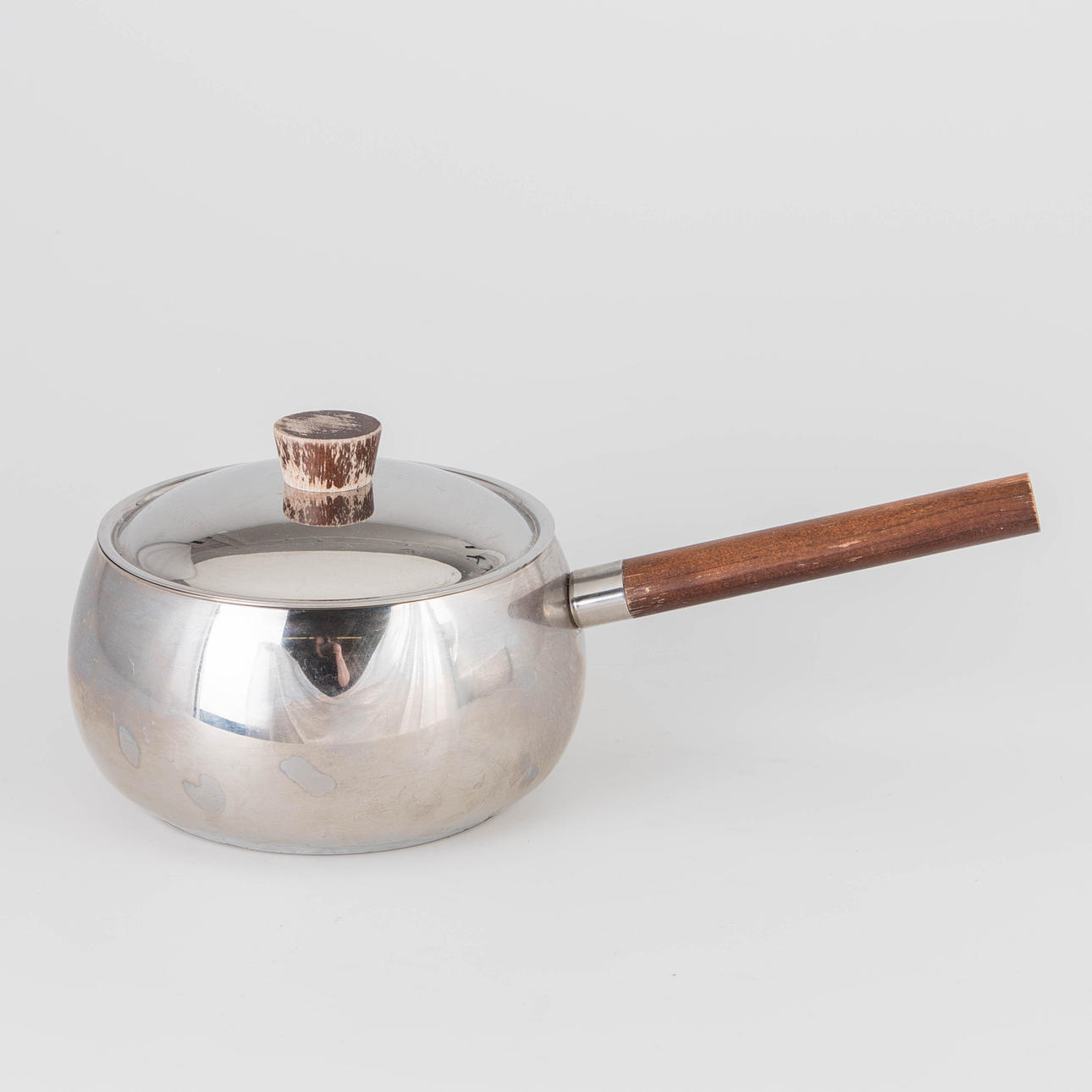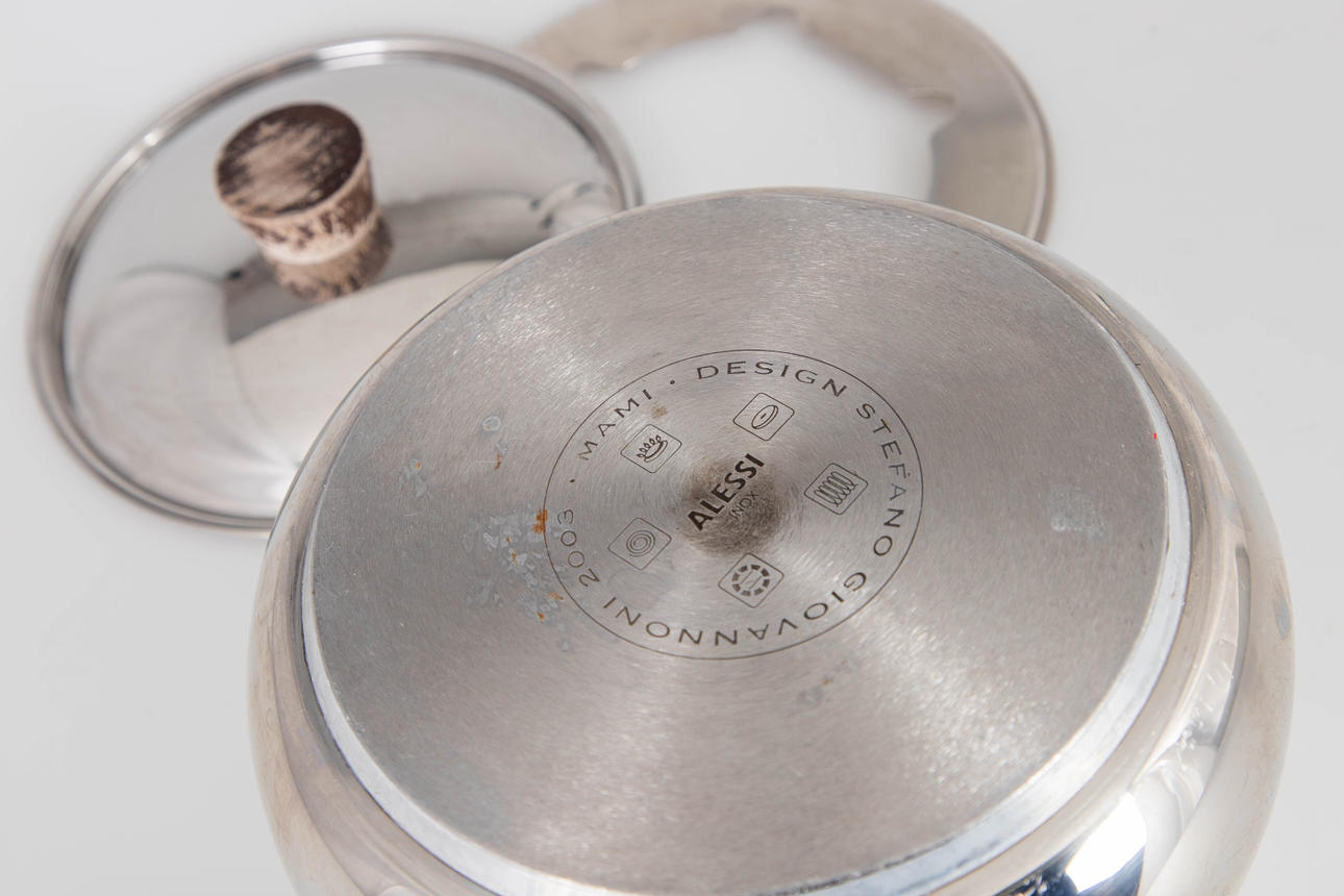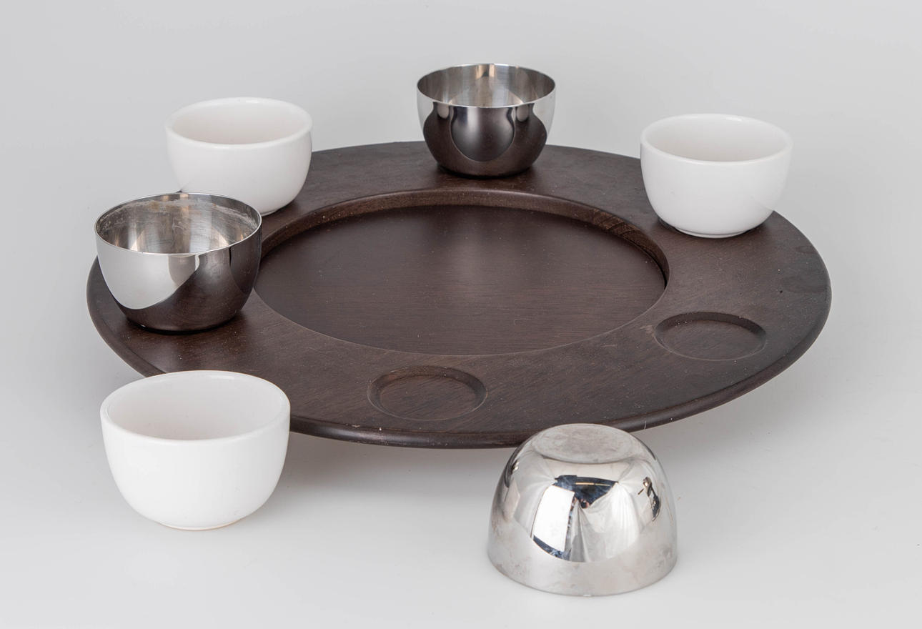 Design: Stefano Giovannoni, 2003. Stainless steel. Set consists of a cast-iron warmer, saucer, rechaud and casserole. Wooden handle. In addition, a rotating carousel made of wood with bowls made of ceramic and stainless steel. Diameter 41 cm. The fork are not present.