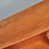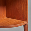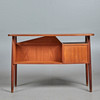 Gunnar Nielsen for Tibergaard, desk, teak, 1960s, Denmark. Desk made of teak with a rounded, rectangular tabletop and four conical feet, equipped with two drawers, one of which can be locked, and two storage compartments, usable on both sides, with a shelf on the back, H.72.5cm, L.109cm, W.55cm.