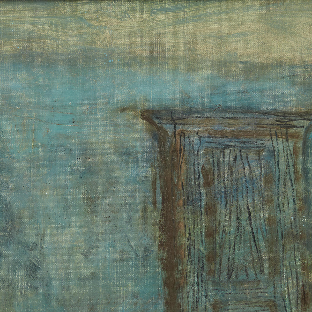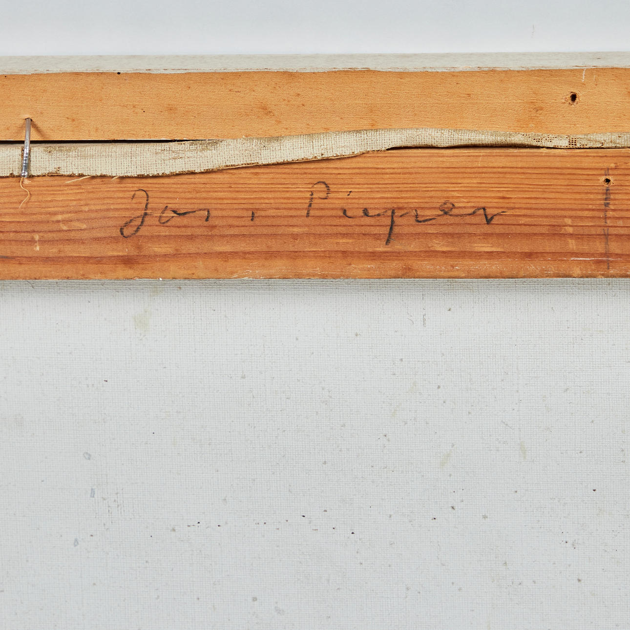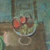Josef Pieper (1907-1977), painting, interior, oil on canvas. Representation of an interior with a fruit bowl, melon and shell on a table in front of a blue wall with a door, signed lower right and inscribed on the back of the frame, 59x71cm (66x78.5cm).