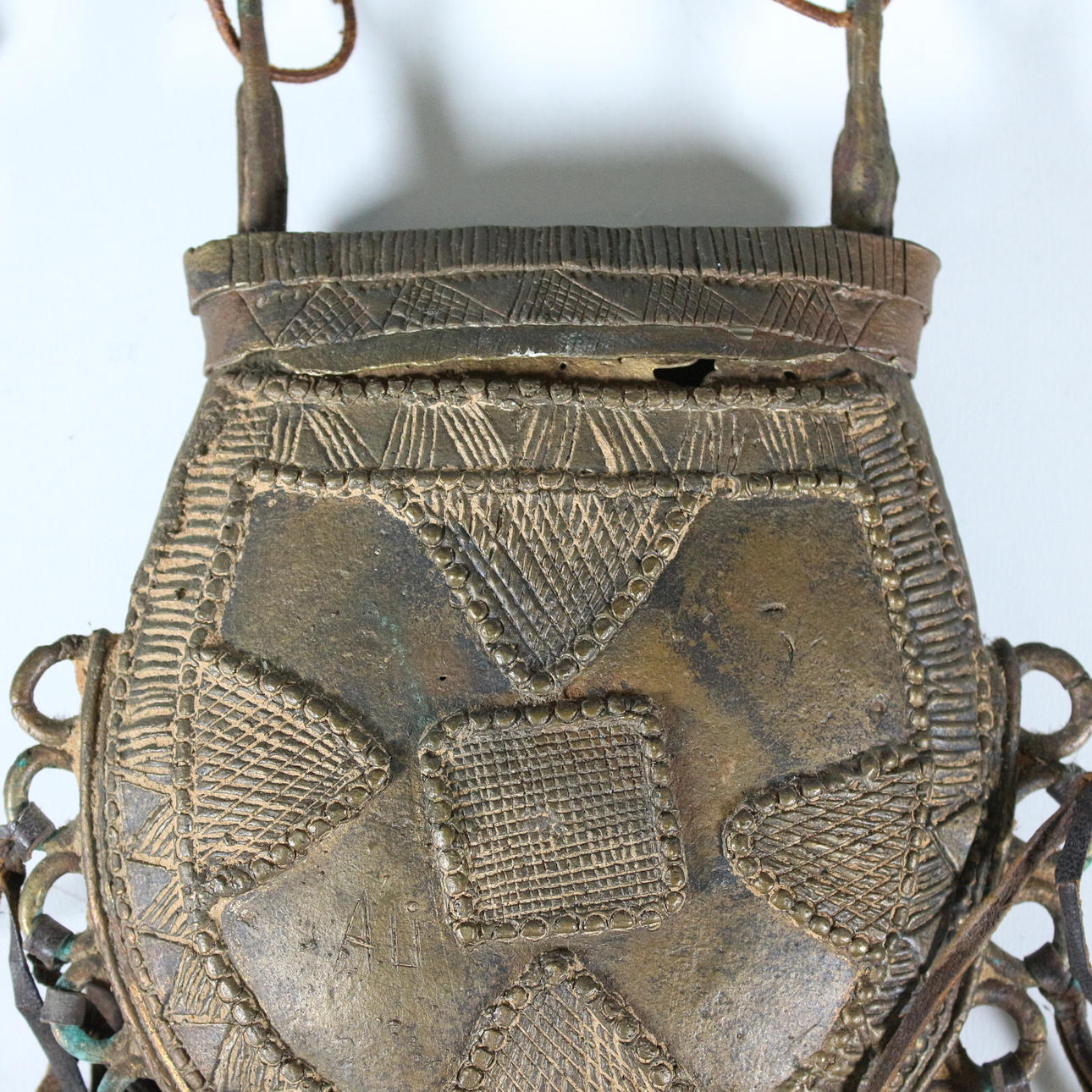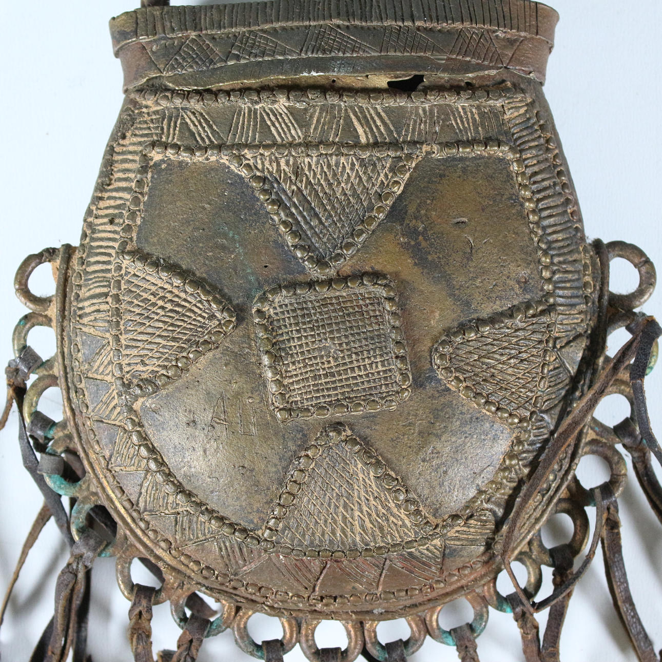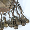 Indian cow bells, metal, decorated, with leather strap, 13 individual bells, dimensions approx.: 21x14cm.