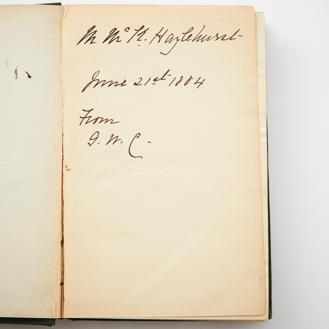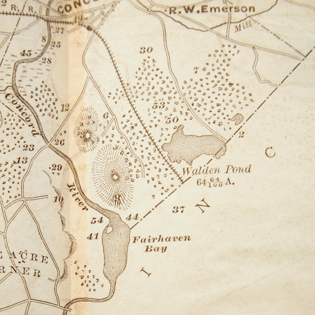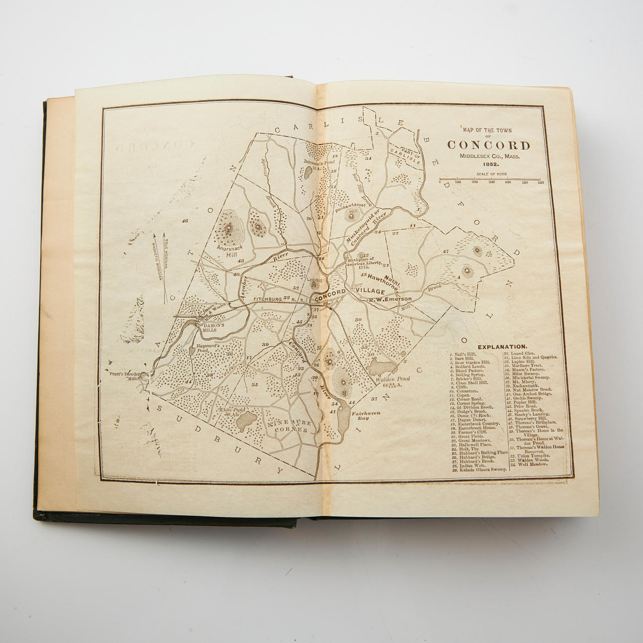 8vo. 195 x 135 mm. (1), V, (1 blank), 382, 16 pp. 1 double page map (over the town of Concord in 1852). Publisher's green cloth with gilt title on spine and gilt reproduction of Thoreau's signature on front board, top edge gilt. Binding slightly worn. First leaf near loose, with presentation in ink, dated June 21st 1884.