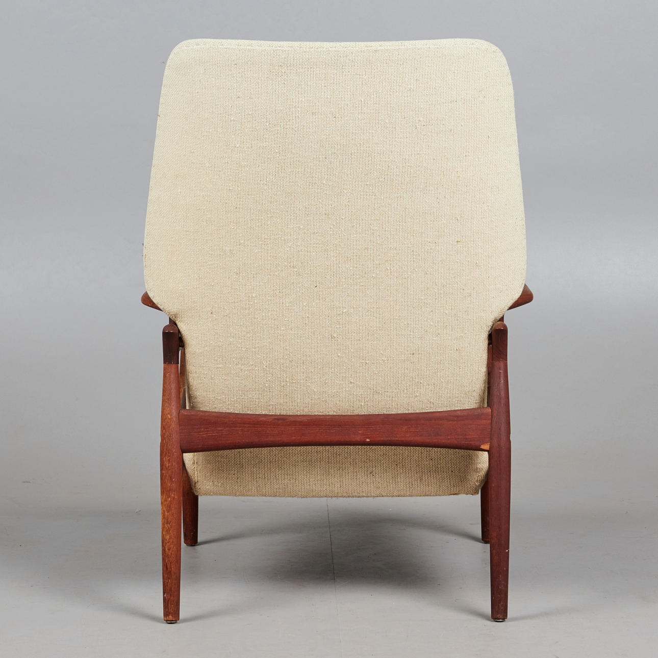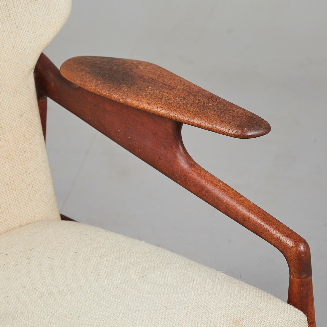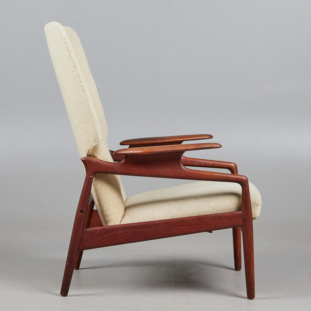 John Boné, high-back / lounge chair, teak, wool, 1960s, Denmark. High-back chair made of solid teak with expansive armrests, upholstered seat and backrest and covered with beige wool, original cover, adjustable backrest, H.98cm, seat height: 39cm, W.70cm, D.77-110cm.