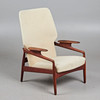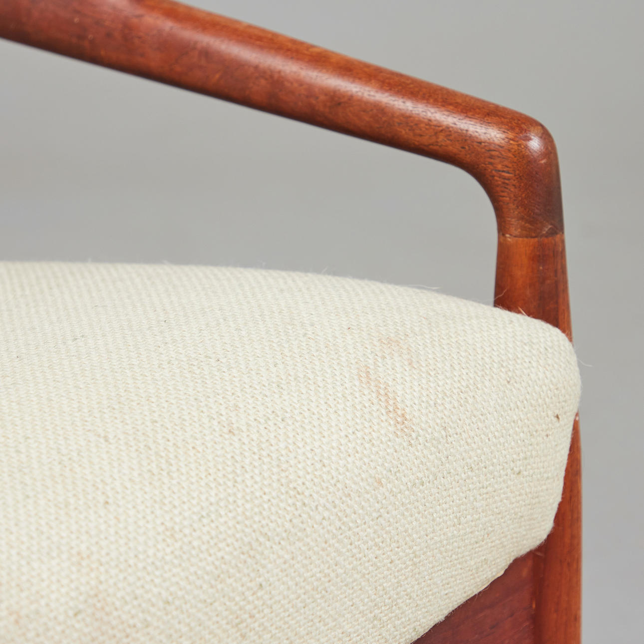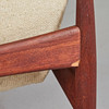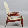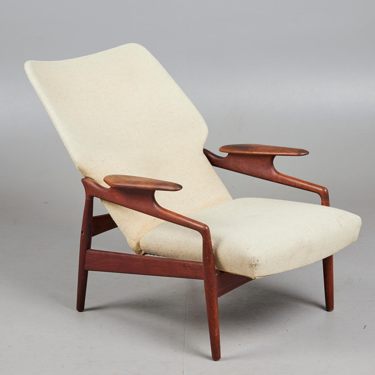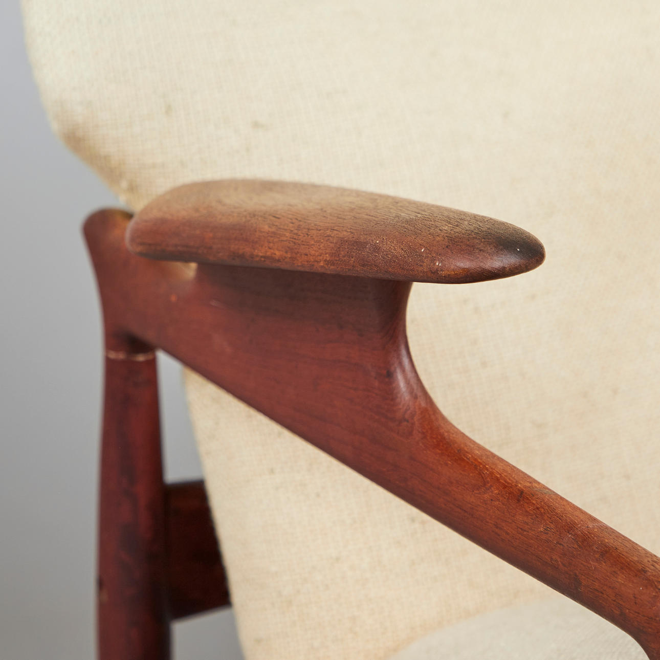John Boné, high-back / lounge chair, teak, wool, 1960s, Denmark. High-back chair made of solid teak with expansive armrests, upholstered seat and backrest and covered with beige wool, original cover, adjustable backrest, H.98cm, seat height: 39cm, W.70cm, D.77-110cm.