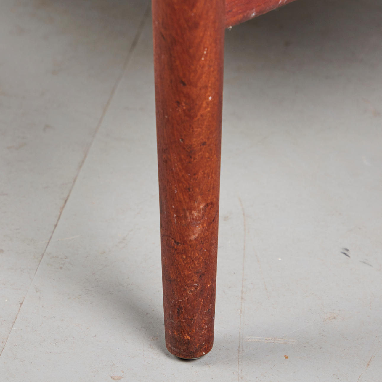 Age-appropriate signs of wear and abrasion, partial abrasion of the wood, hardened upholstery, one part of the cover is stained, one defect in the wood on the back.