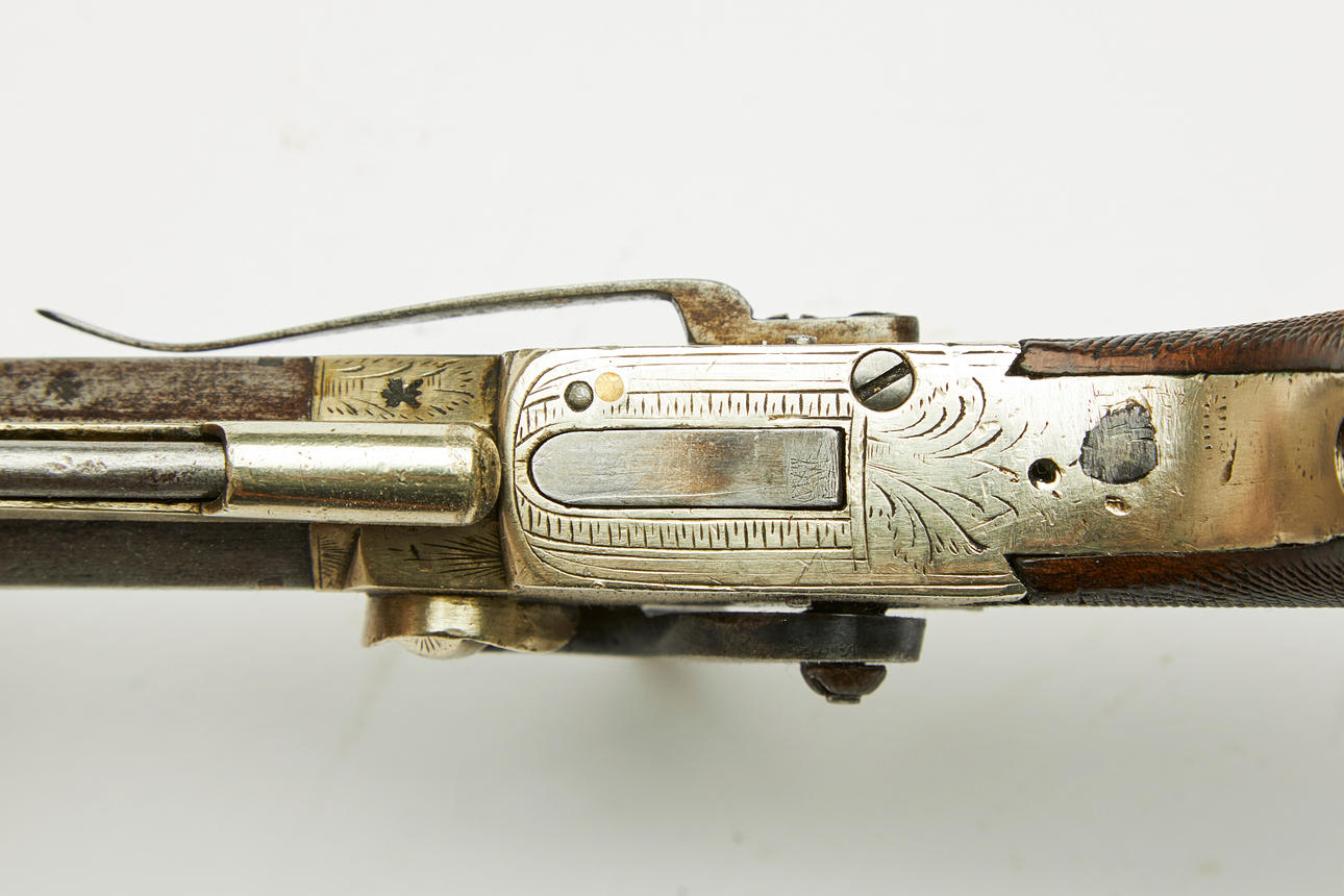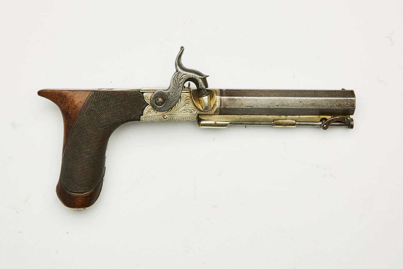 Octagonal fluted barrels, signed EW Bailey London, with proof-marks, stock in hank, fold-out triggers, belt hooks, saw-handle pistons, length approx. 22 cm.