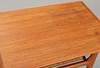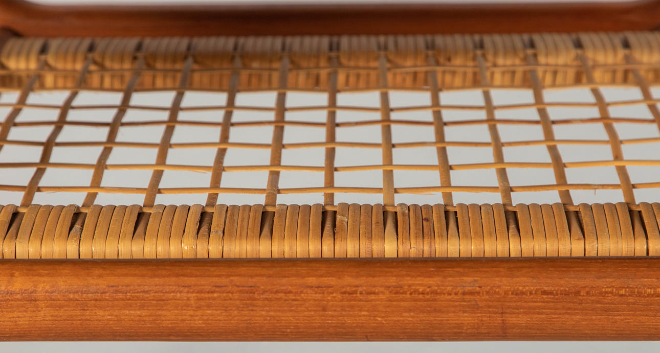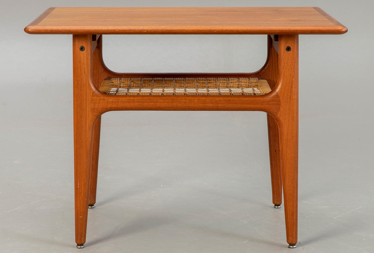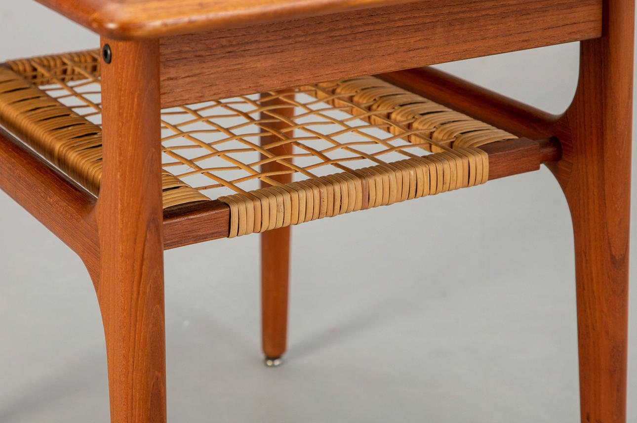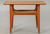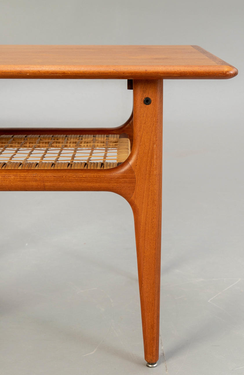 Small coffee table in teak veneer with wicker shelf. Marked on the underside with a stamp. HxWxD: 53x75x52cm.