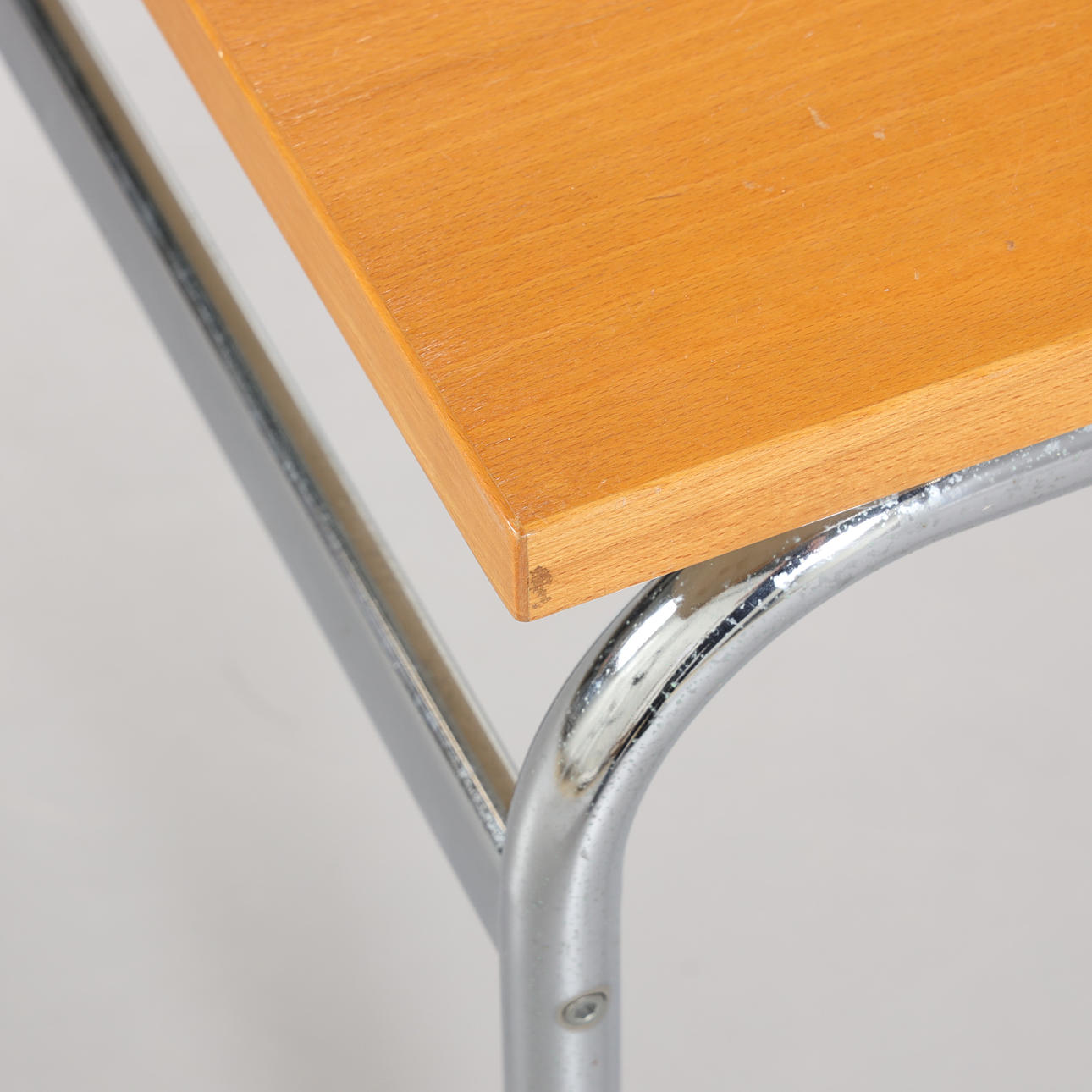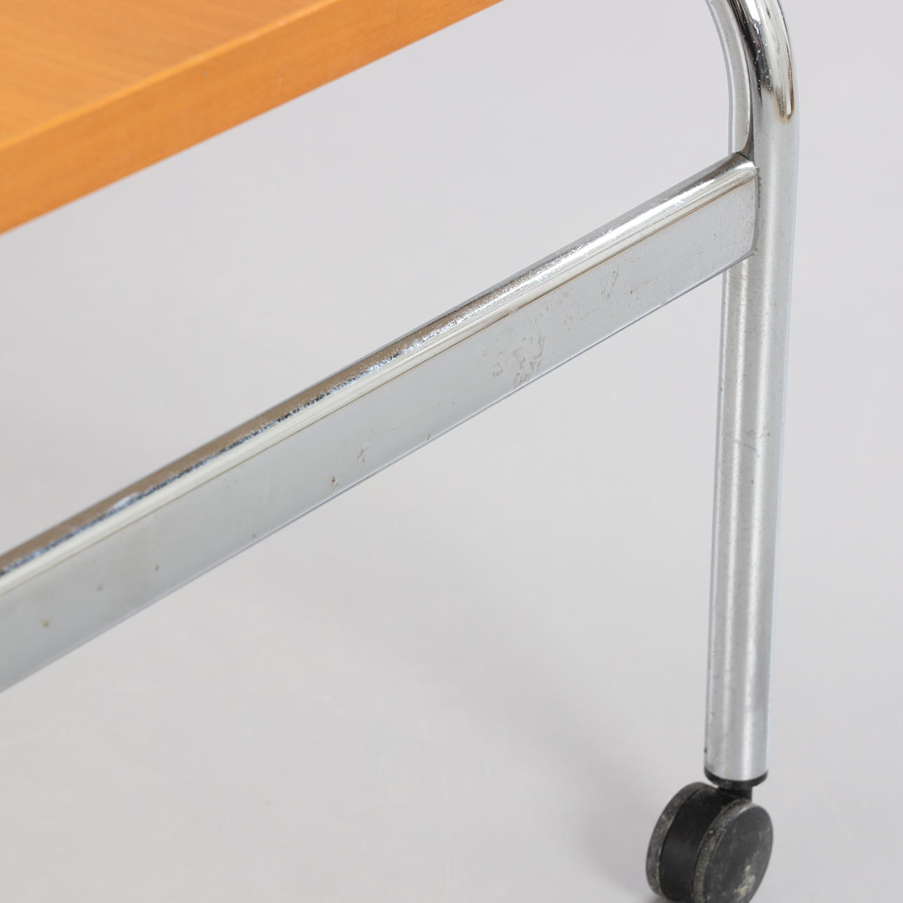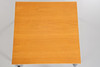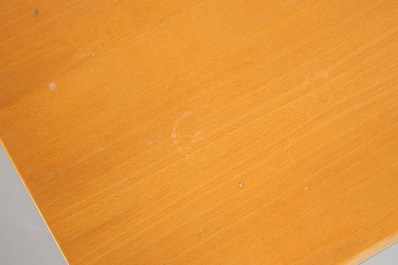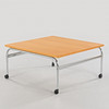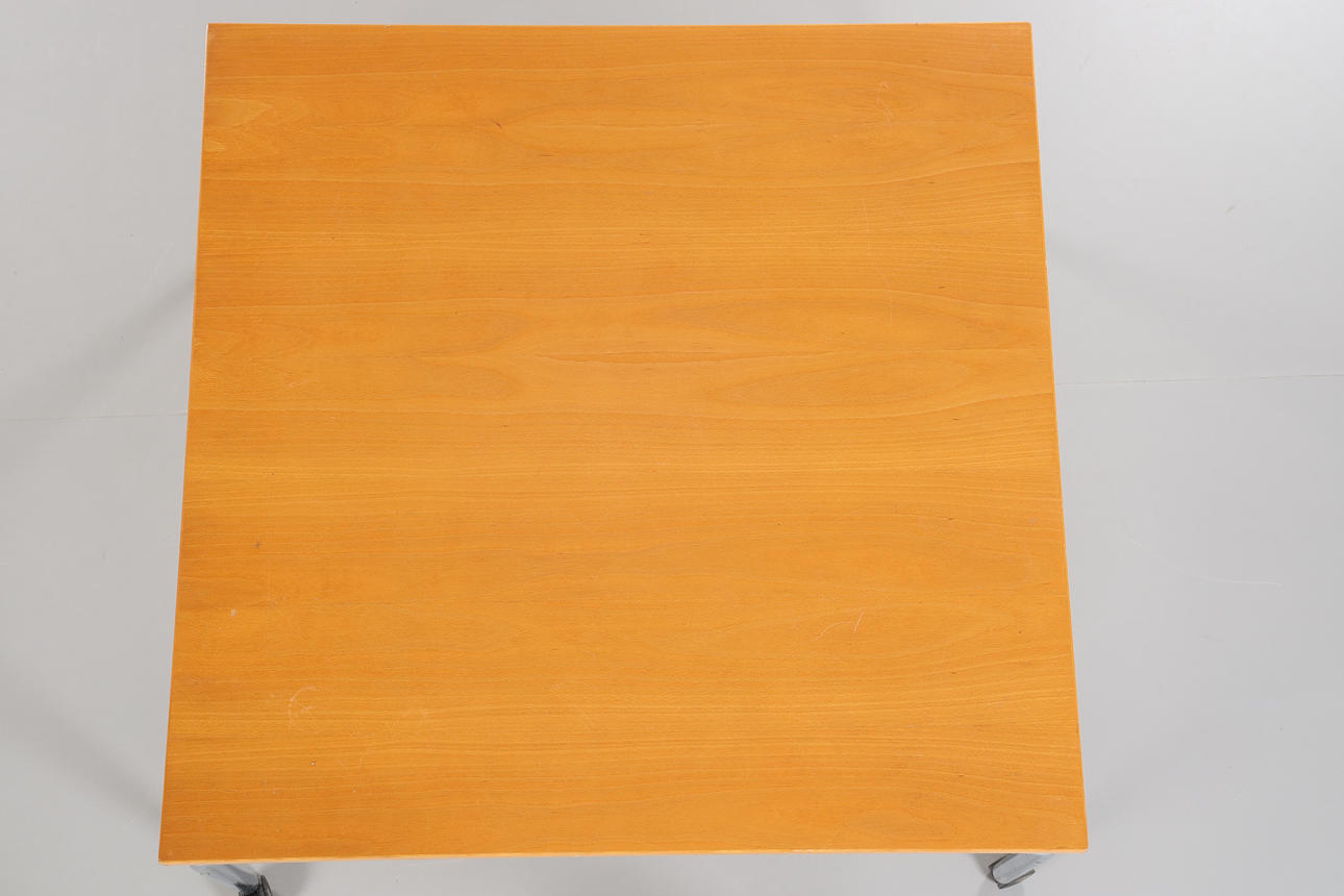 veneered sheet in beech, tubular steel base with wheel pulleys. height approx. 50 cm, 100x100 cm.