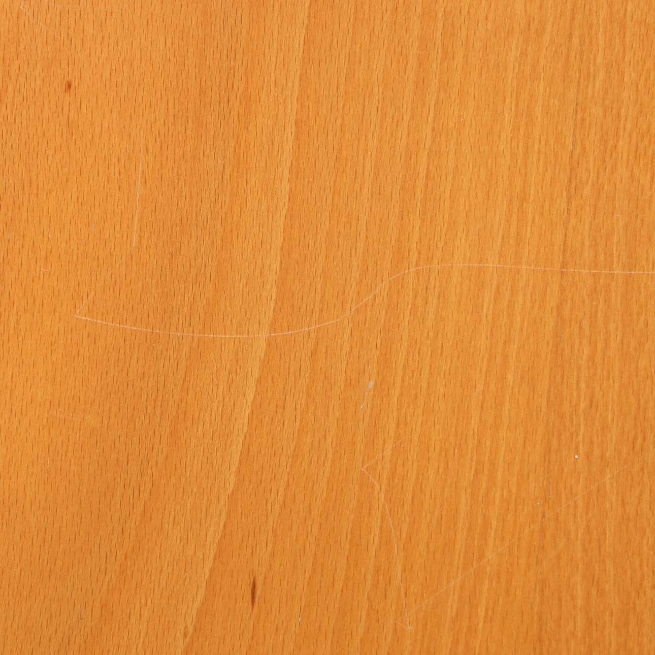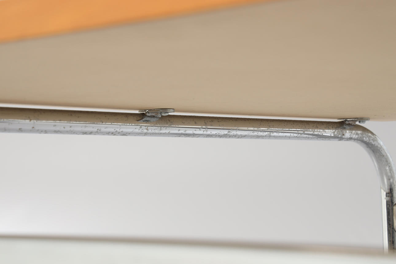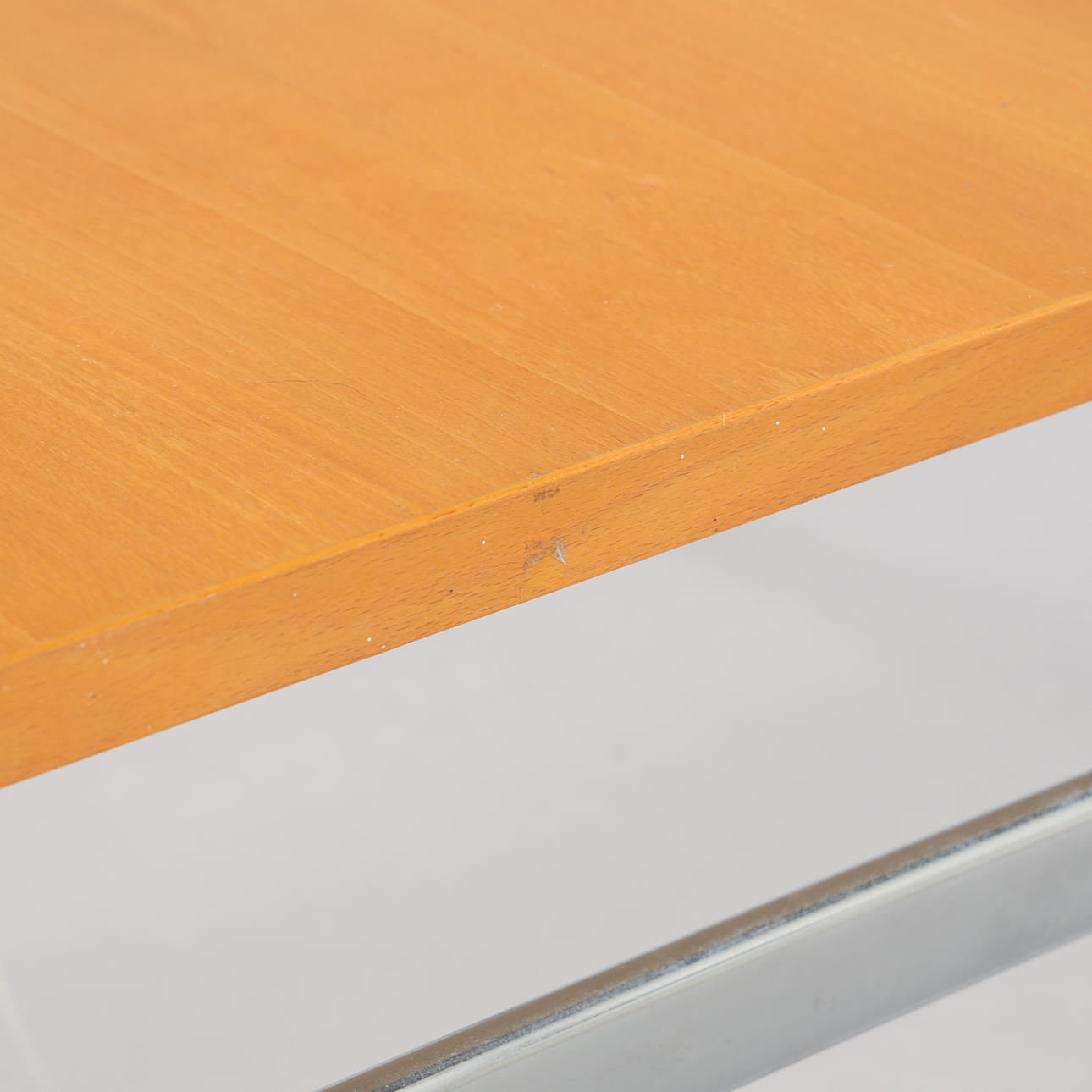veneered sheet in beech, tubular steel base with wheel pulleys. height approx. 50 cm, 100x100 cm.
