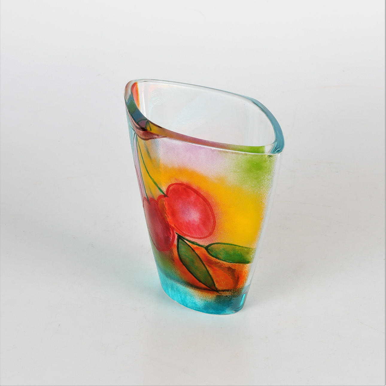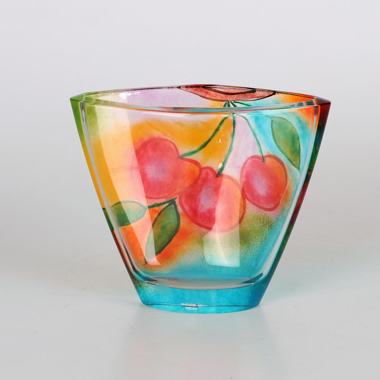Vase "Kersbär", signed Lena A Linderholm, for Klafreström Sweden. Elliptical, painted pressed glass.