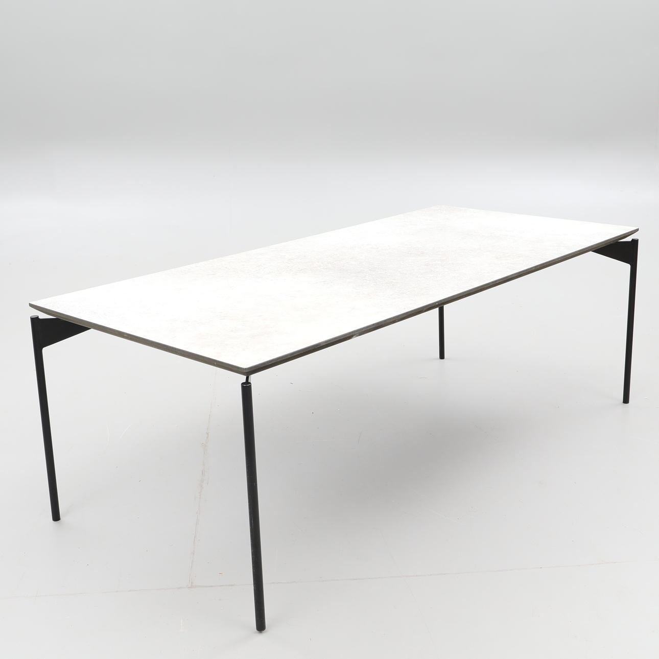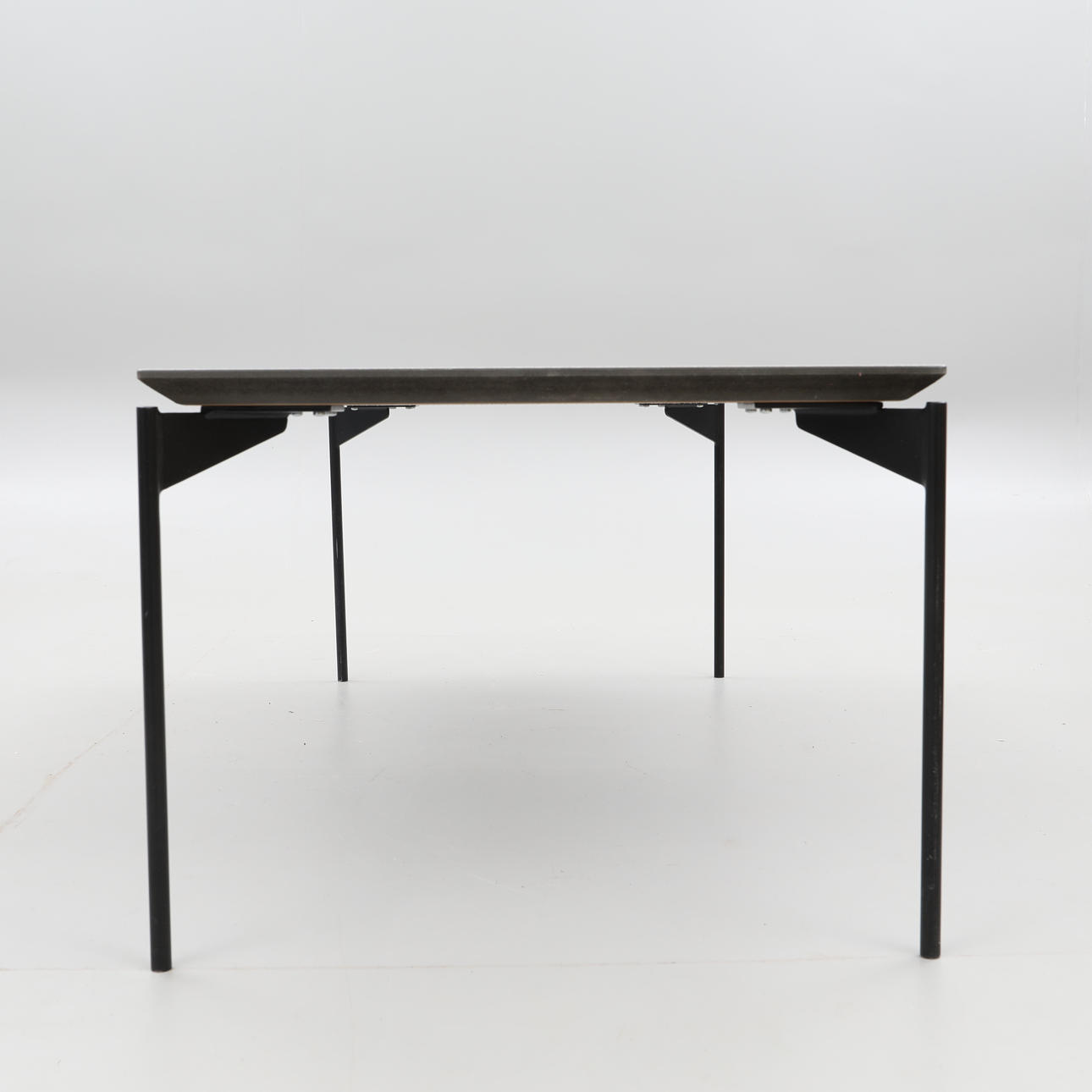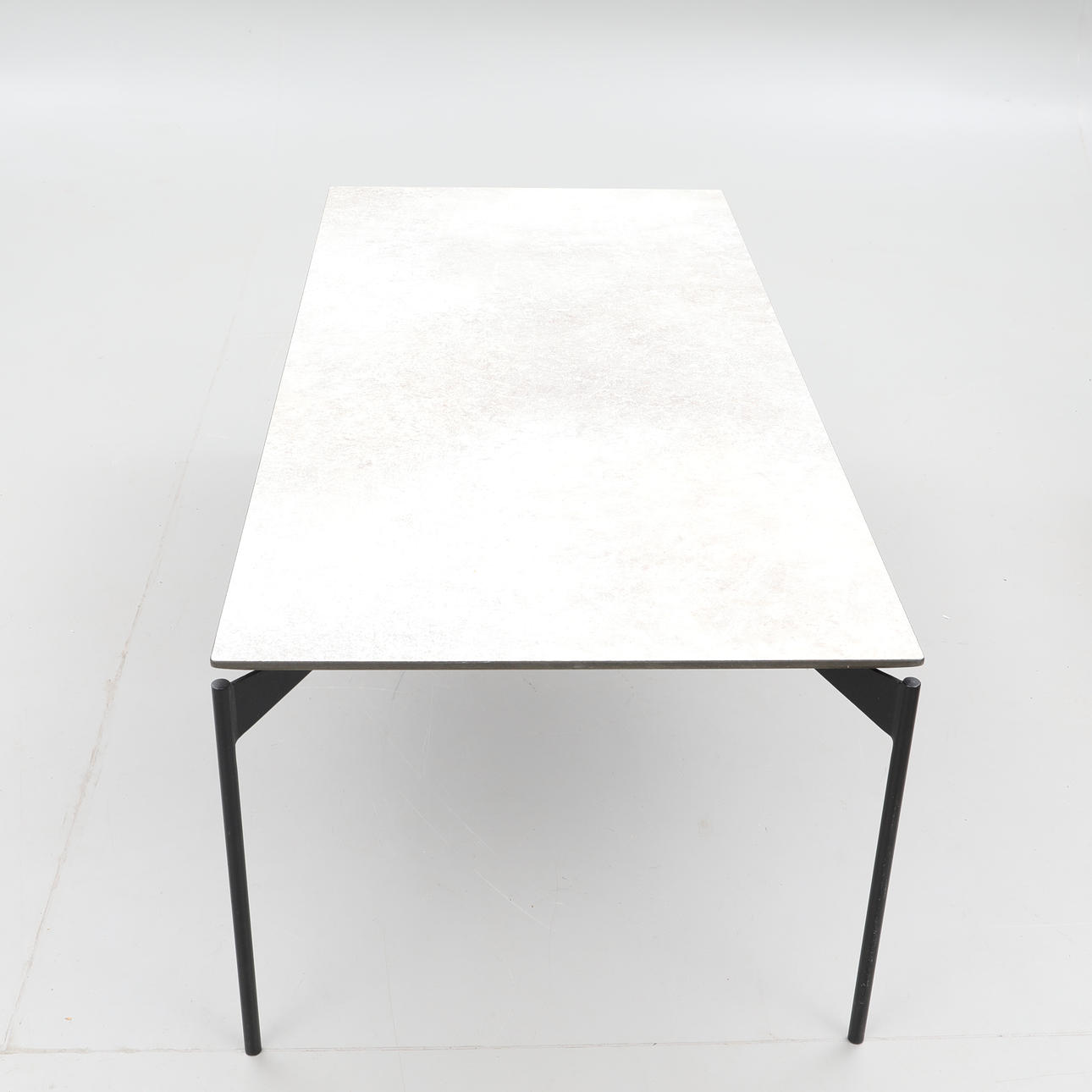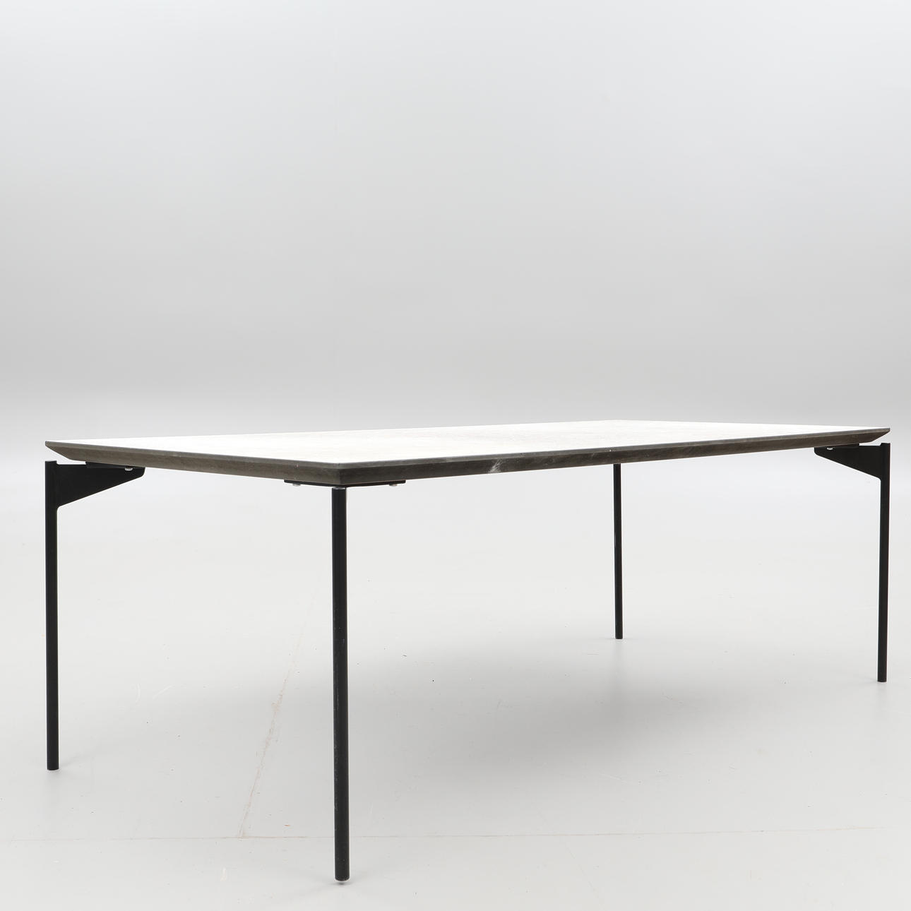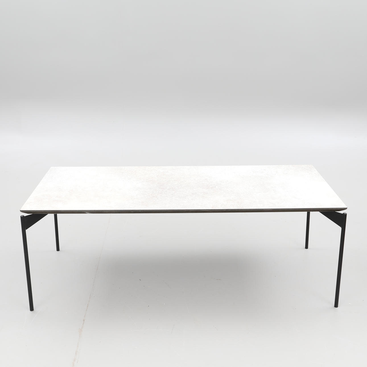 Livorno coffee table made in so-called gray concrete laminate/ black metal legs from Norwegian Kleppe Dimensions approx. 60 x 130 cm, height approx. 45 cm.