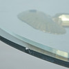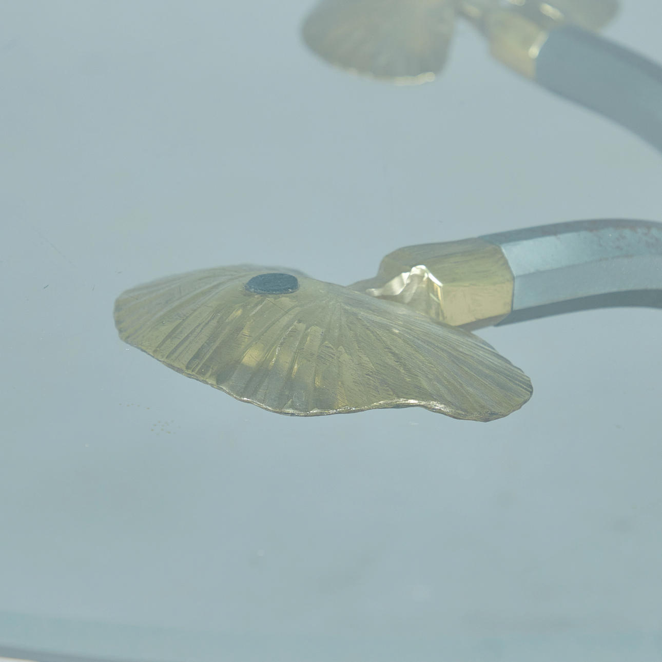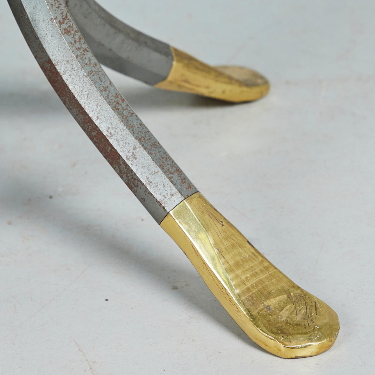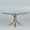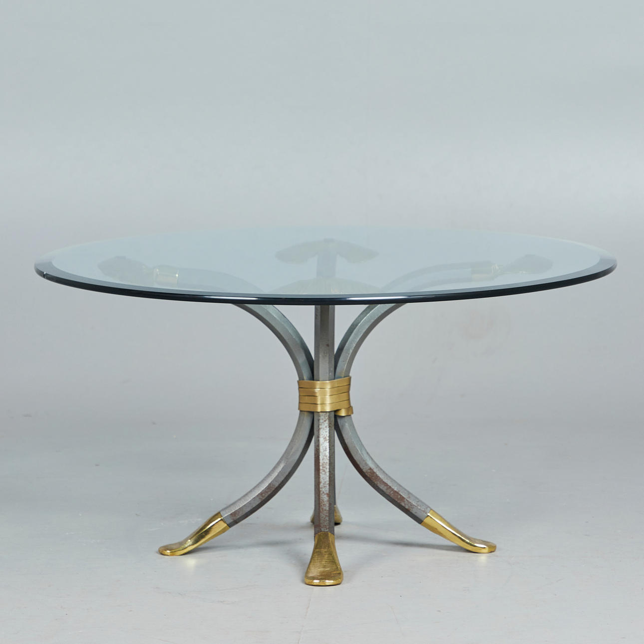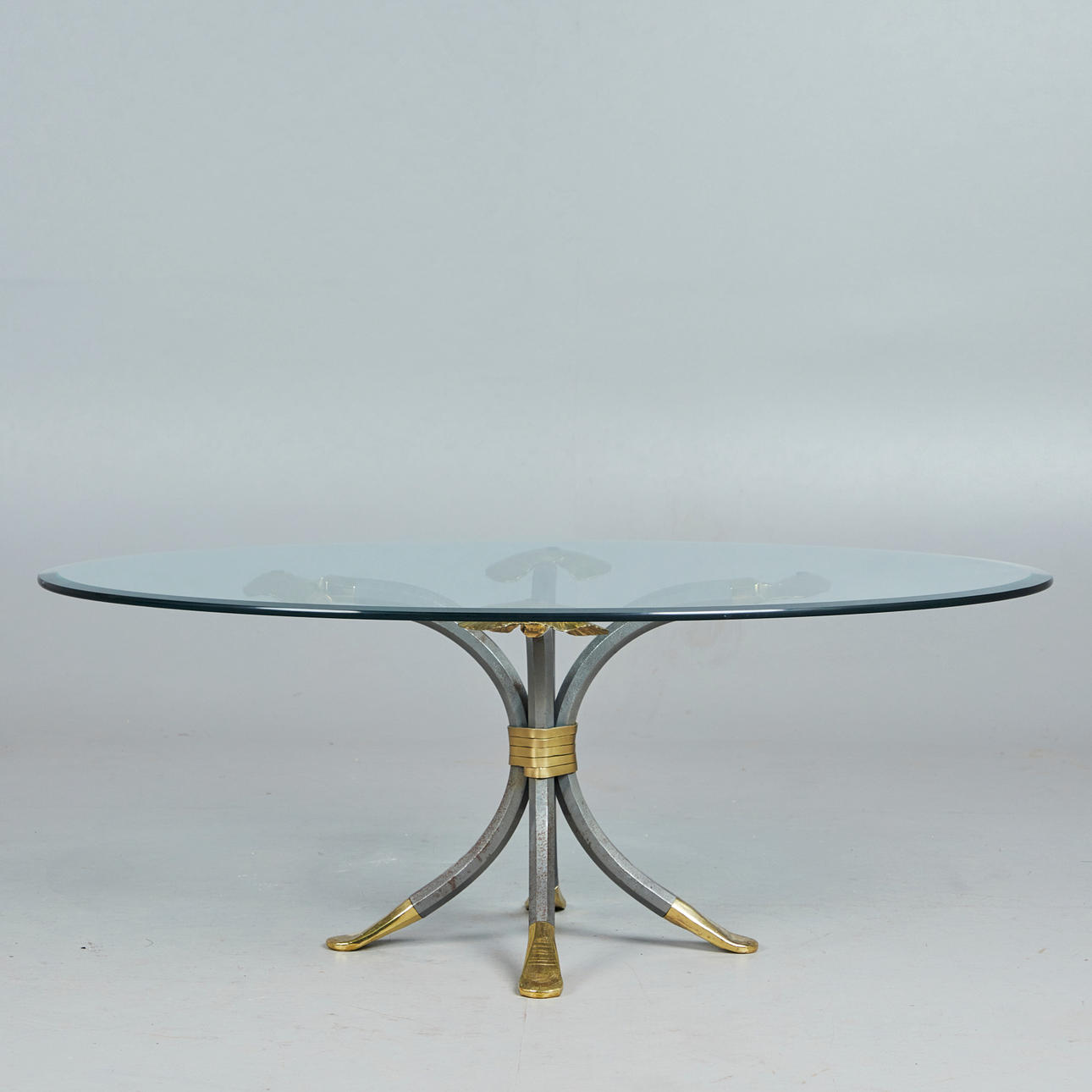 Table / coffee table, brass, steel, glass, 1980s. Coffee table with a sculptural brass and steel base and a loose, oval glass top, H.45cm, L.119cm, W.87cm.