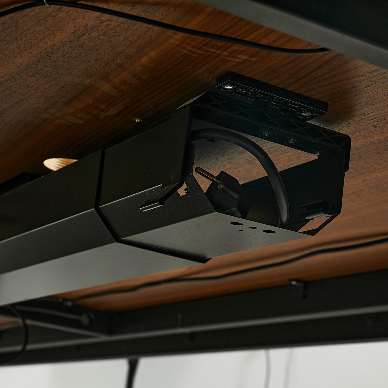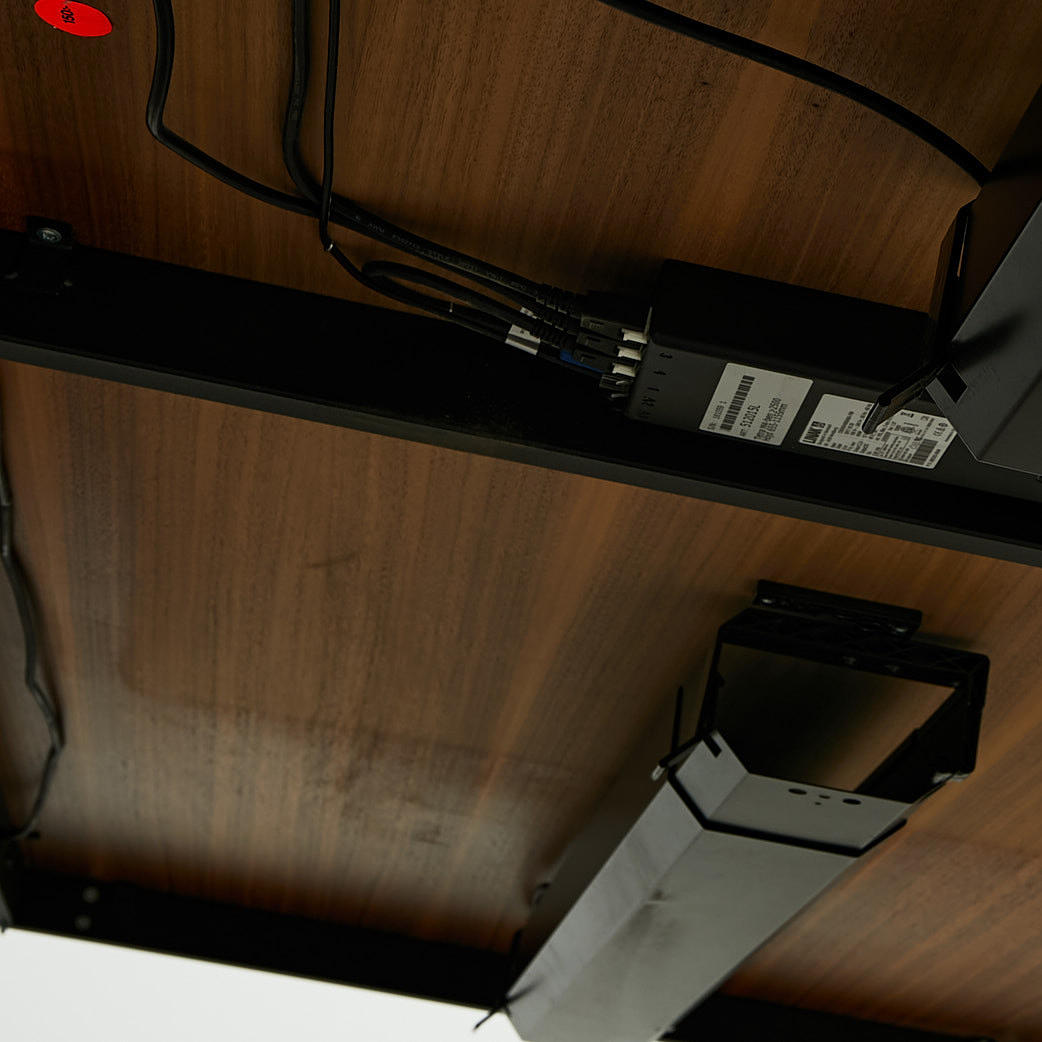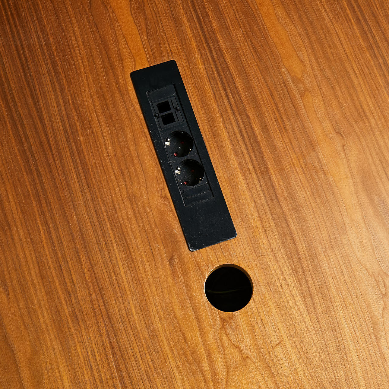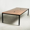 2103033. CONFERENCE TABLE, walnut, holes for cords, cord housing underneath, height and adjustable.