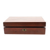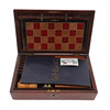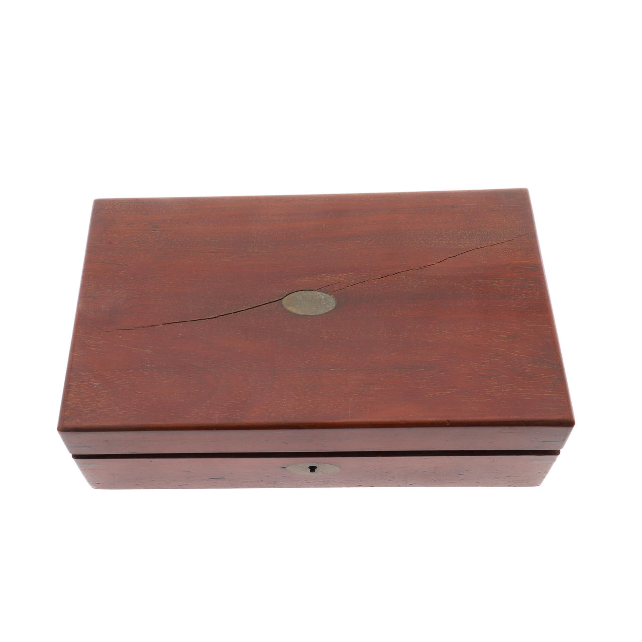 the hinged cover with a four fold-out printed The Steeple Chase game on one side, morocco leather backgammon and chequer board on the other, the fitted divided interior containing a mixture of original and later games including four painted lead steeple chasers, originally there would have been six, turned and carved wooden chess set and draughts, one half natural, the other ebonised, bone and ebony dominoes, three bone dice, dice shaker, marbles, counters, crib board, solitaire board, four Bezique markers, the box 34cm x 20.5cm x 10cm, with two keys.