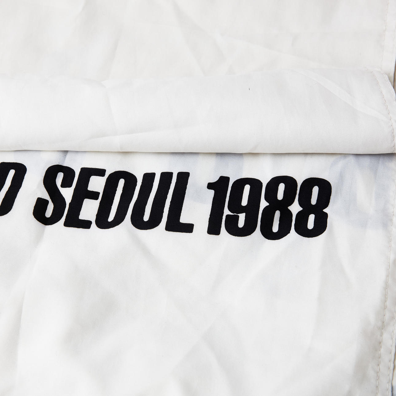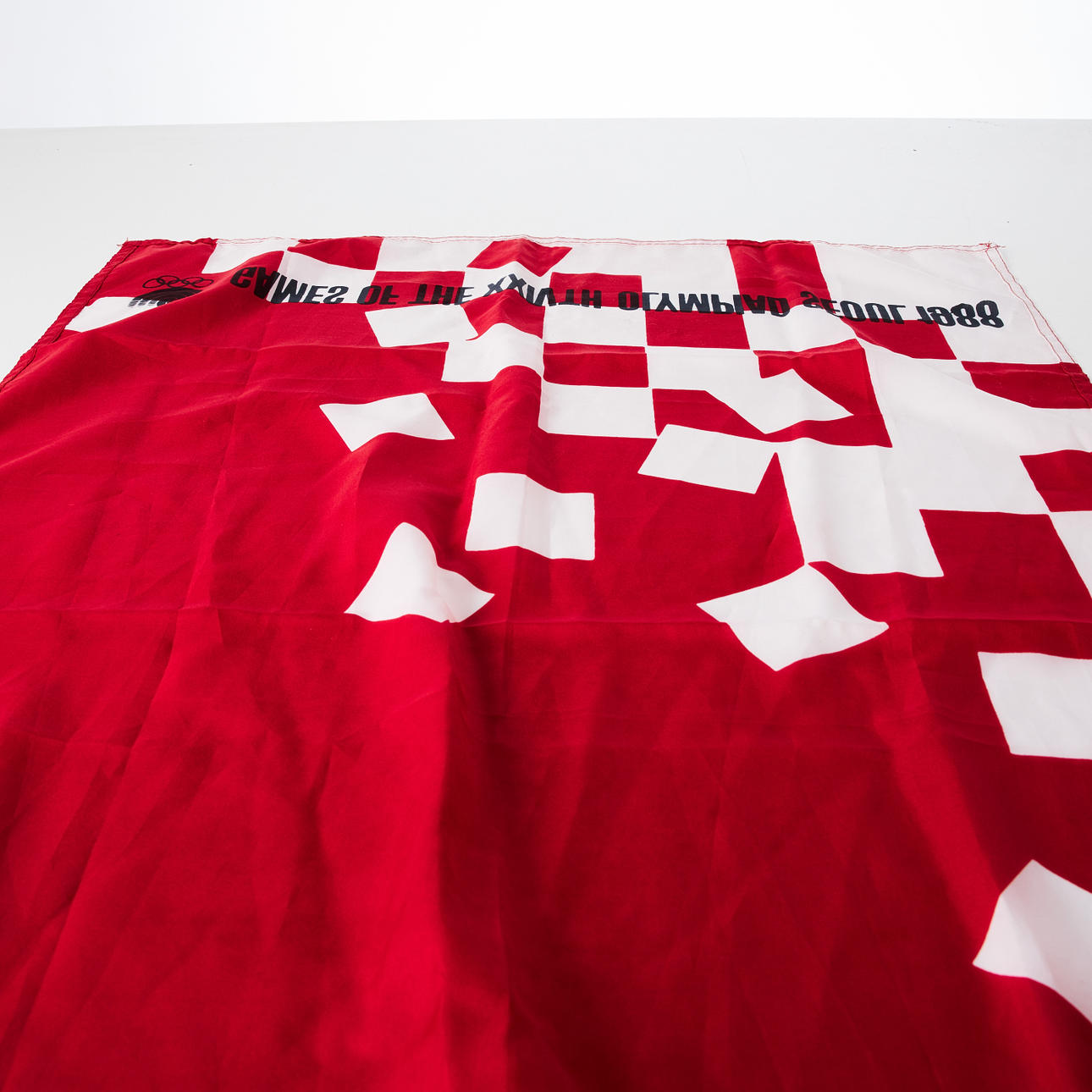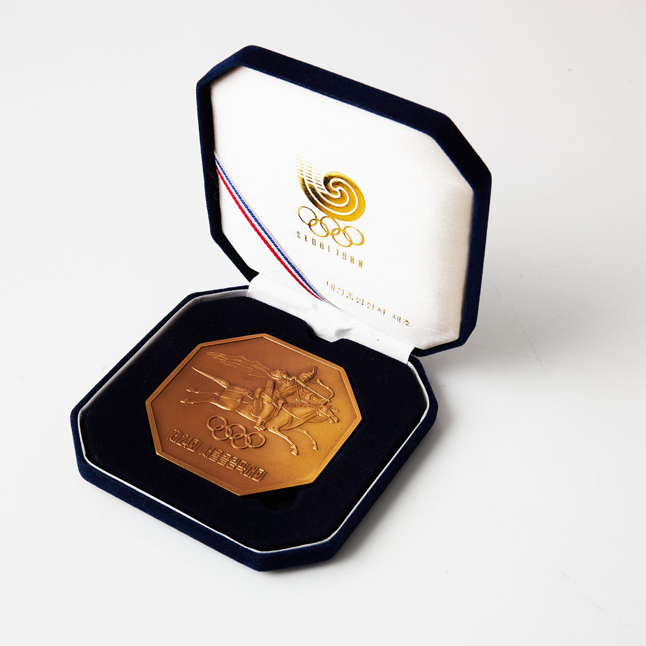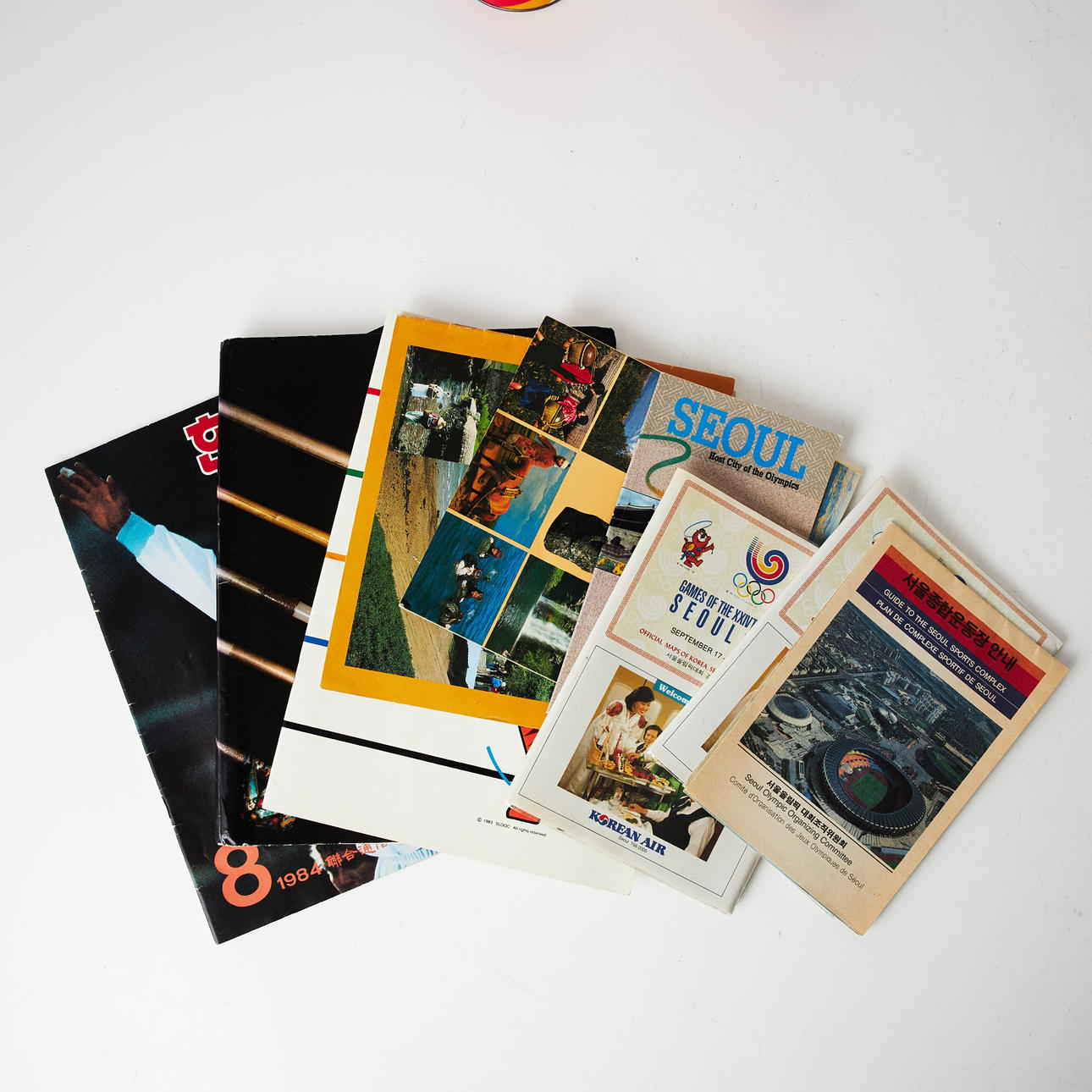Consisting of 7 Olympic tickets, seat map (Seating Plan), official Olympic mascot "Hodori" with original box, 9 brooches (badgers, motifs of various Olympic disciplines), 4 pins for MBC (South Korea's privately owned TV channel), 3 Olympic -pins, commemorative bronze plaque, 2 South Korean information books (Travel Information and Travel Manual, Donald Duck in Korea (pocket edition 1988), Olympic Map, 5 tourist folders, 2 street banners red/white or polychrome against white background, 2 Korean totem poles in sculpted wood (height approx. 30.5 cm), collector's plate for Korean Air, posters 18+10 pcs with motifs from the various sports and cultural motifs from South Korea, 1 official Olympic poster.