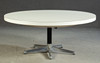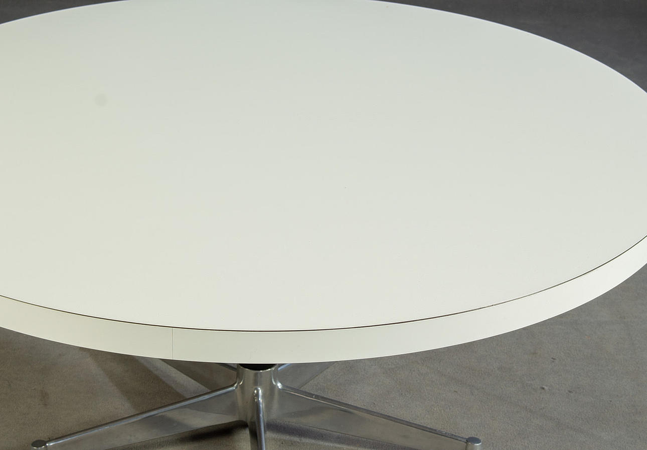 5-star base made of polished aluminium, round, white laminate table top with white edging. H. 50 cm, Ø 108 cm.
