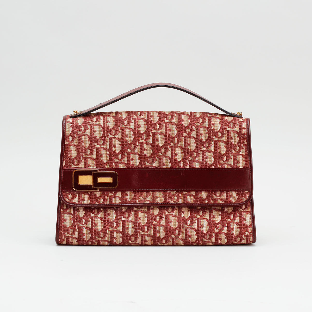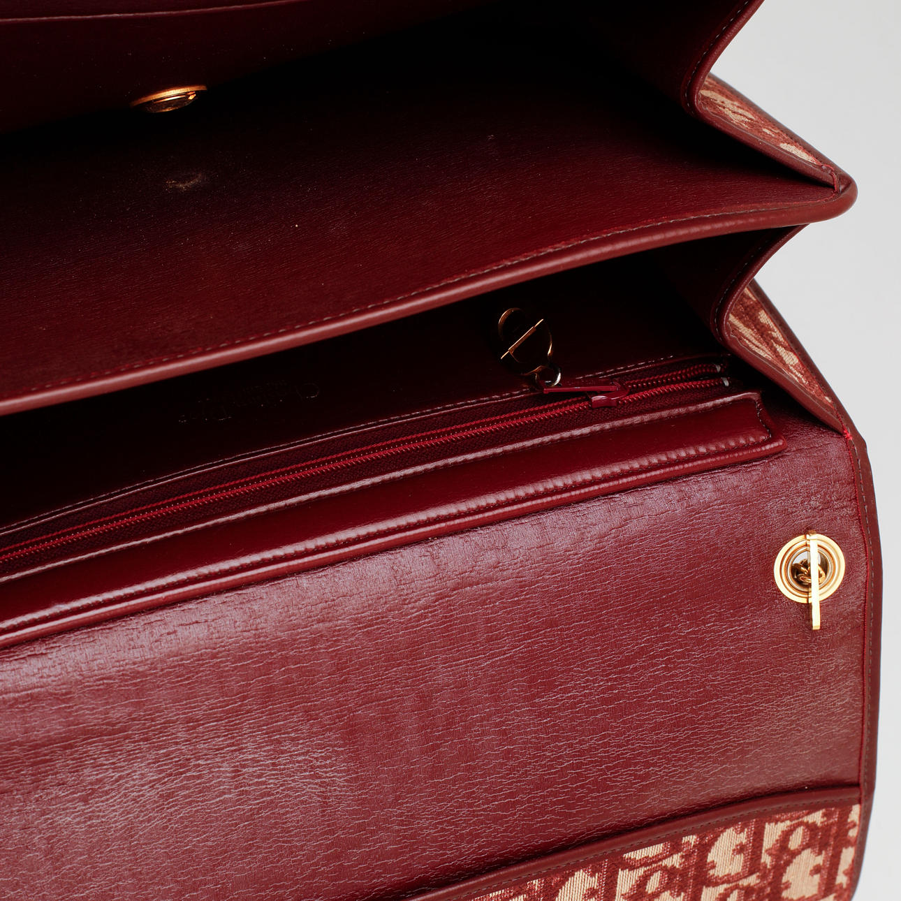 Logo patterned canvas. Hand/shoulder bag. Details of leather color Burgundy. Leather lined. Marked "Christian MADE IN FRANCE". 2 compartments, one inner pocket with zipper.