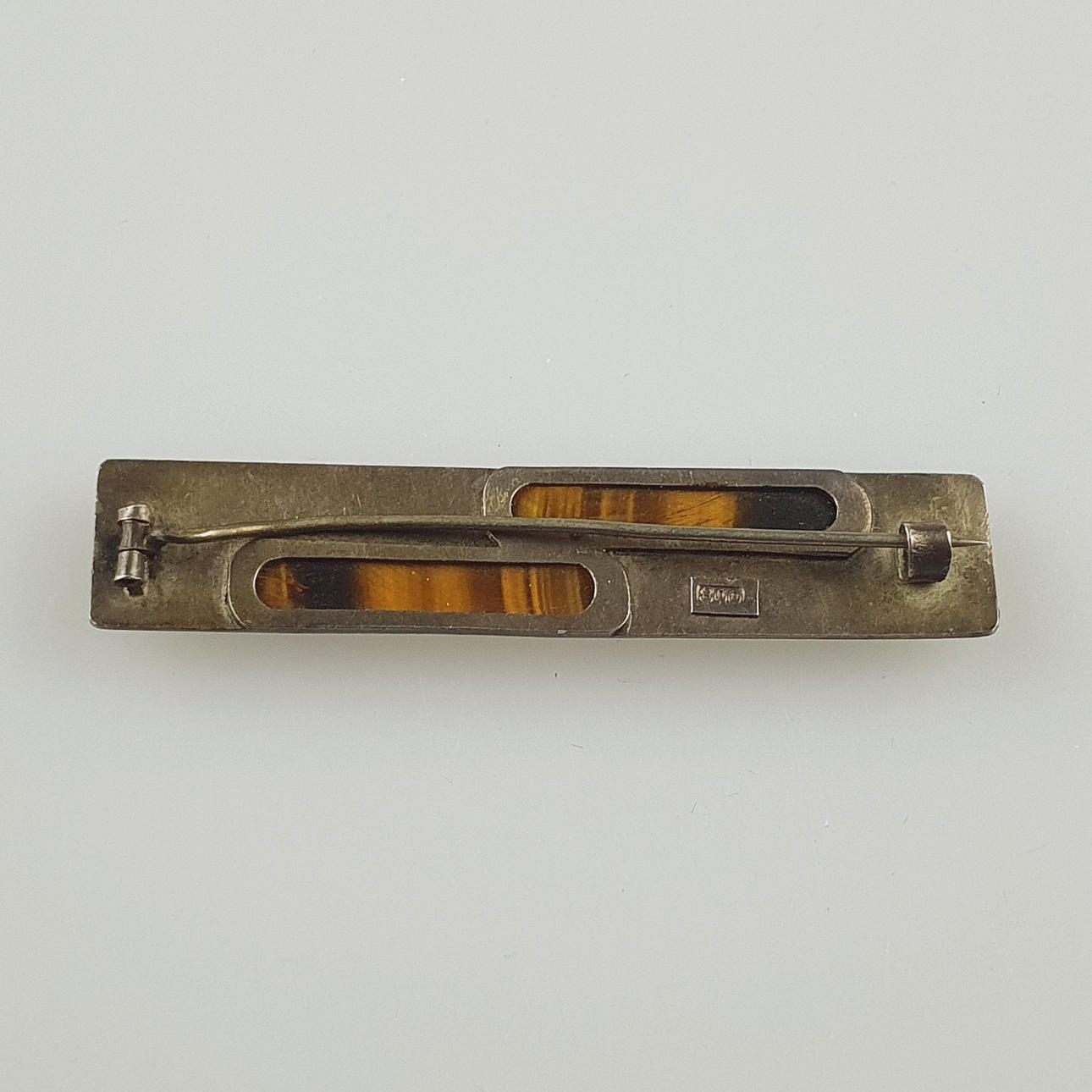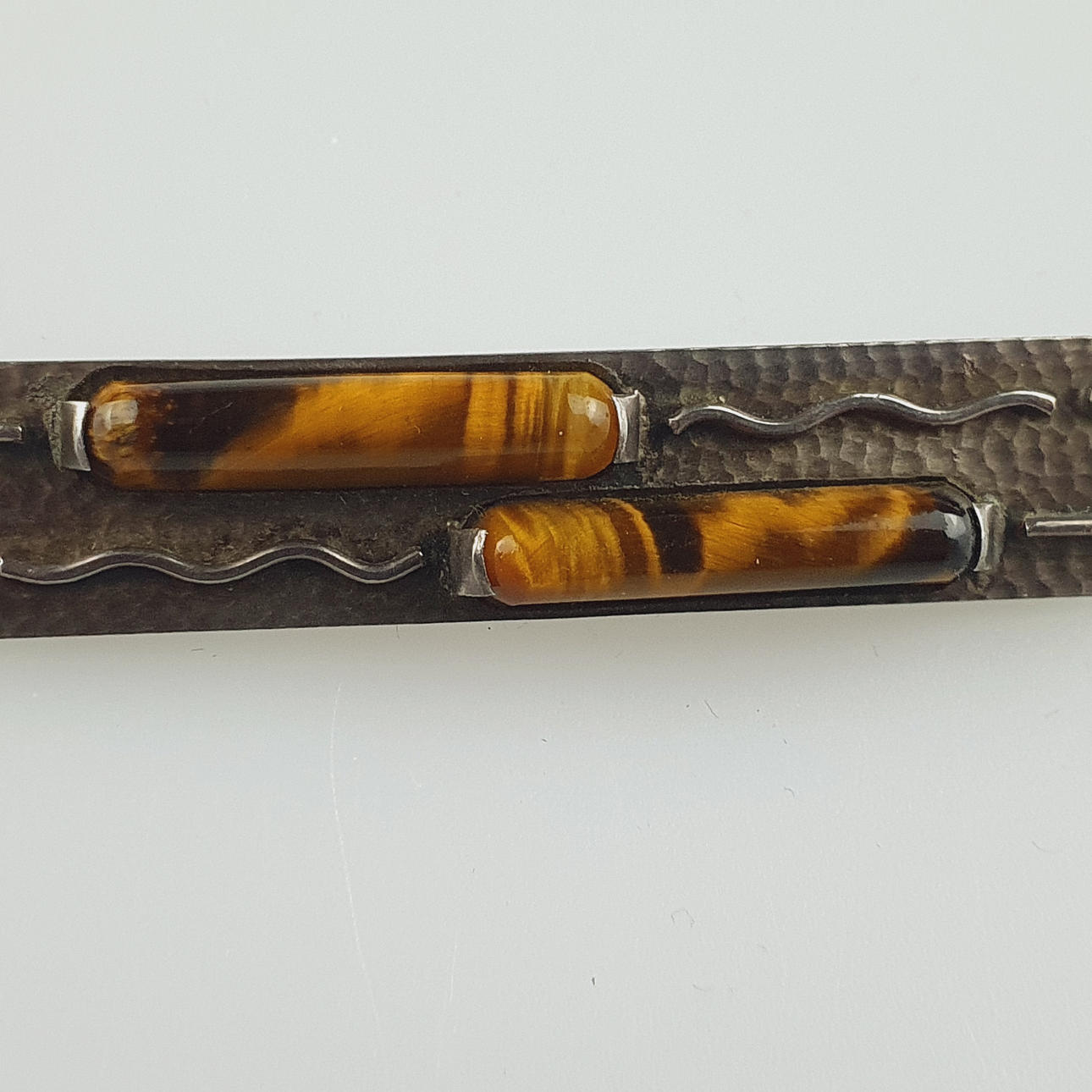 Unusual brooch, hallmarked, set with 2 elongated tiger eye cabochons on a martelé background, approx. 6.5 x 1.3 cm, approx. 9.21 g.