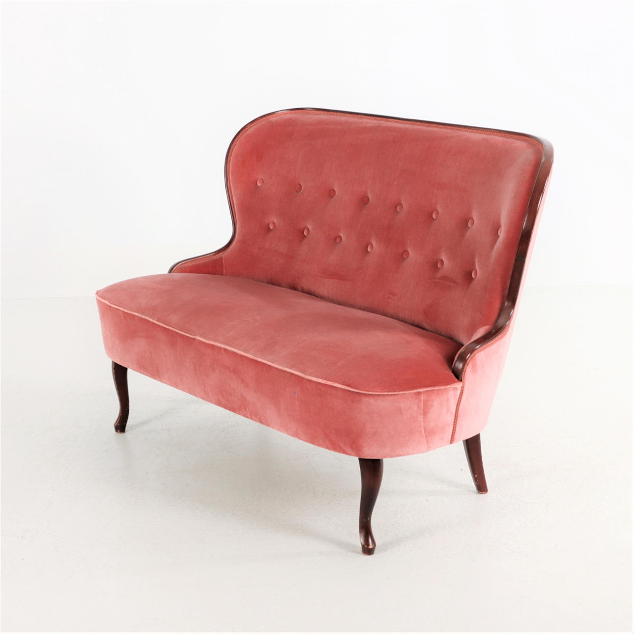 Sofa, smaller, fully upholstered with frame in stained wood. Second half of the 20th century.