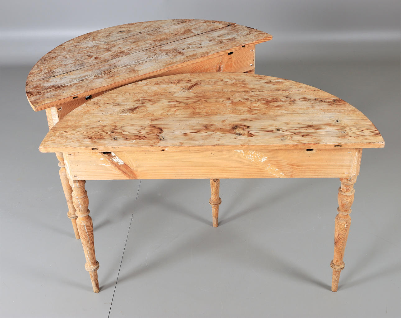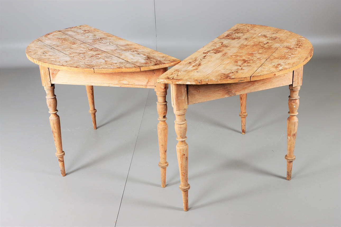 1 pair of half-moon tables, wall tables, dining tables. Unpainted pine. Sweden, the latter part of the 19th century.