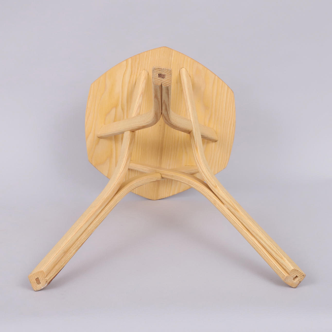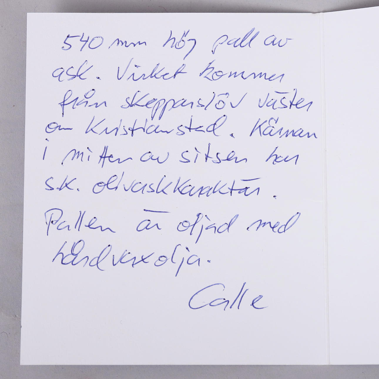 Stool in solid oiled ash on trefoil legs, connected legs, designed and manufactured by the cabinetmaker, Calle Warfvinge. Included handwritten card with information from the cabinetmaker himself. Height approx. 54 cm.